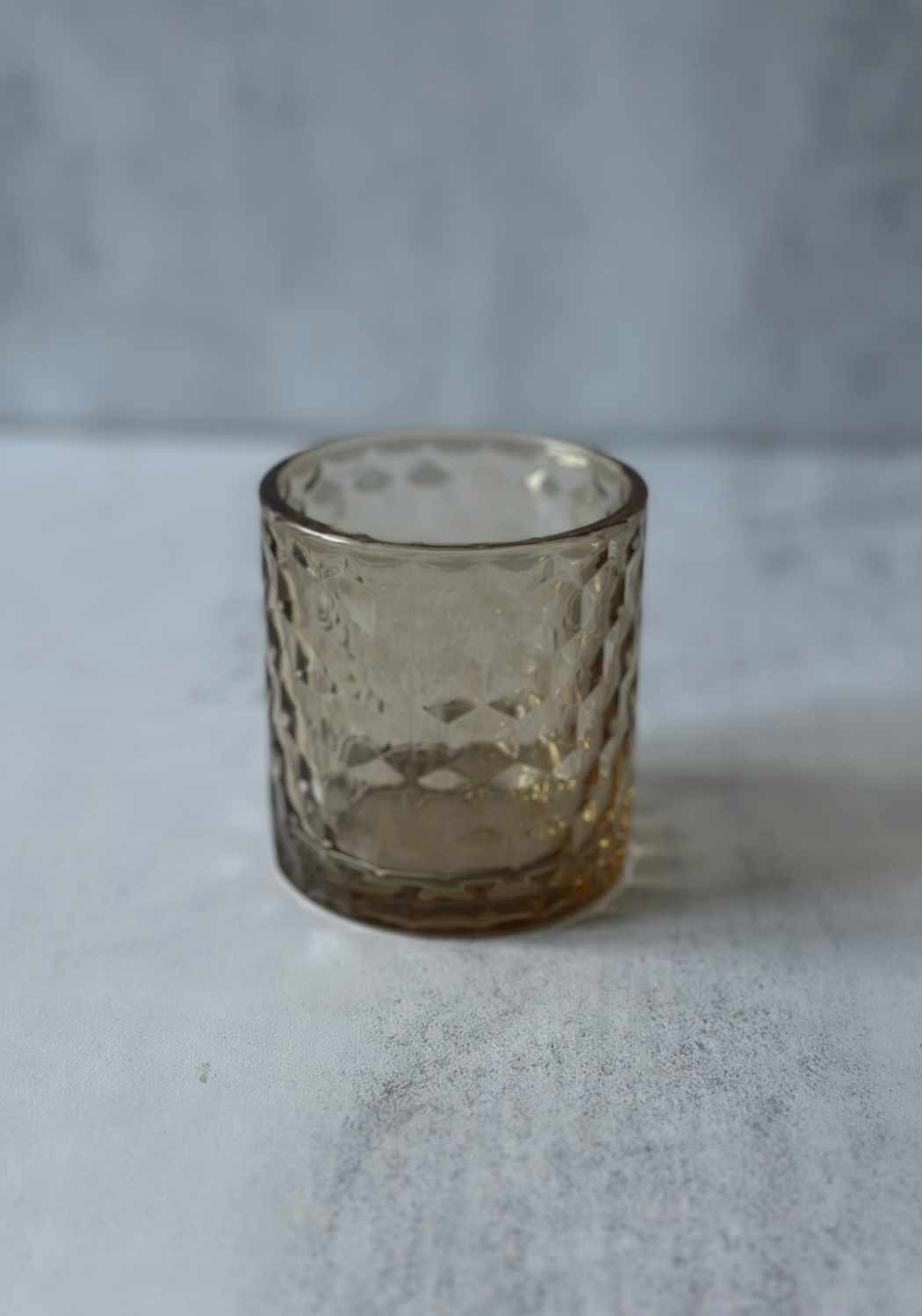 Stellen Sie ein Teelicht hinein und erfüllen Sie Ihr Zuhause mit dem warmen Schein von Kerzenlicht. Das Glas besteht aus bernsteinfarbenem Glas mit einer hübschen geometrischen Grübchen-Oberfläche.