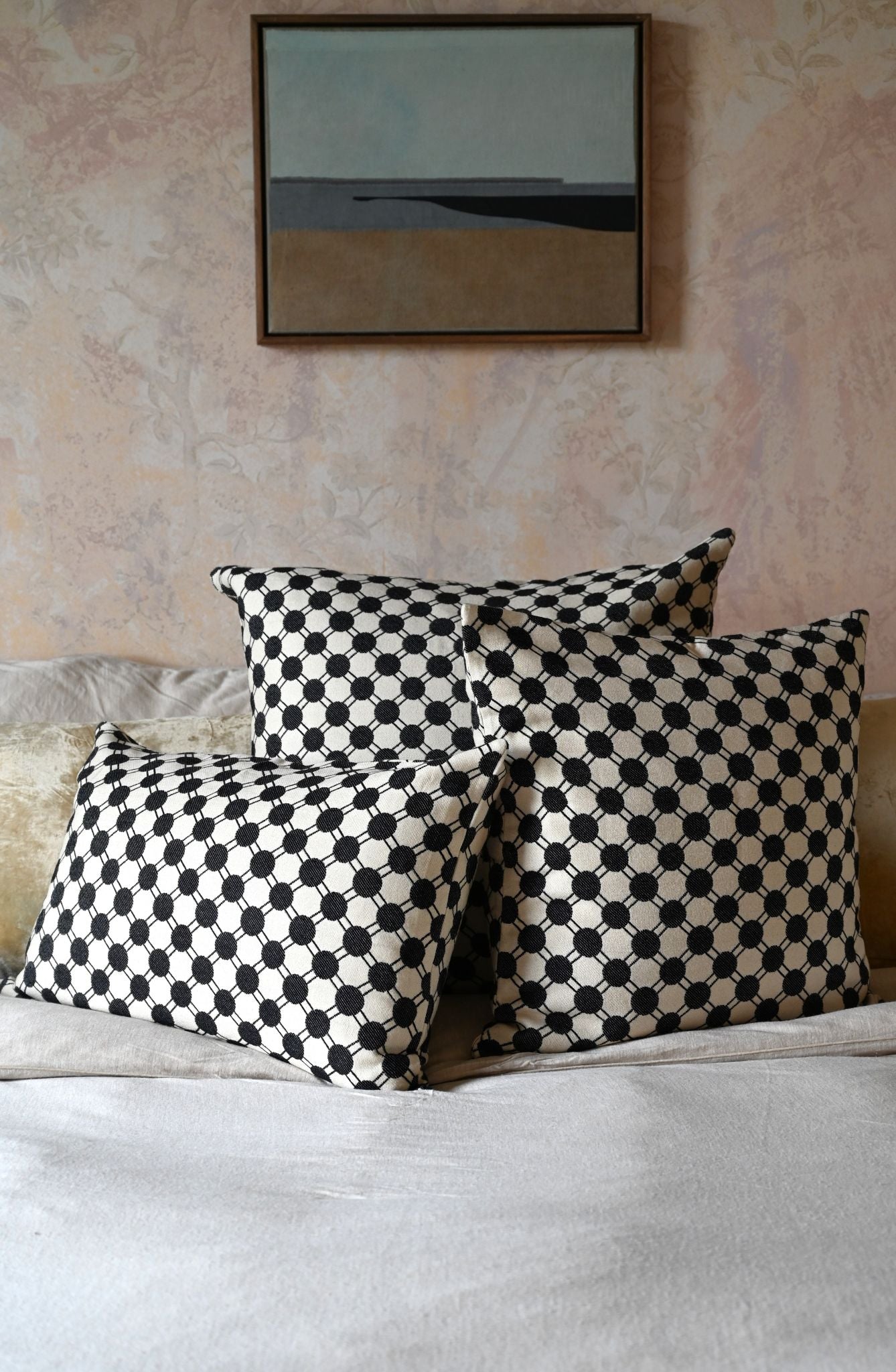 The design features an interconnected pattern of dots and lines that remind us of Japanese architecture and has the unique ability to both stand out and be the ideal backdrop for even more boldly patterned cushions.