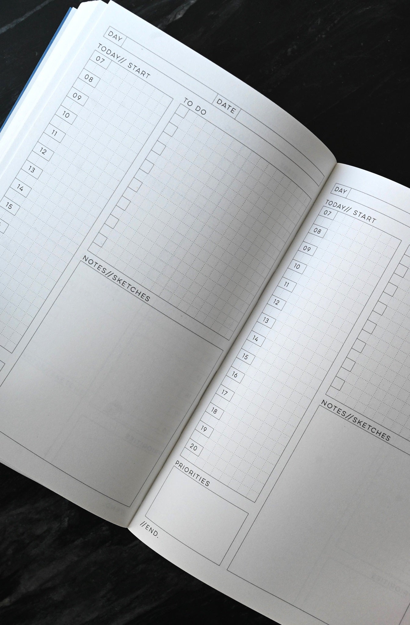 Enthält eine Tagesseite pro Seite für die Wochentage und eine in zwei Hälften geteilte Seite für das Wochenende sowie eine spezielle Bindung, sodass das Notizbuch flach auf dem Tisch liegt.