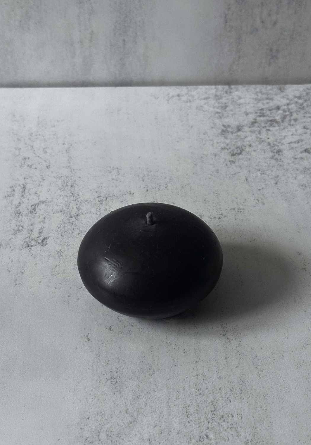 A moody round black candle handmade from natural beeswax in an inky colour that looks like someone has dropped a black liquorice sweet. Beeswax is renowned for its clean-burning properties and lack of toxins emitted and this unusually shaped candle is ideal as both a work of art and a sustainable candle option that promotes natural living.