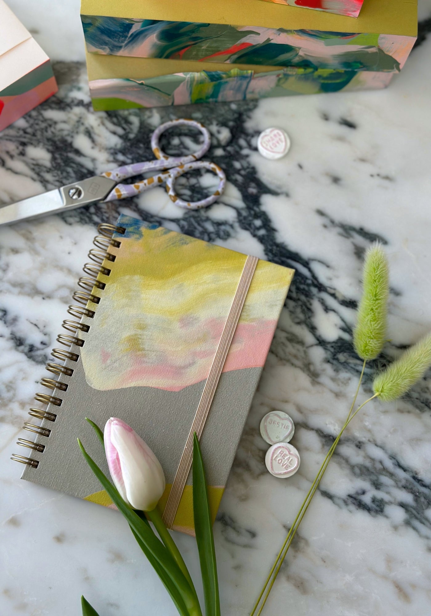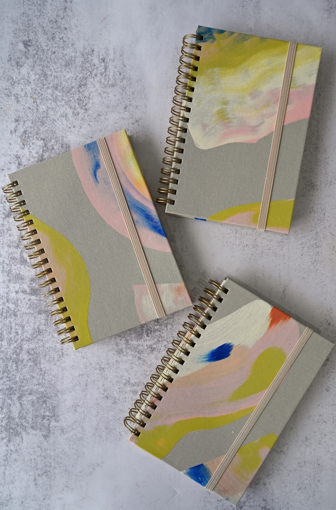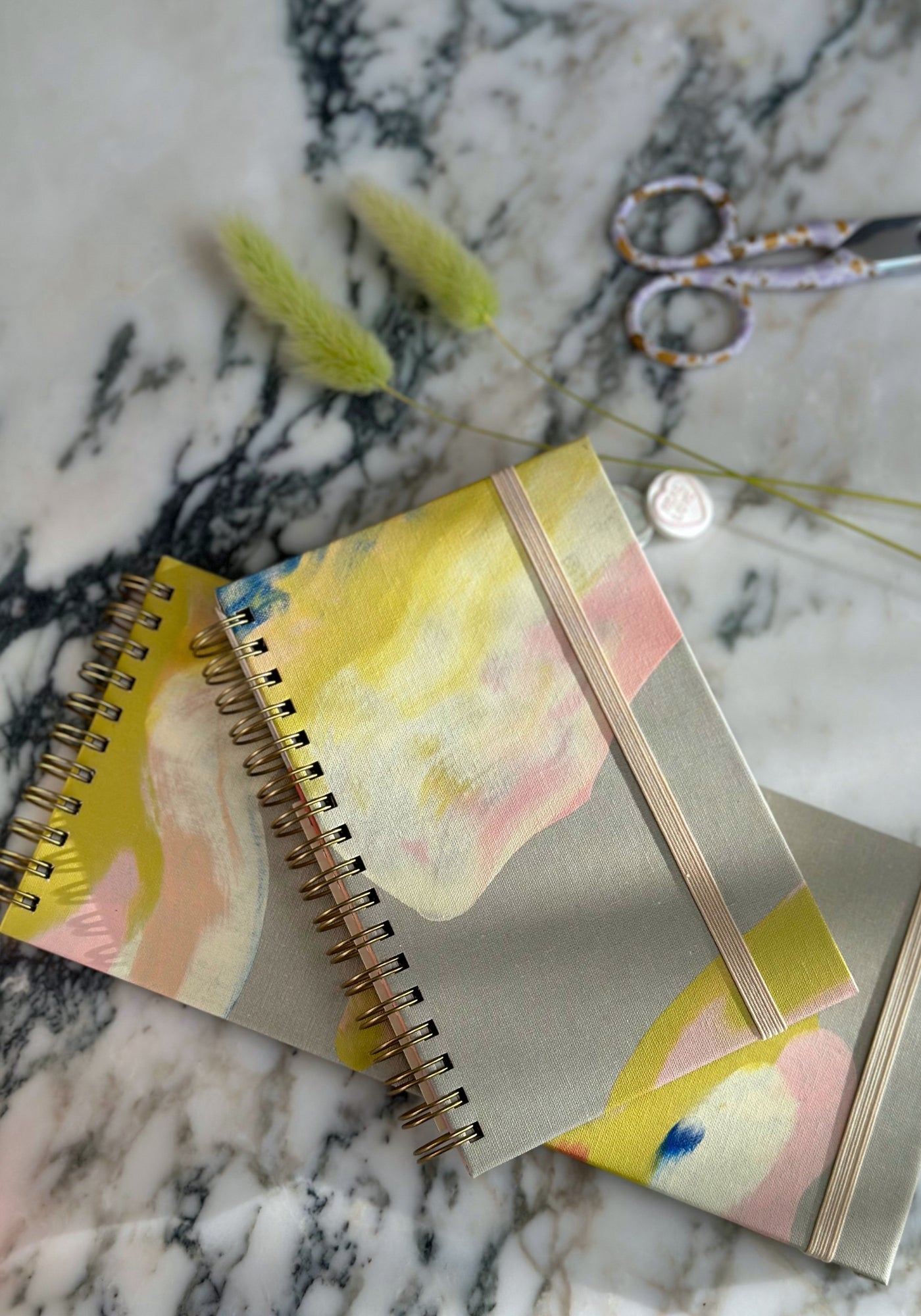 This luxury notebook is made from turned edge cloth covers painted by hand in Mediterranean-inspired swathes of citrus yellow and beachy pinks. Each one is 120 pages of ridiculously thick and luxurious 103gsm paper bound in a a durable cloth cover with a contrasting elasticated band and clear pockets inside for storing notes. These marbled look journals aren't your average notebook - they're beautifully made works of art designed to inspire you to create your best work.
