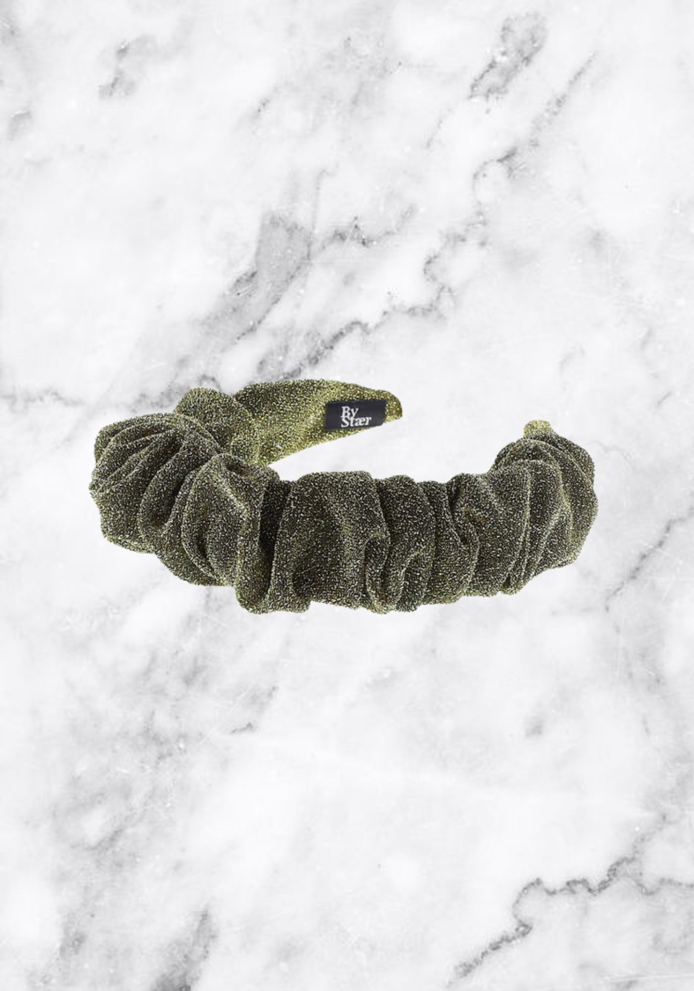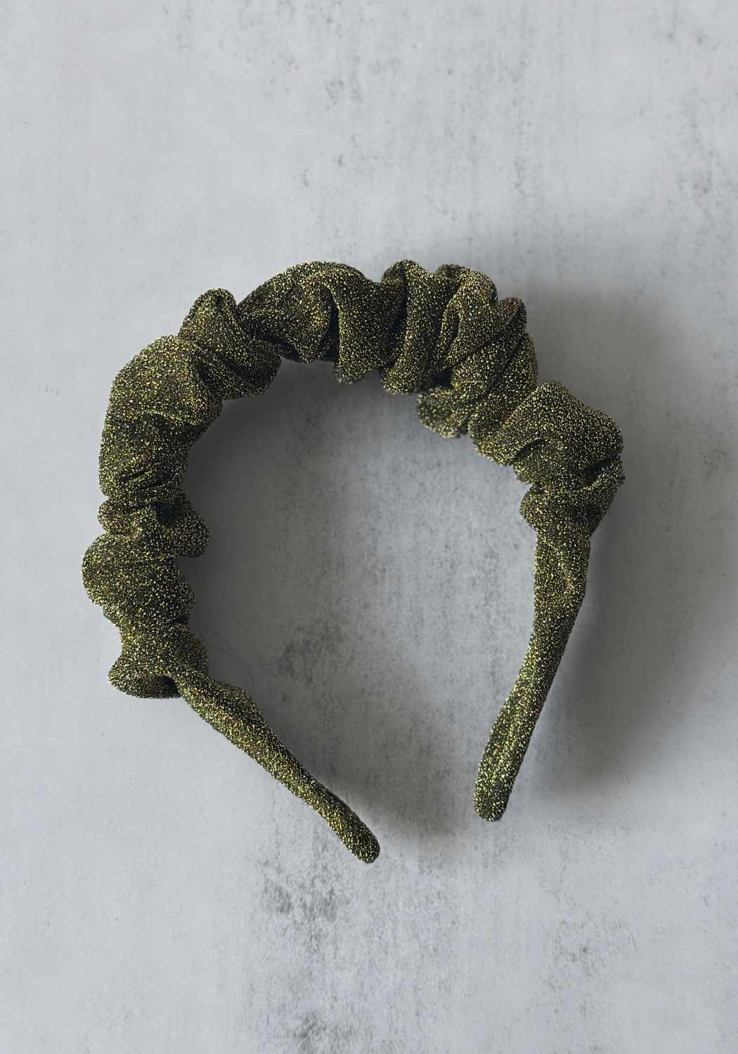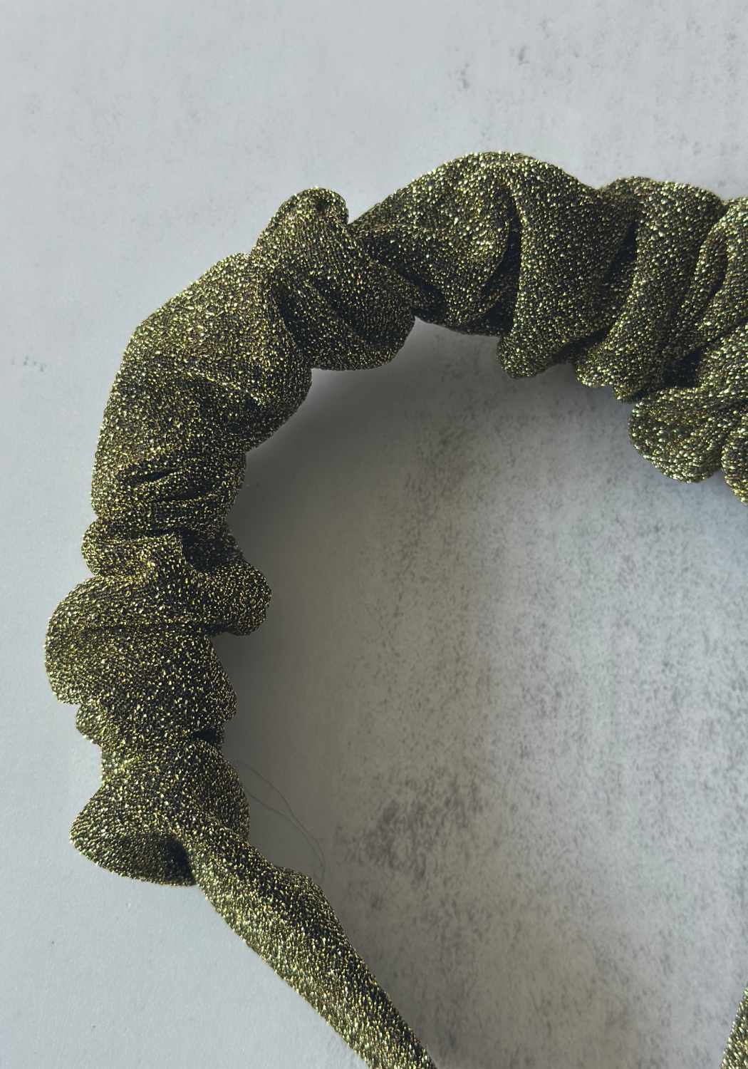 This isn't your dull school headband, this elevated hair accessory is the finishing touch for your outfit with it's padded inner and a scrunchie style outer in a shimmering gold glitter.