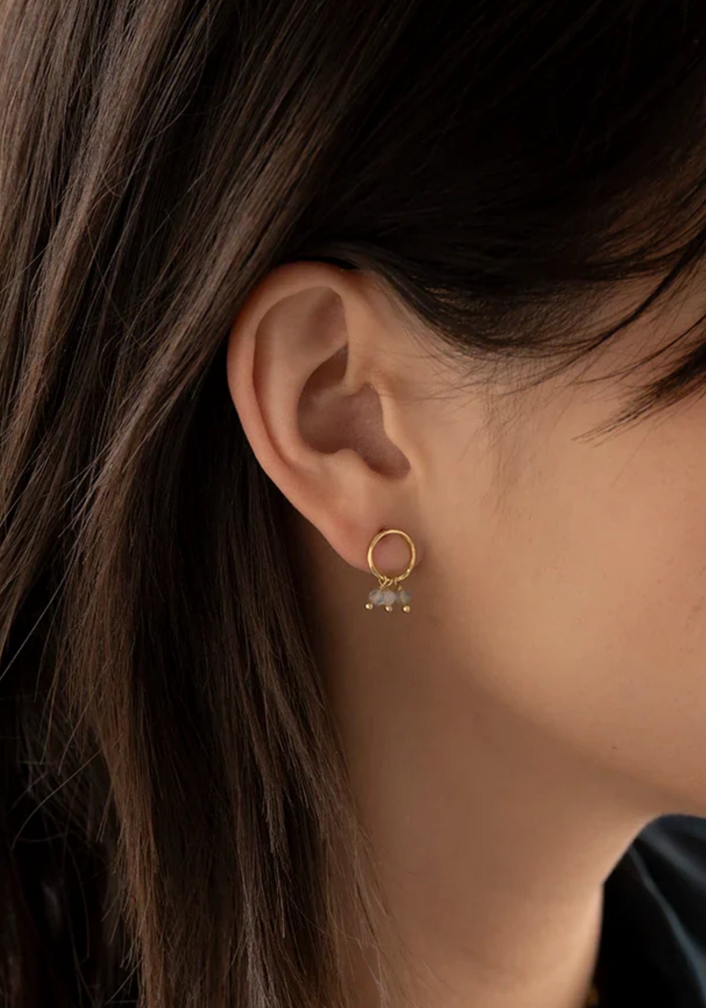 Harness the power of moonstone and labradorite for enhanced focus and strength with these gemstone earrings featuring two moonstone gemstones and a single labradorite stone strung on a perfect circle of gold-plated brass.