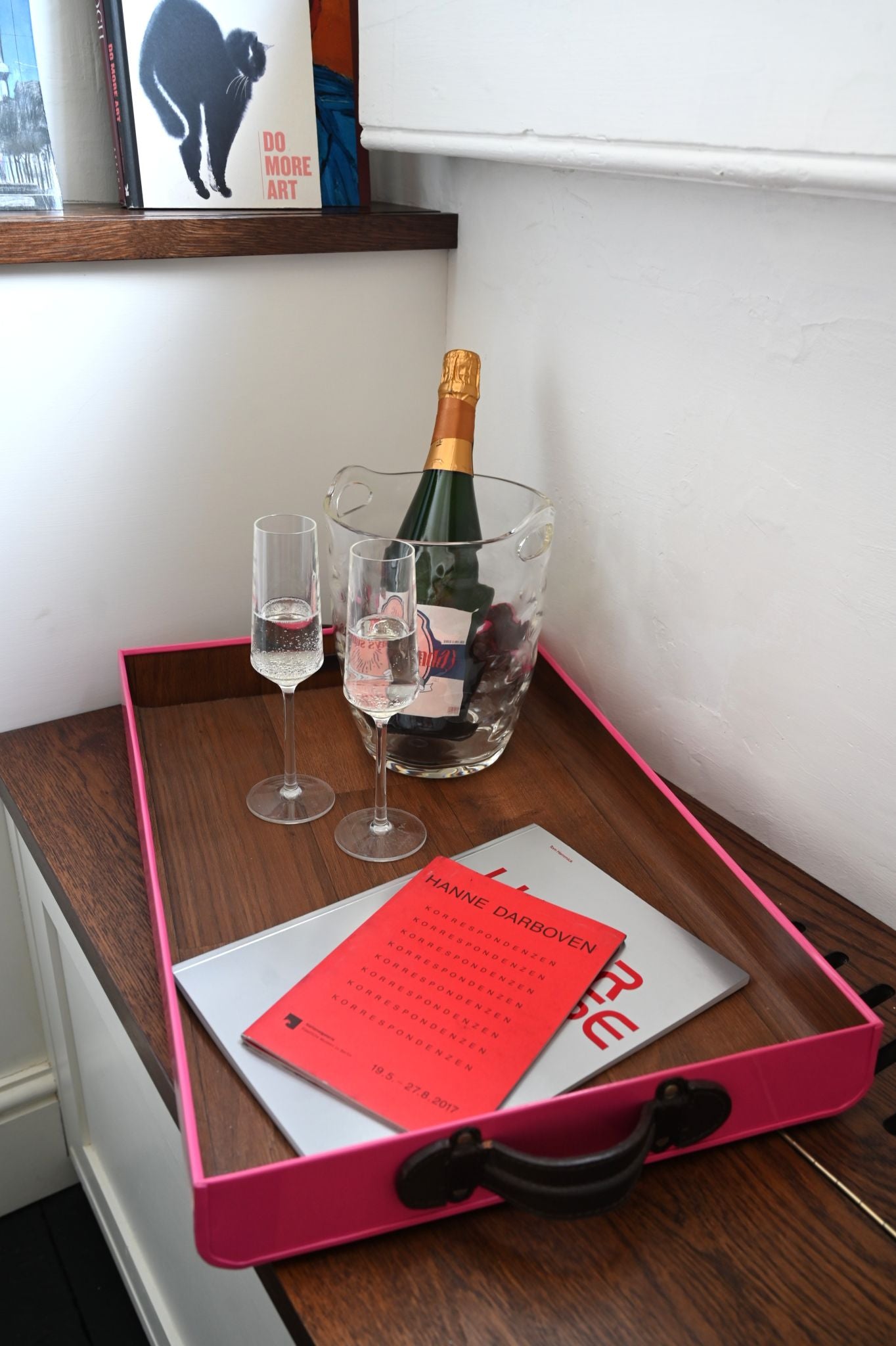 There is no other way to serve breakfast in bed! This large tray is handmade in India by Nappa Dori from sturdy powder coated sheet metal wrapped in a glossy strawberry pink finish, lined with water resistant vinyl to give the appearance of antique wood flooring and finished with metal base studs and supple nappa leather handles for easy carrying.