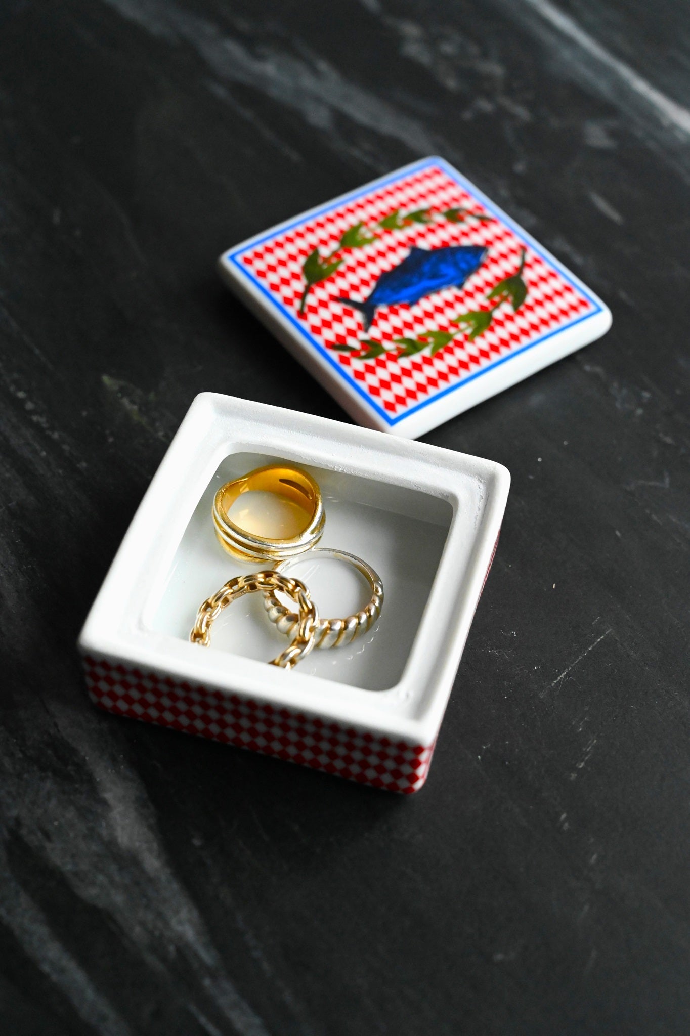 Eine kleine, italienisch inspirierte Schmuckschale mit rotem Gingham-Druck und einem darauf abgebildeten Fisch. Perfekt zur Aufbewahrung Ihrer wertvollsten Ringe, einer oder zwei Halsketten, die Sie lieben, oder sogar Meersalz von der Amalfiküste.
