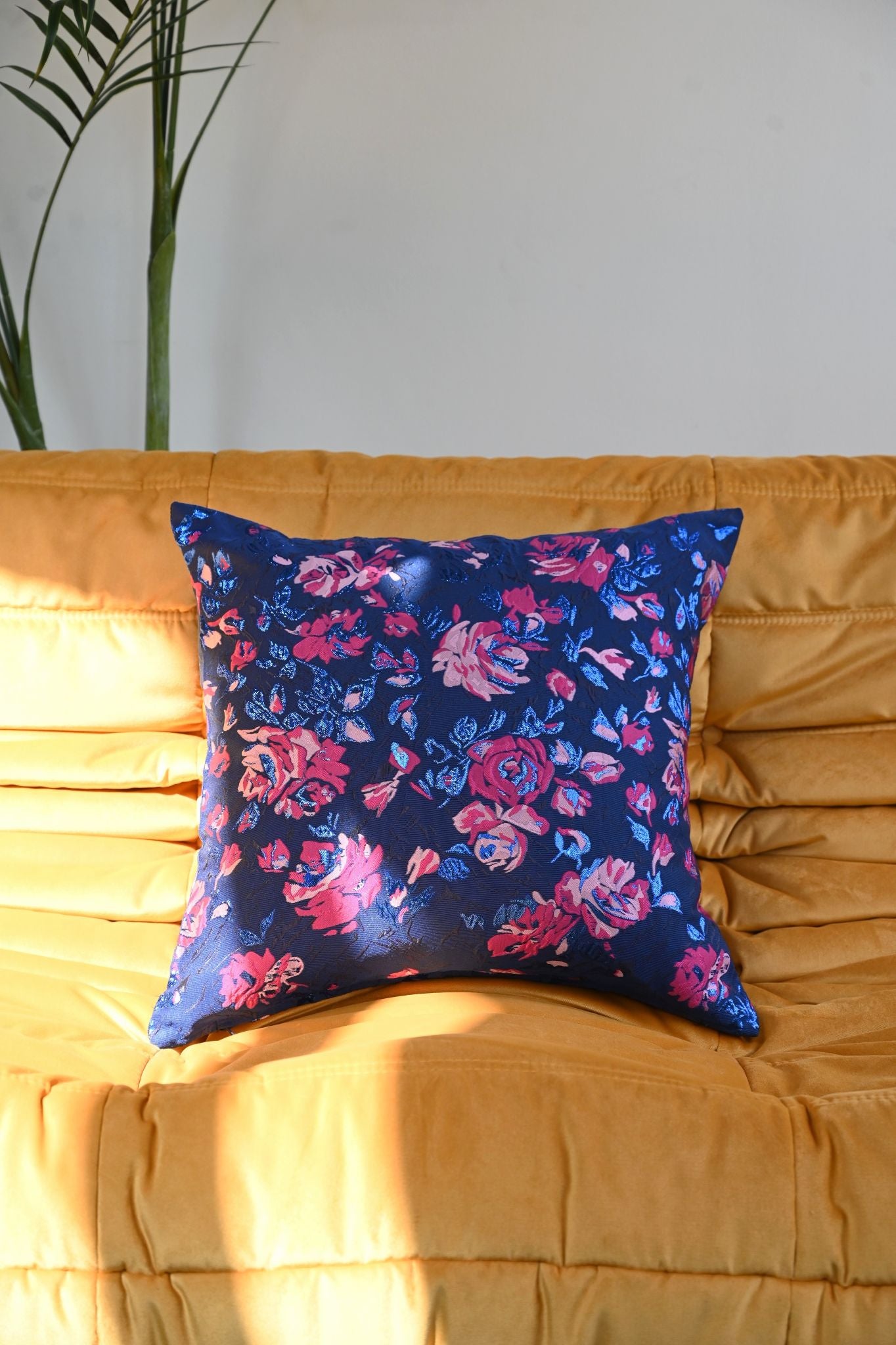 A dark blue moody floral cushion collection with a hint of romance designed by luxury textiles brand Dagny. These silky quilted style cushions feature a deep pink rose pattern and a subtly gold metallic thread woven through the print. For those who love the ornate nature of florals but want a little more gothic in their day to day life.