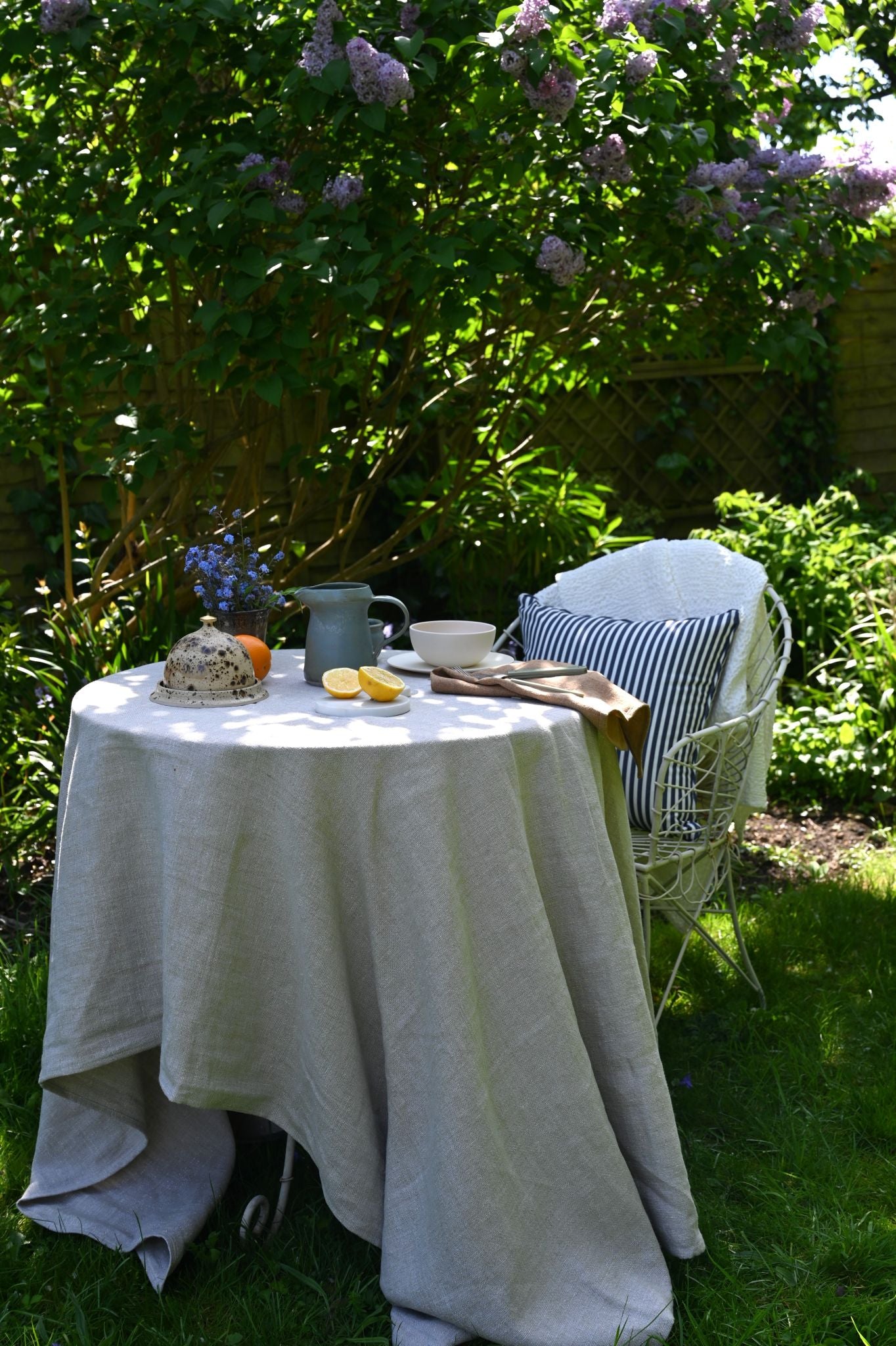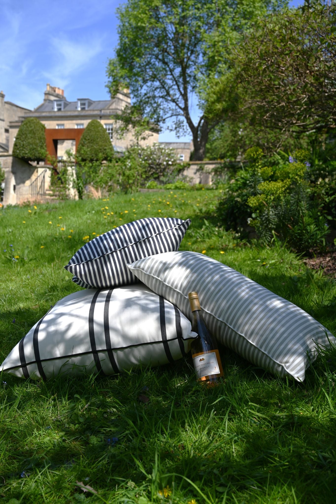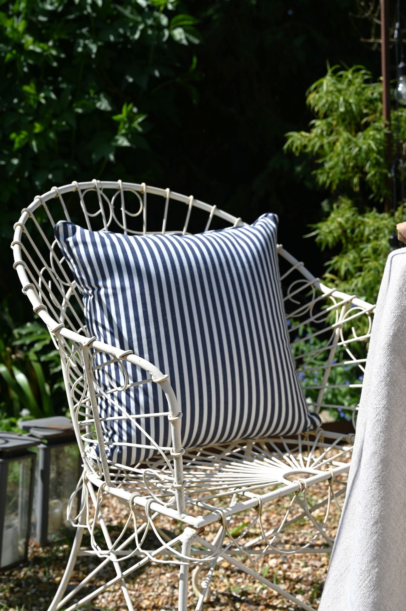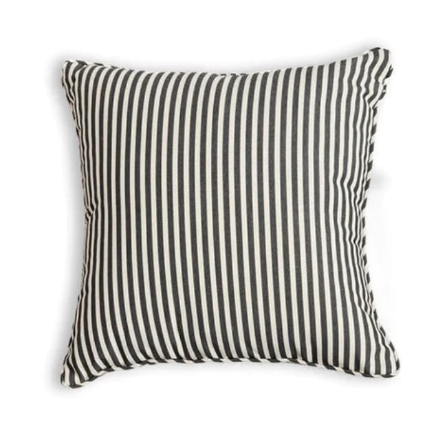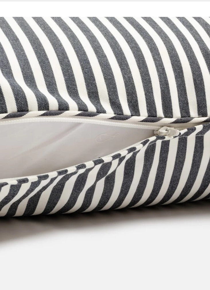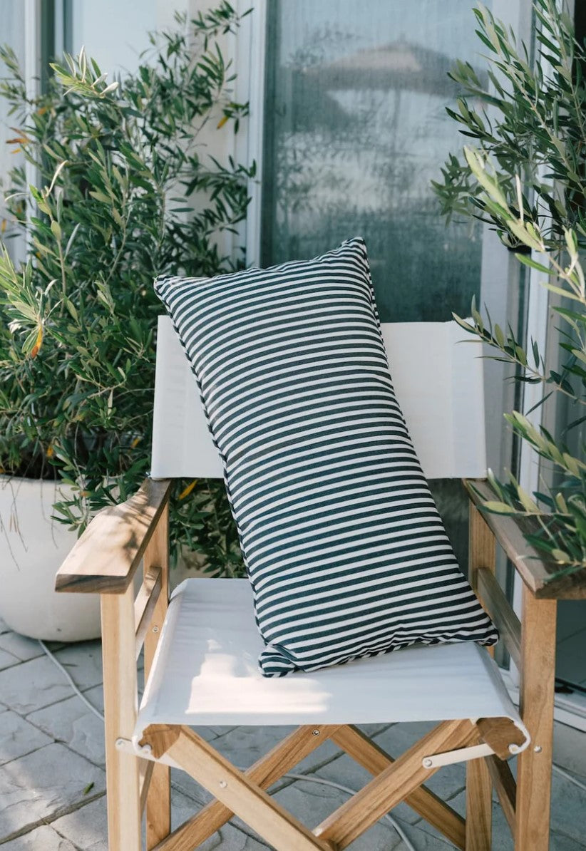 Schaffen Sie den perfekten Ort zum Entspannen mit Indoor-/Outdoor-Kissen von Business & Pleasure, komplett mit einem klassischen bretonischen Streifenmuster in Marineblau, das Sie in sonnige Tage an der französischen Riviera versetzt.