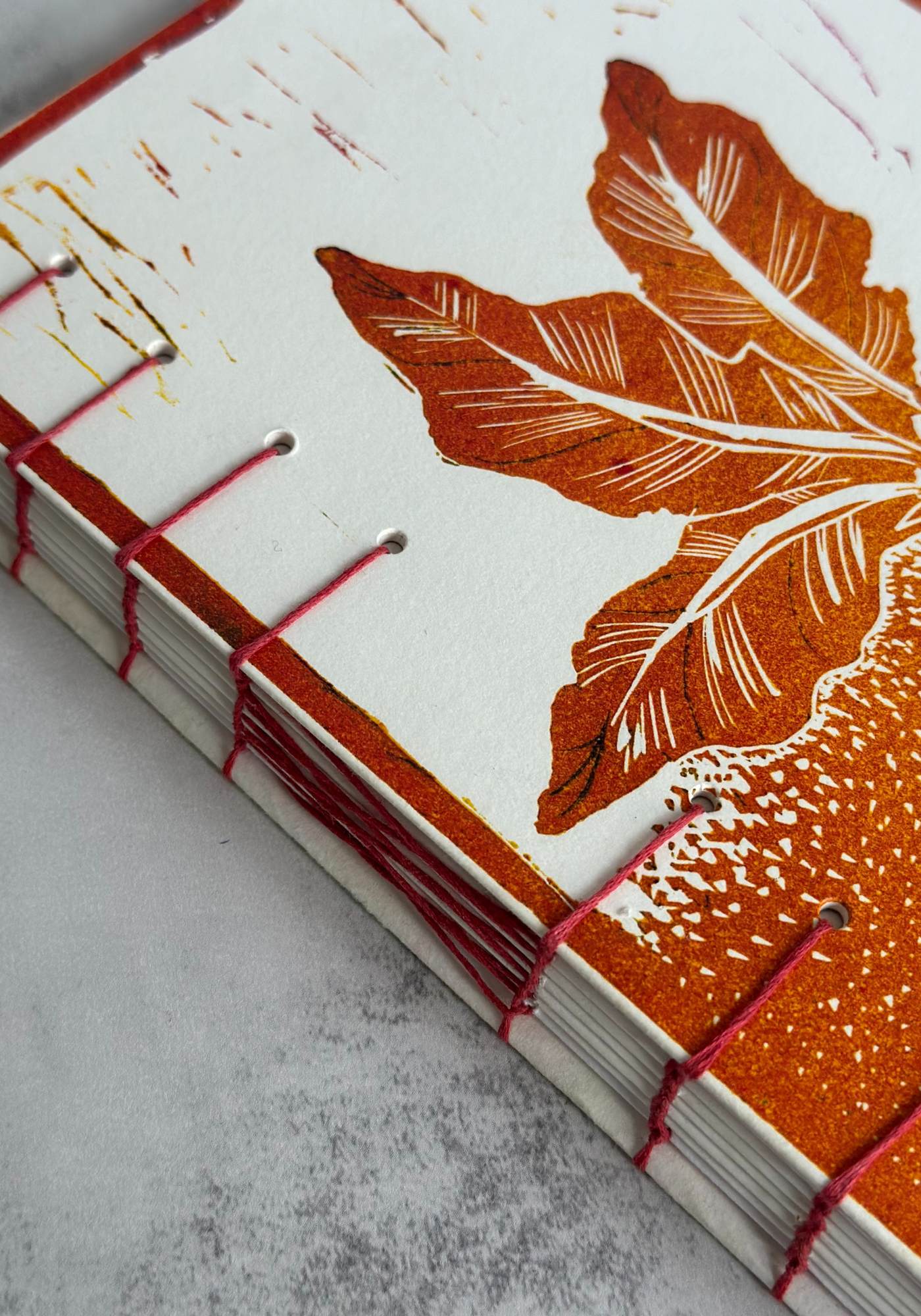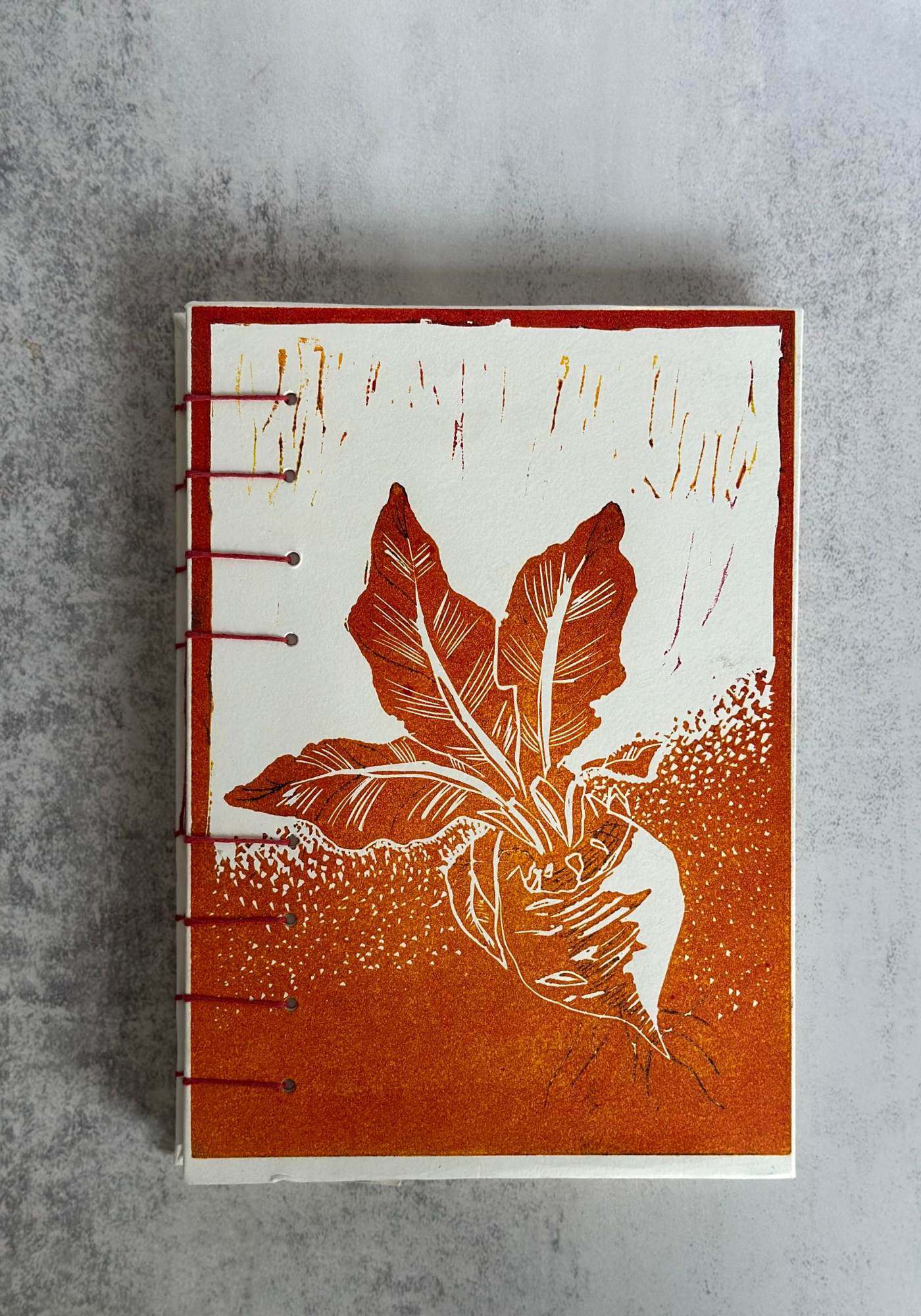 A completely unique notebook beautifully crafted from handmade paper and a lino printed cover by local artist Joanna Beckley and methodically bound by hand using a stitching technique. This artistic journal is ideal for noting down your allotment vegetables progress or serve as the manifestation stationery for your daily writing. You won't find another like this as it's a complete one off and therefore a truly special gift.