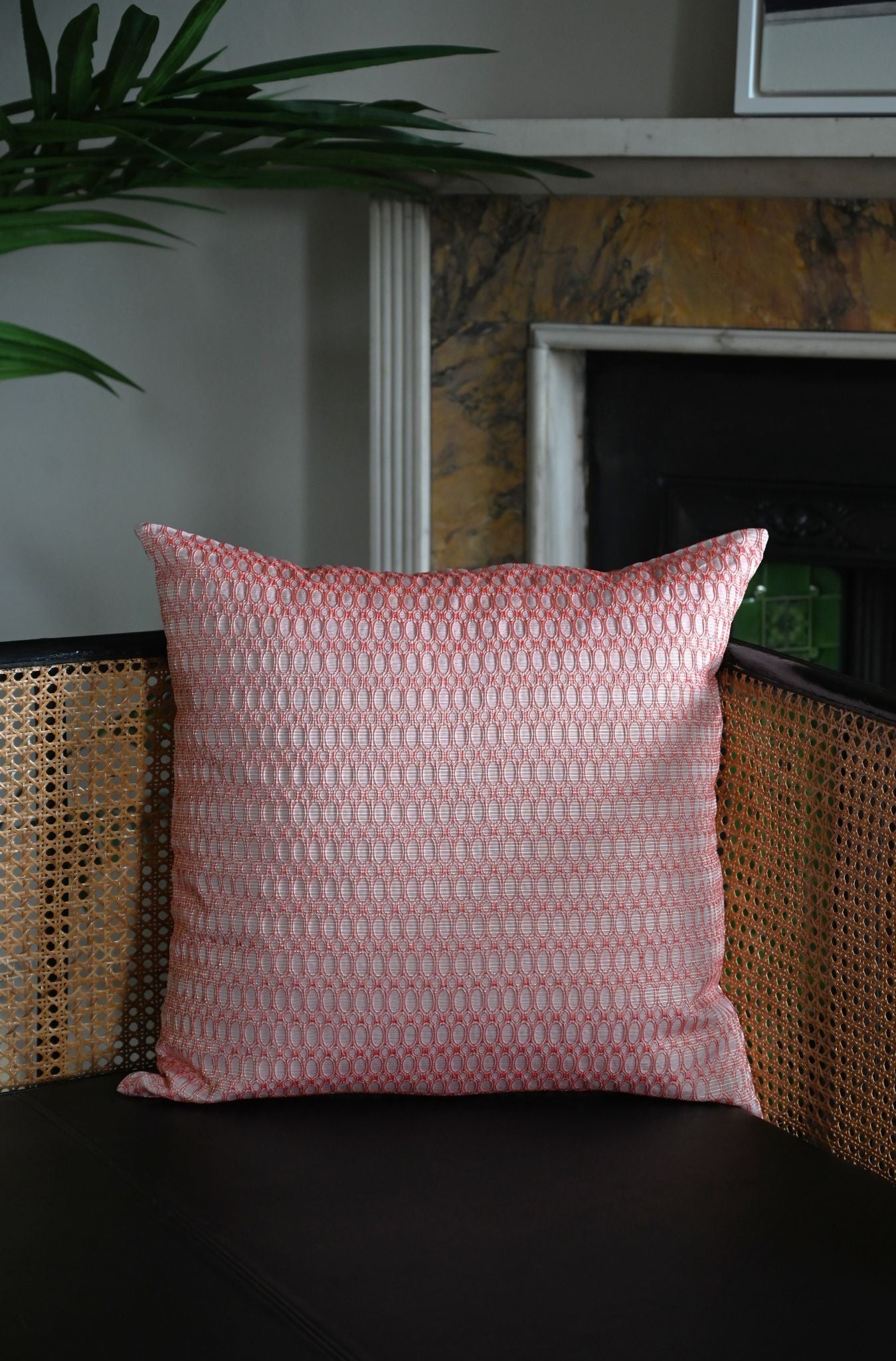 A collection of luxury limited edition Dagny cushions in a shimmering blush pink overlaid with a repeating design of tiny ovals in shocking coral pink and a glint of metallic gold thread. Satisfyingly tactile with a subtle hint of pattern to break up the neutrals on your sofa, armchair or bed.