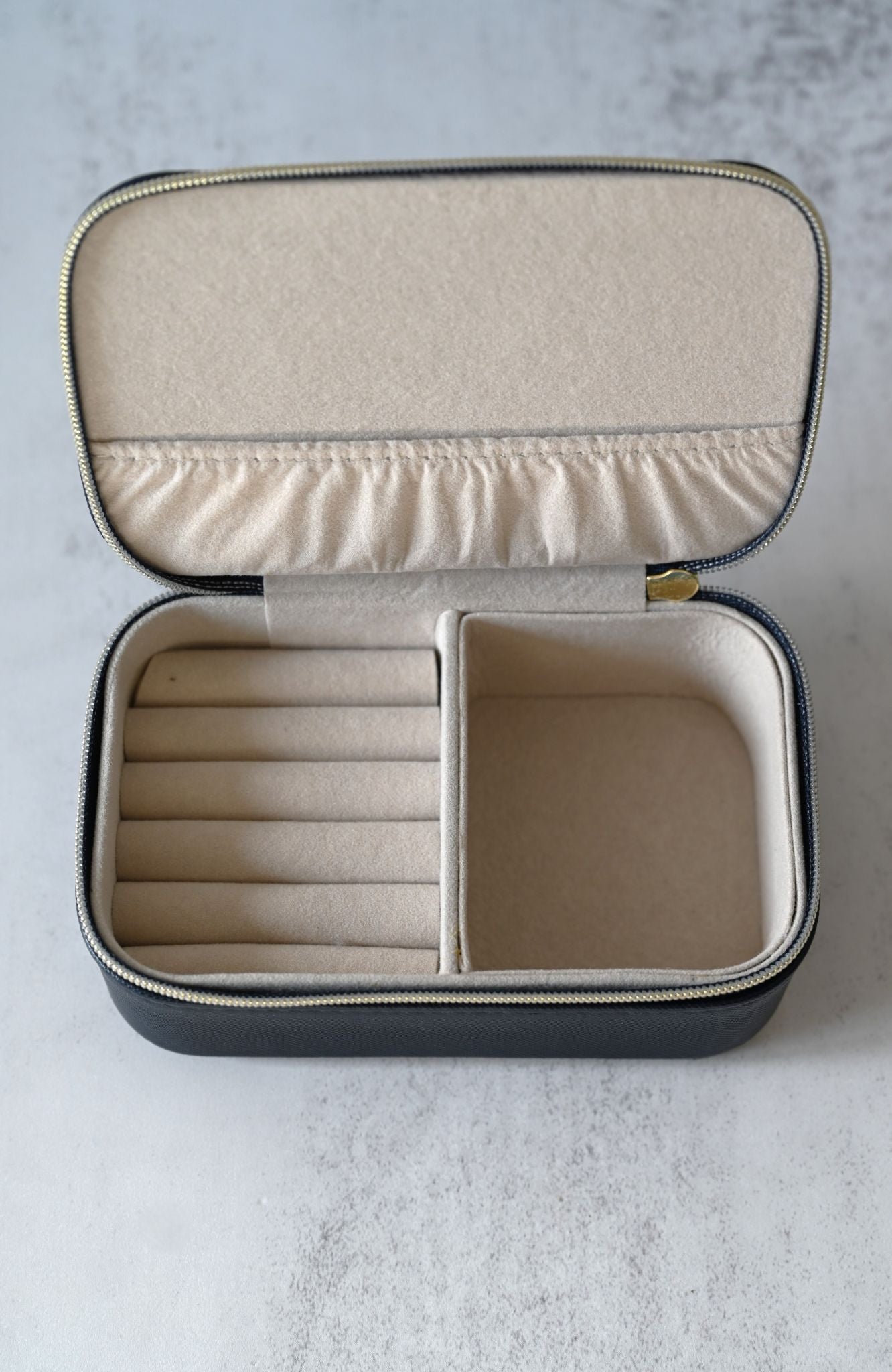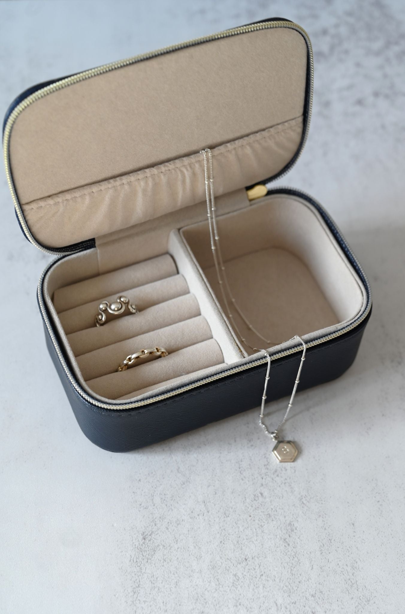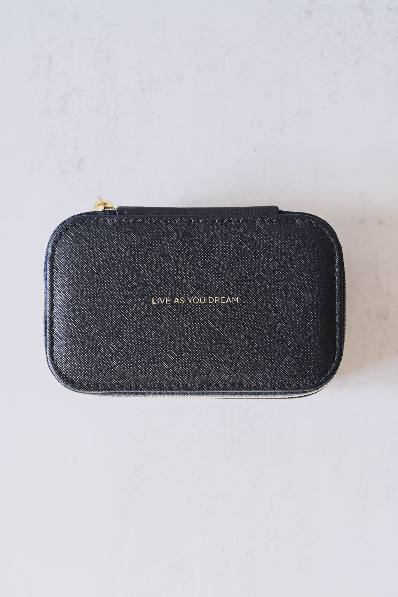 In dieser perfekt tragbaren Schmuckschatulle in Reisegröße können Sie Ihre absoluten Lieblingsstücke für Ihr nächstes Abenteuer im Ausland aufbewahren oder sie zu Hause verwenden, um Ihre Sammlung zu unterteilen. Auf der Oberseite dieses marineblauen Reißverschlussetuis ist eine inspirierende Botschaft aufgedruckt.