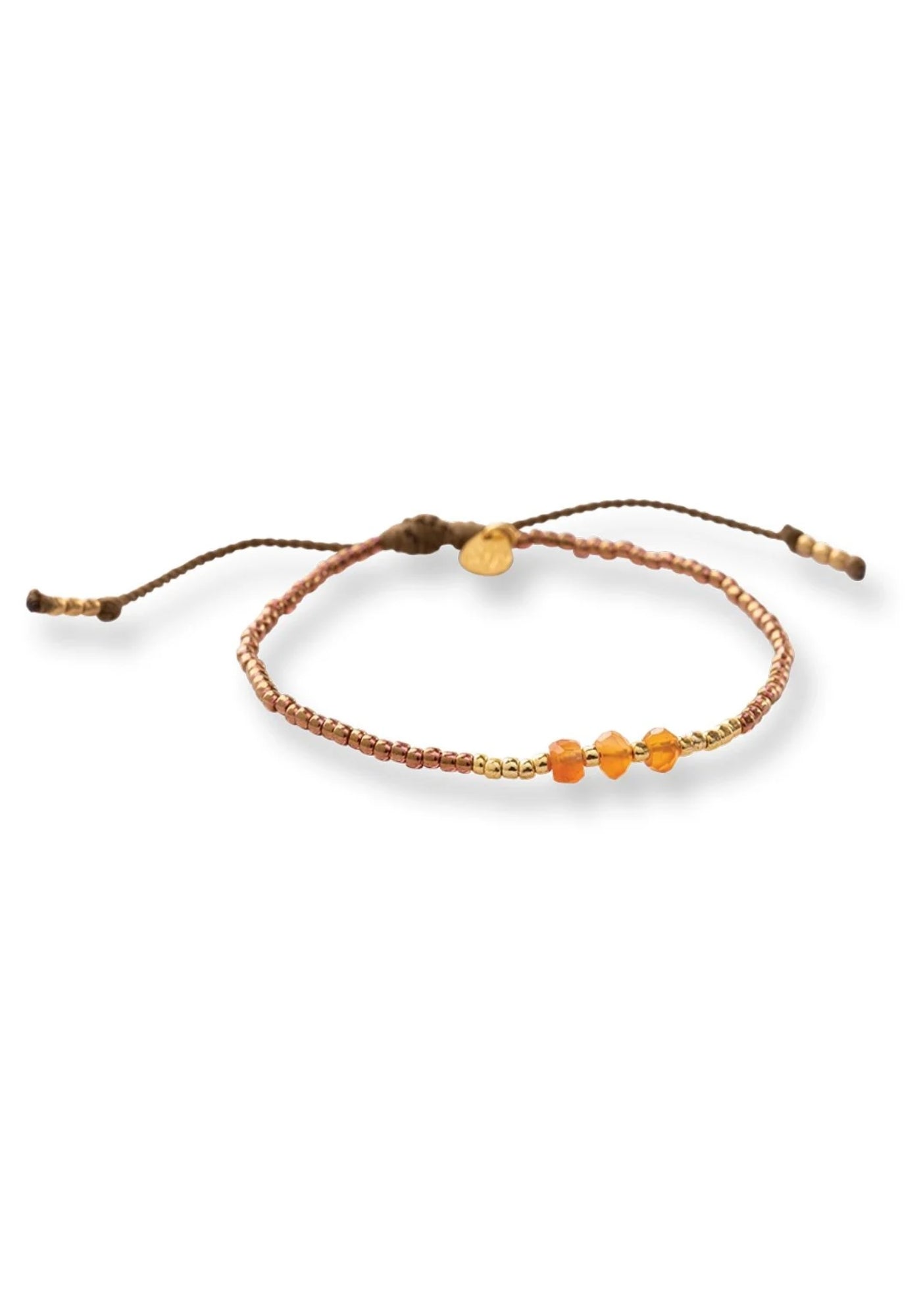 Harness the fiery energy of Carnelian to ignite creativity in your life with this adjustable orange beaded bracelet featuring three small carnelian gemstones and strung on a circle of whisky brown glass beads.