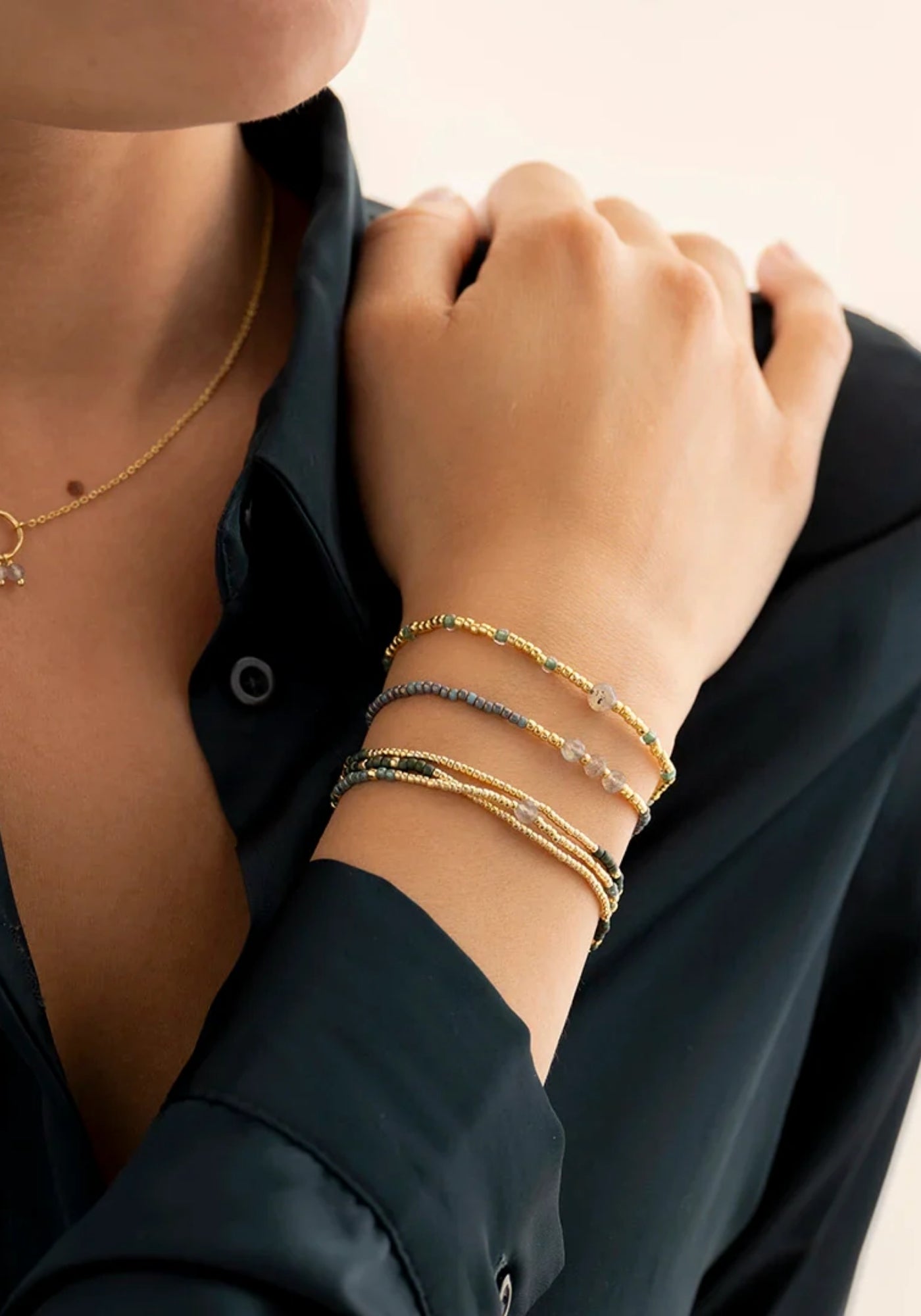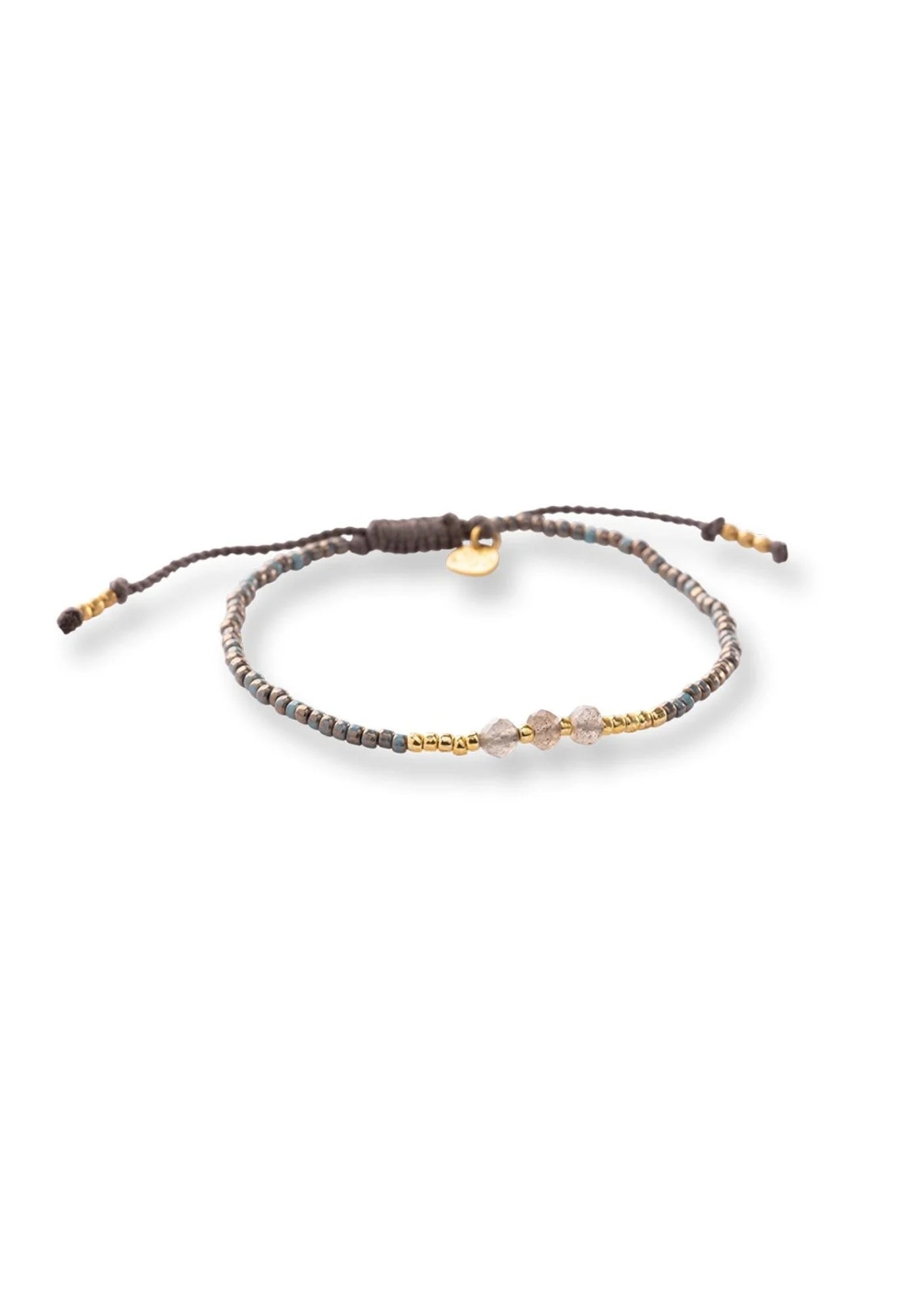 Welcome the relaxing energy of Labradorite in your life with this adjustable beaded bracelet featuring three small labradorite gemstones and strung on a circle of dainty glass beads.