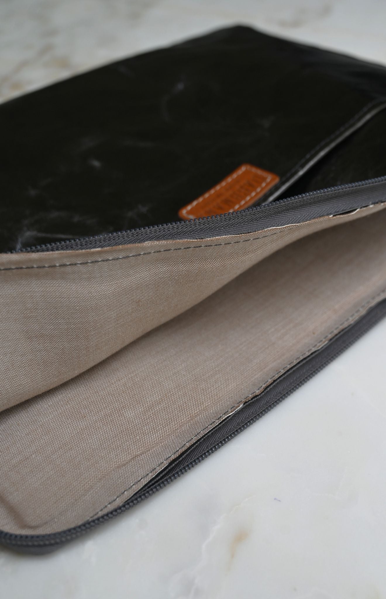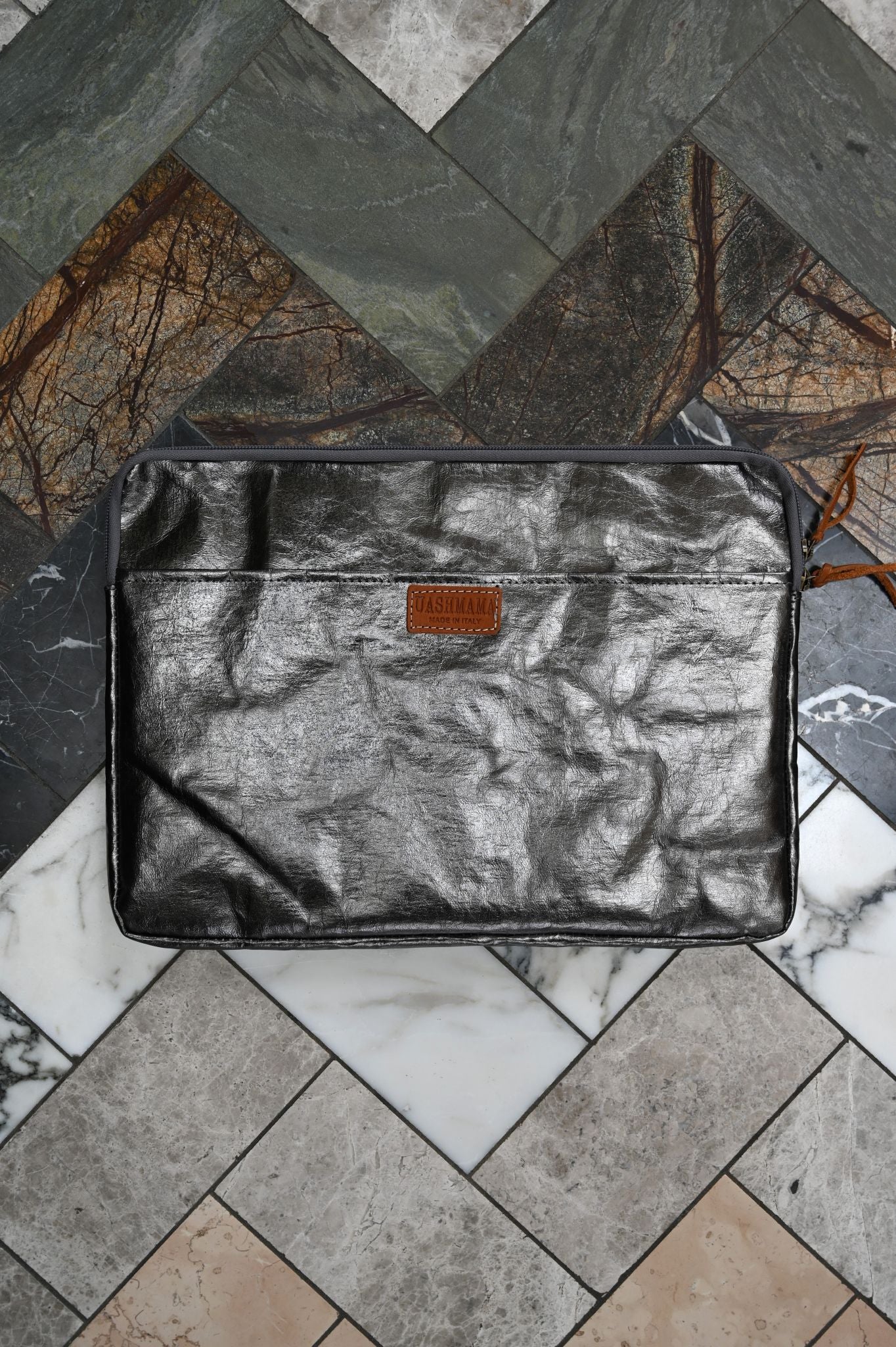 A dark metallic laptop cover made from a unique durable paper with a padded interior lining to keep your gadget perfectly safe while you travel. Tuck documents or a tablet inside the slimline pocket for easy access and zip up the case with its tan leather detailing to match the iconic Uashmama label.