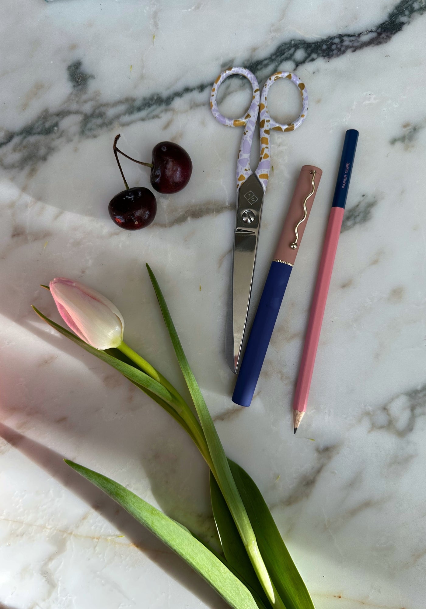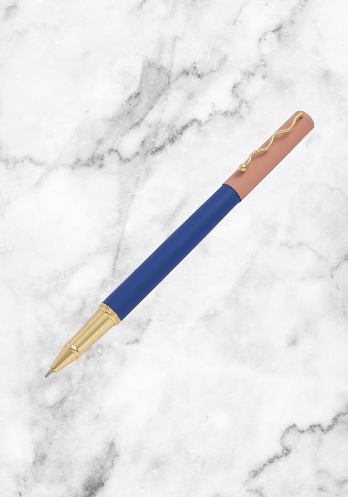 Dies ist kein gewöhnlicher Kugelschreiber. Dieser luxuriöse, marineblaue Kugelschreiber ist aus rostfreiem Stahl mit beschichteten Messingdetails gefertigt, einschließlich einer Messingschnörkelung auf dem Deckel, die auffällt, wenn Sie ihn zwischen die Seiten Ihres Tagebuchs schieben.
