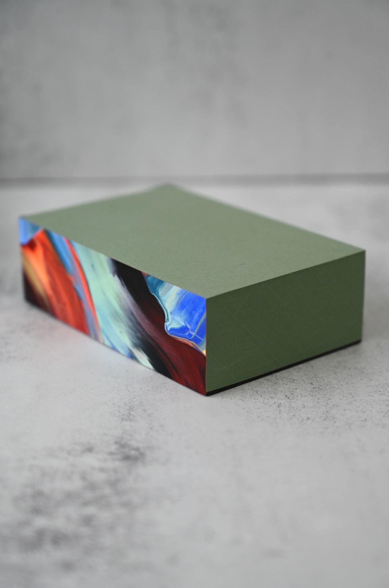 This luxury note pad is made from extra thick 104gsm quality paper painted by hand in a fiery swirl graphic print with big swathes of orange and blue and green. Each one is 275 sheets that feel like greetings cards in their own right, expertly assembled and gummed by hand. These marbled look writing pads aren't your average stationery tool - they're beautifully made works of art designed to inspire you whether it's a note to your partner, scribbling down a telephone number or a poetic love letter to your lover.
