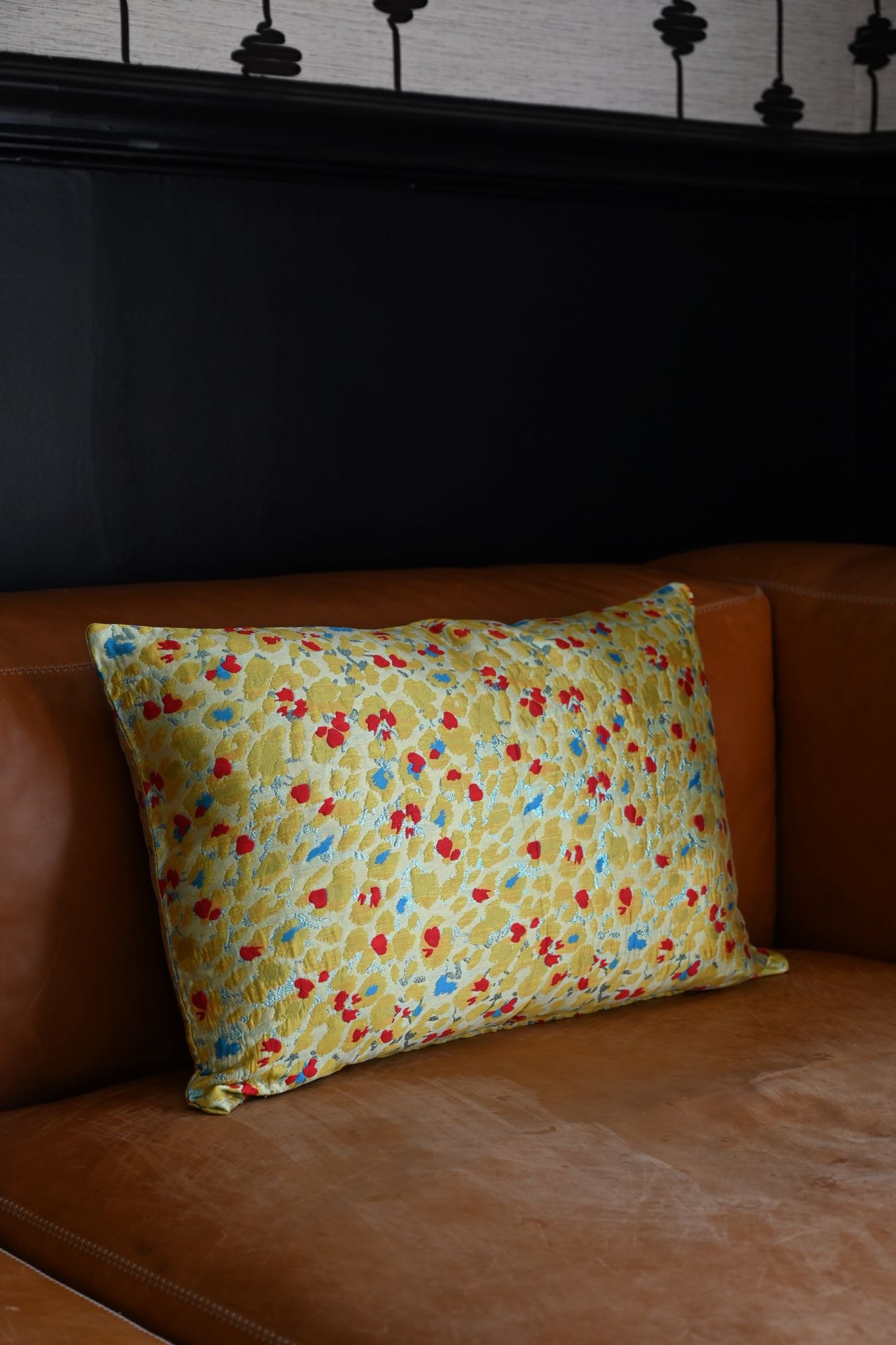 An electric animal print cushion collection by Dagny with an acid yellow backdrop that feels like quilted silk, stitched with a raised leopard print pattern dotted with contrasting red and blue. For those who love animal print but are looking for something that really stands out for their maximalist bedroom or sitting room.