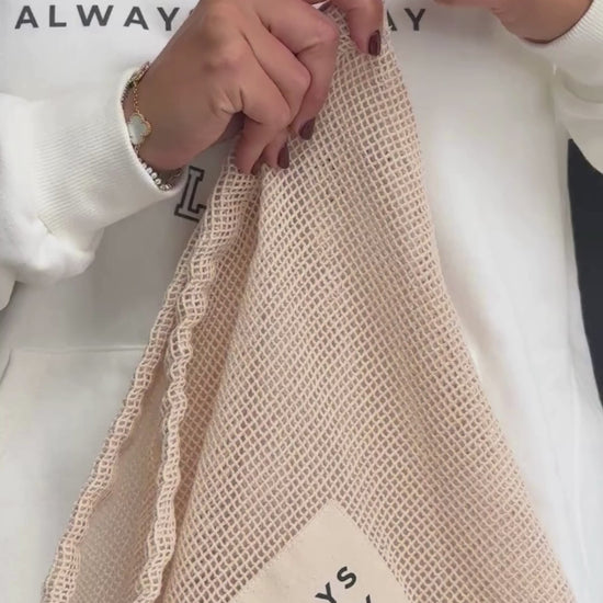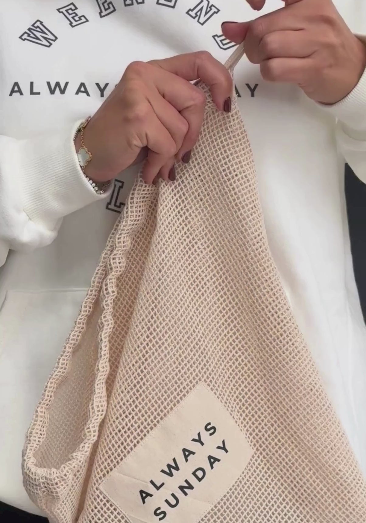 Our brand new Always Sunday Kit Bag is crafted from organic cotton in an open square weave reminiscent of vintage fifties gym kit bags with our logo printed on the front panel.