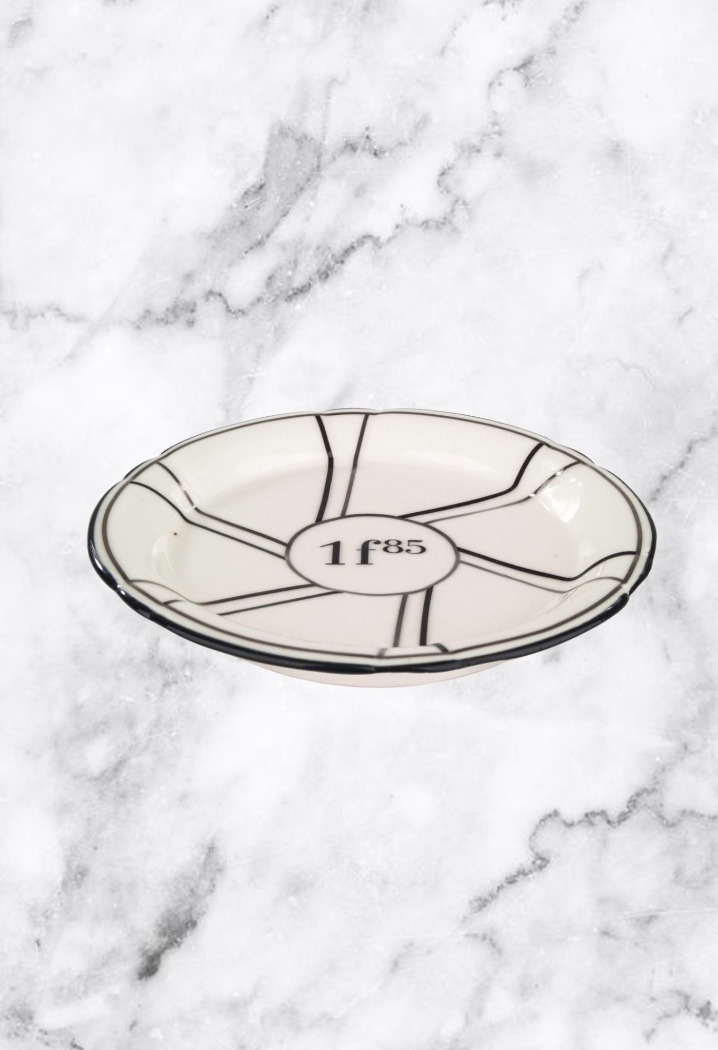 Ces soucoupes en porcelaine sont une copie exacte de ces pièces historiques, avec un bord noir peint à la main qui a été cuit pour garantir que la couleur ne s'estompe pas et le prix en francs imprimé sur le fond. Nous aimons les utiliser comme soucoupes traditionnelles pour verres à boire, mais aussi comme vide-poches pour les pièces de monnaie, les bijoux et les billets dans toute notre maison.
