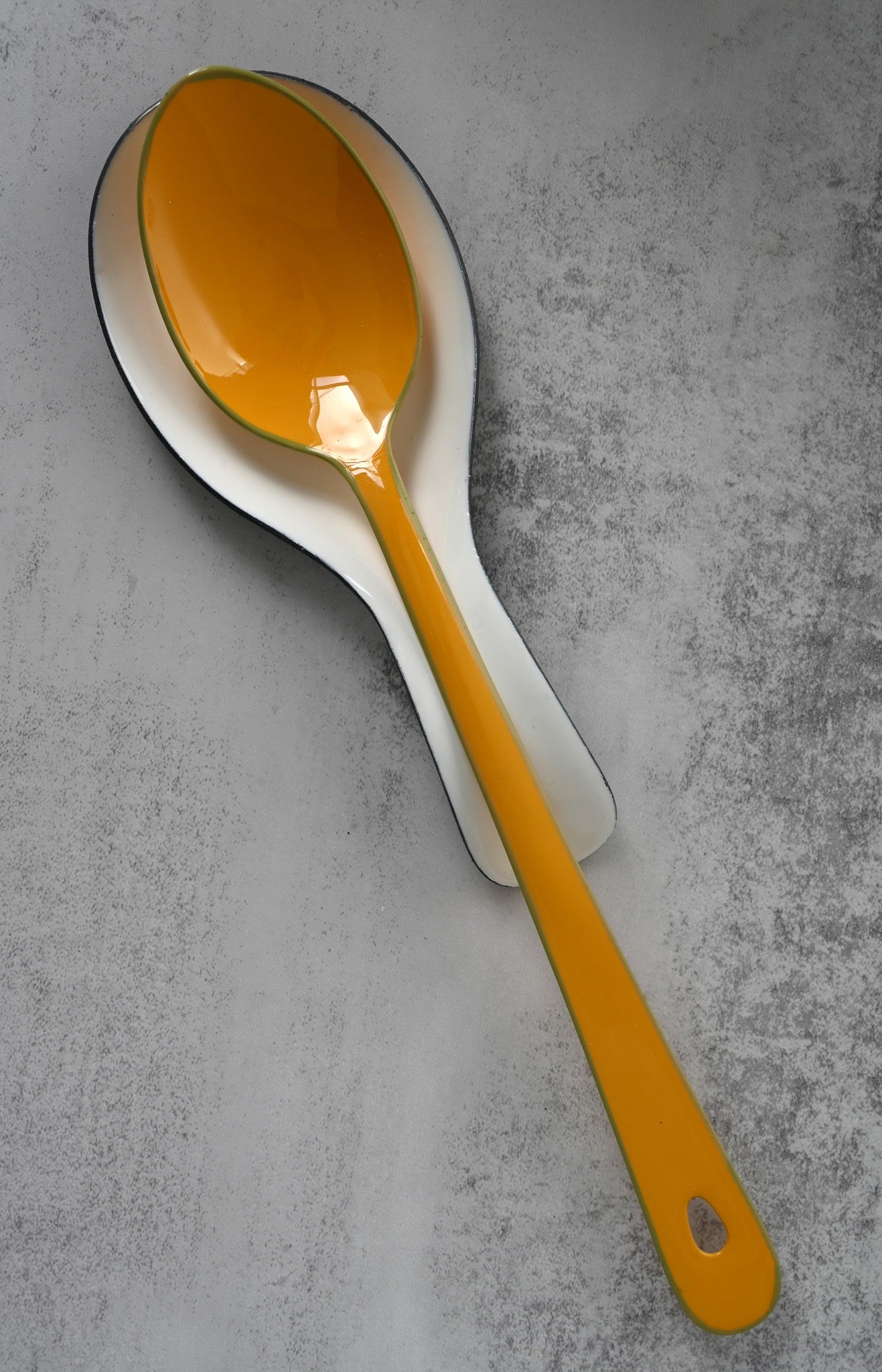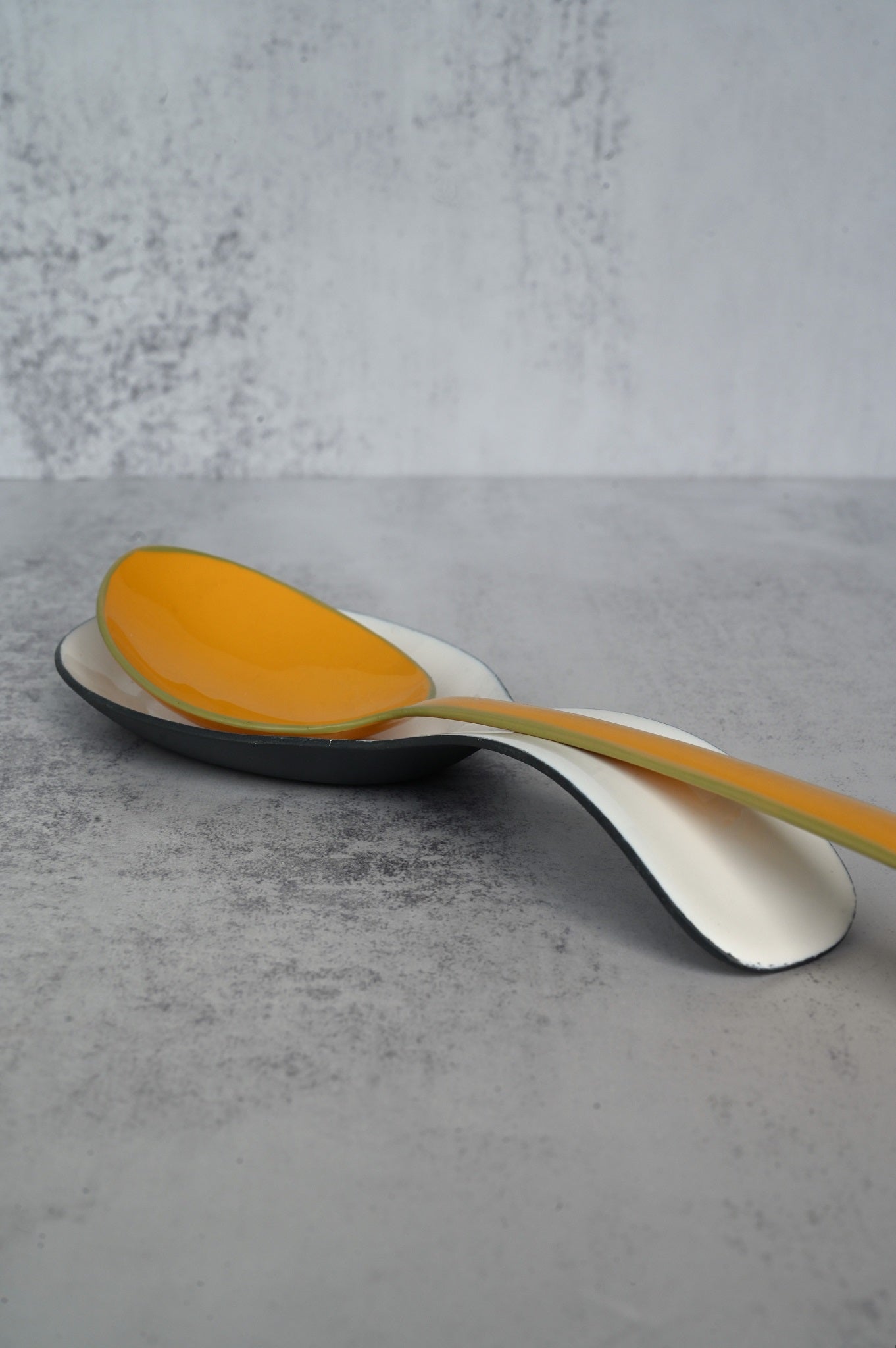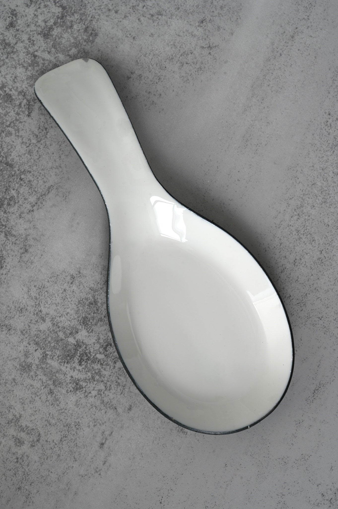 Gardez votre cuisine sans déversements ni éclaboussures avec un repose-cuillère monochrome fabriqué à la main à partir d'émail recyclé en petites quantités en Inde. Idéal pour les chiots sales et les cuisiniers en désordre.