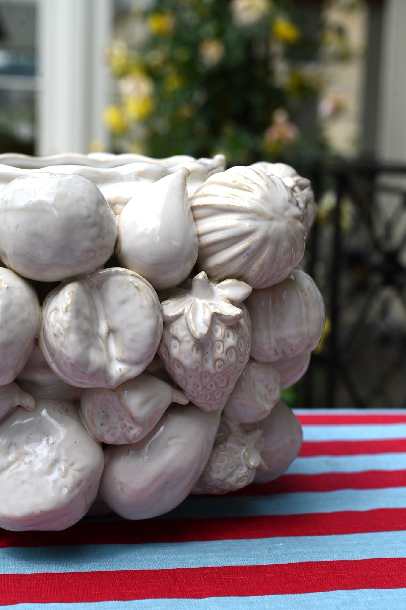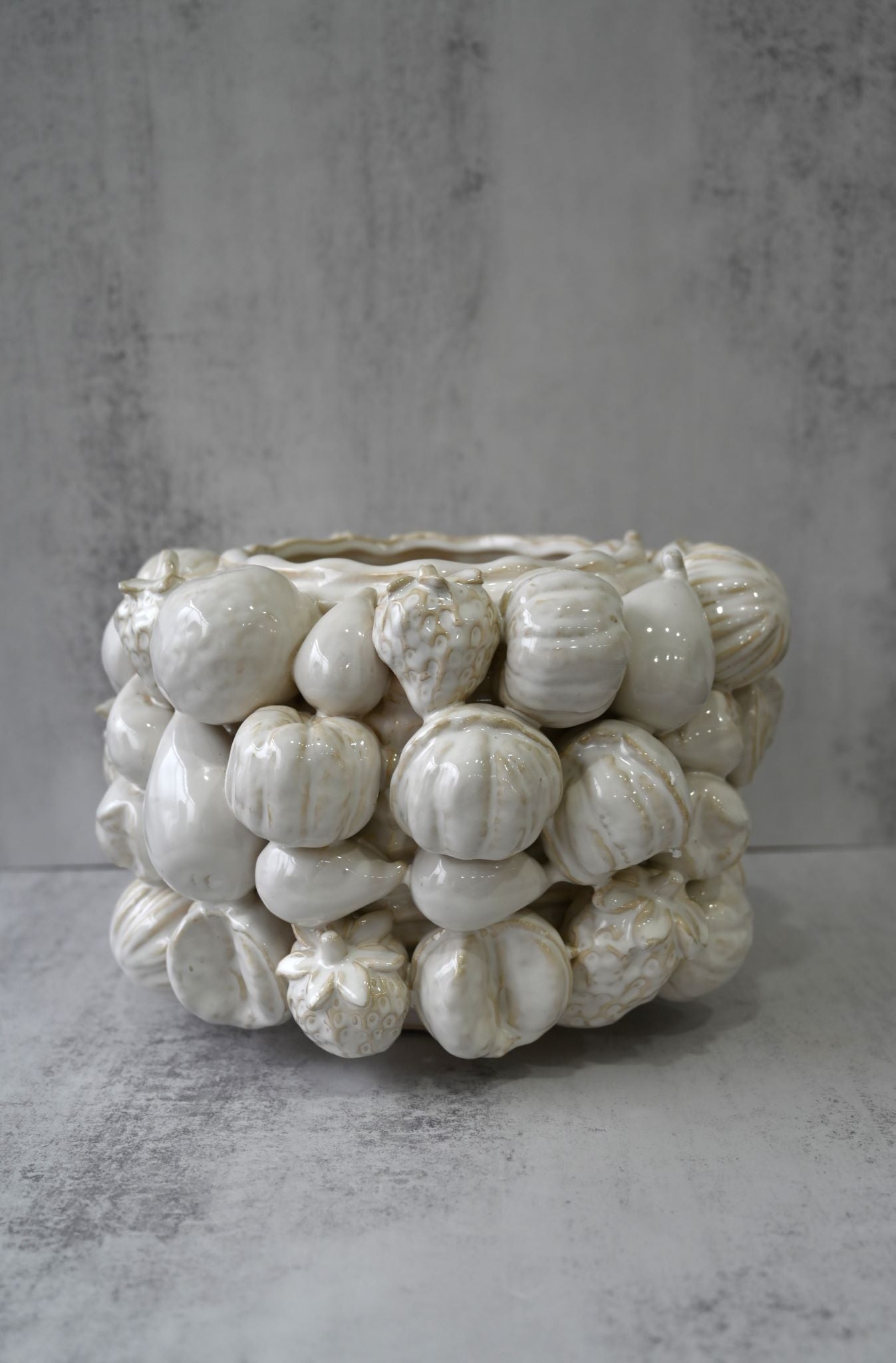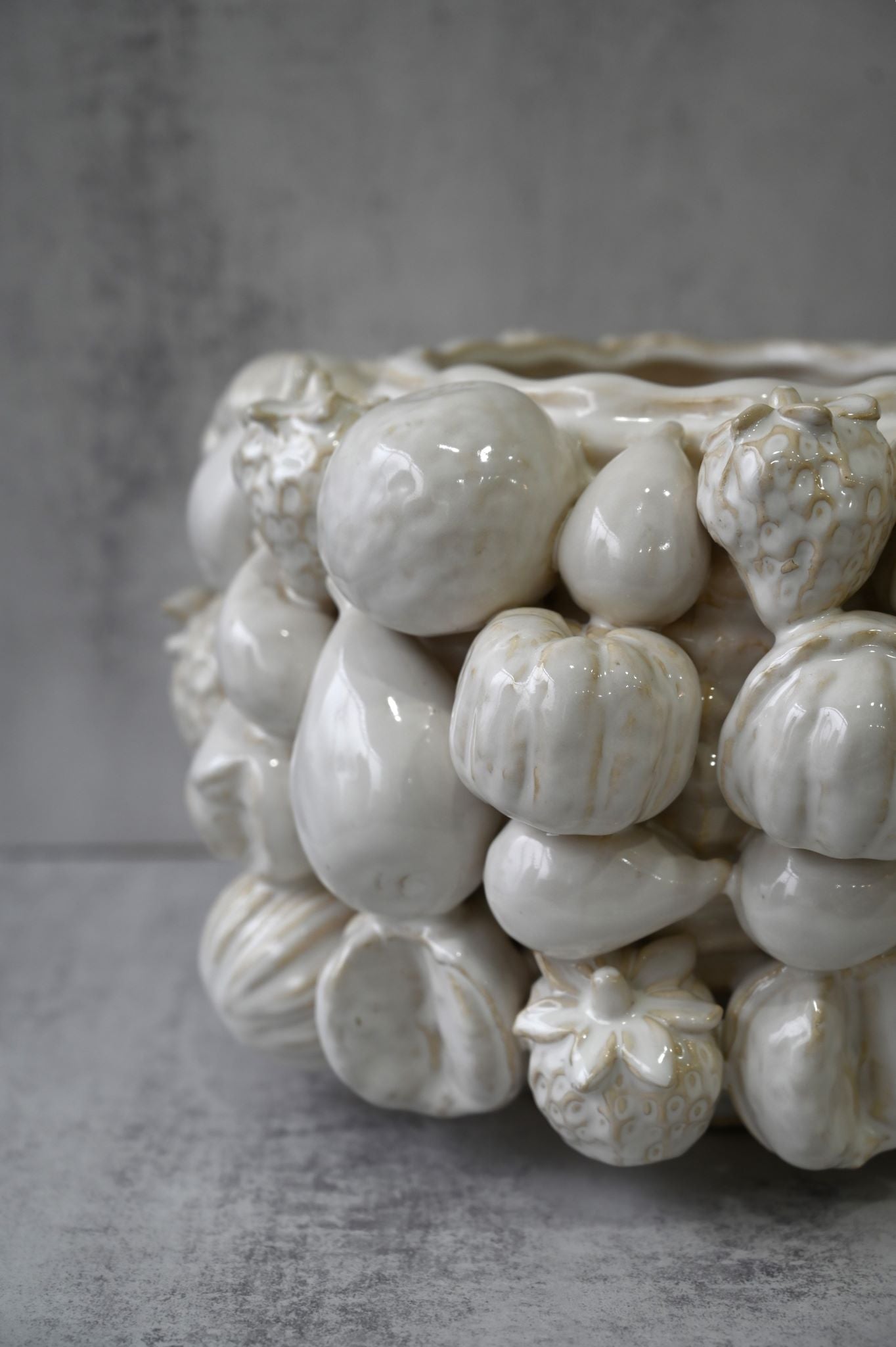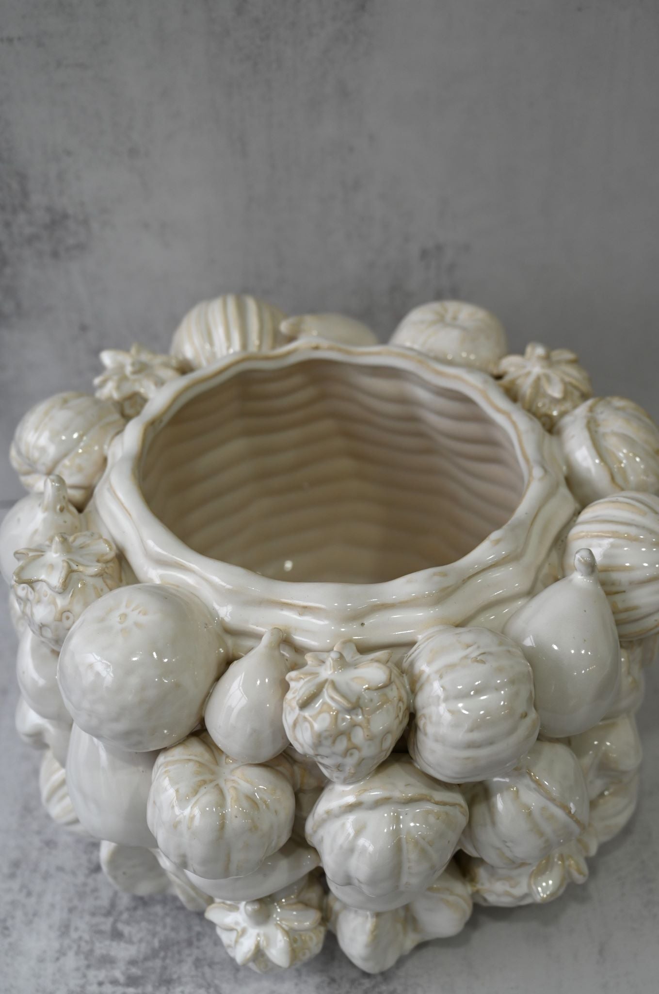 A refreshing bite of Italian style for your interior decorating, this seriously luxurious seriously weighty white glazed vase is made from fine ceramic studded with all kinds of figs, lemons, berries, and pomegranates with a seriously realistic finish even down to the dimples and sprigs of greenery! The wide opening means you could place an entire basil plant inside or fill with peachy pink flowers that will overflow and cascade down the sides.