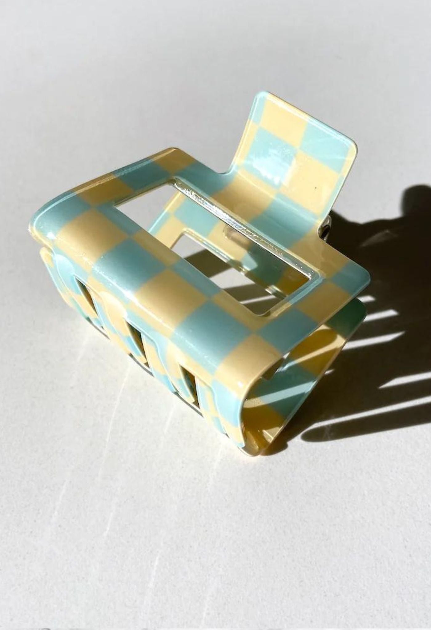 Fixez vos cheveux en place avec une pince à cheveux épaisse imprimée d'un motif à carreaux de course dans des tons pastel, un cadeau idéal pour ceux qui sont toujours en mouvement.