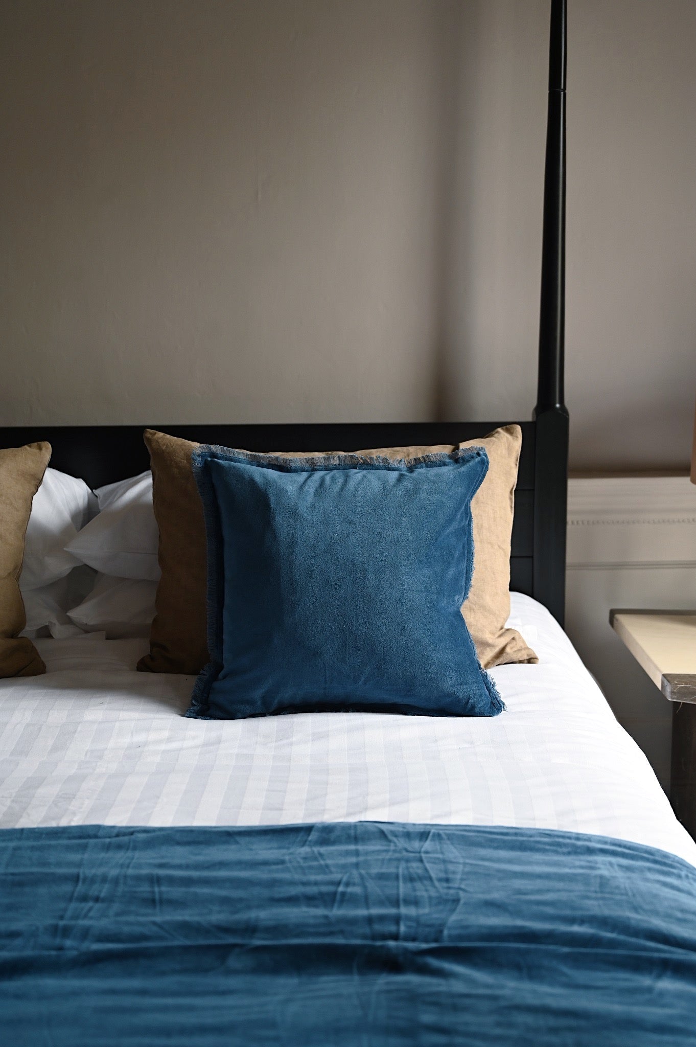 Le velours semble changer de couleur en fonction de la lumière et de la direction du velours, mais cela ne fait qu'ajouter à la superposition lorsqu'il est regroupé. Les coussins sont en velours double face et le jeté matelassé présente du coton assorti au revers.