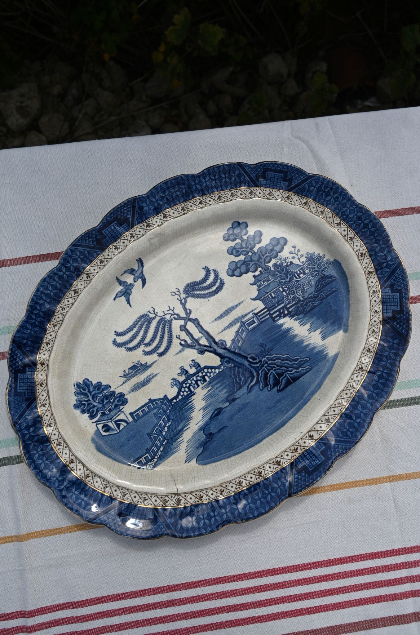 A vintage china platter depicting an illustrated landscape of Chinese architecture and soothing nature. A collectors item due to the grand size of it, this large oval platter will be the centre of your decadent feasts.