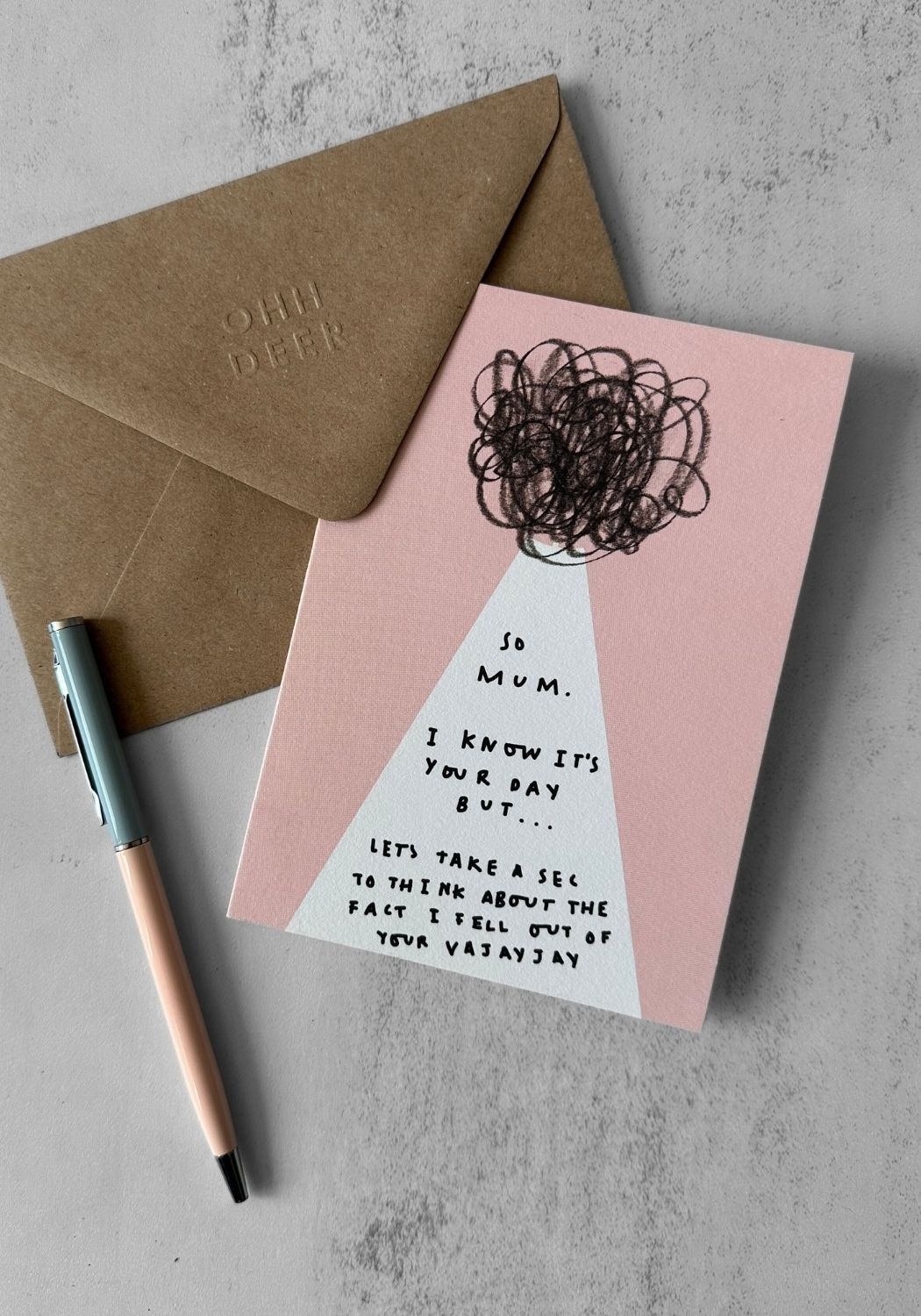 When the comedy skills run in the family, you know your mum will appreciate this mothers day card with a hilarious message on a blush pink backdrop that looks quite like something else..