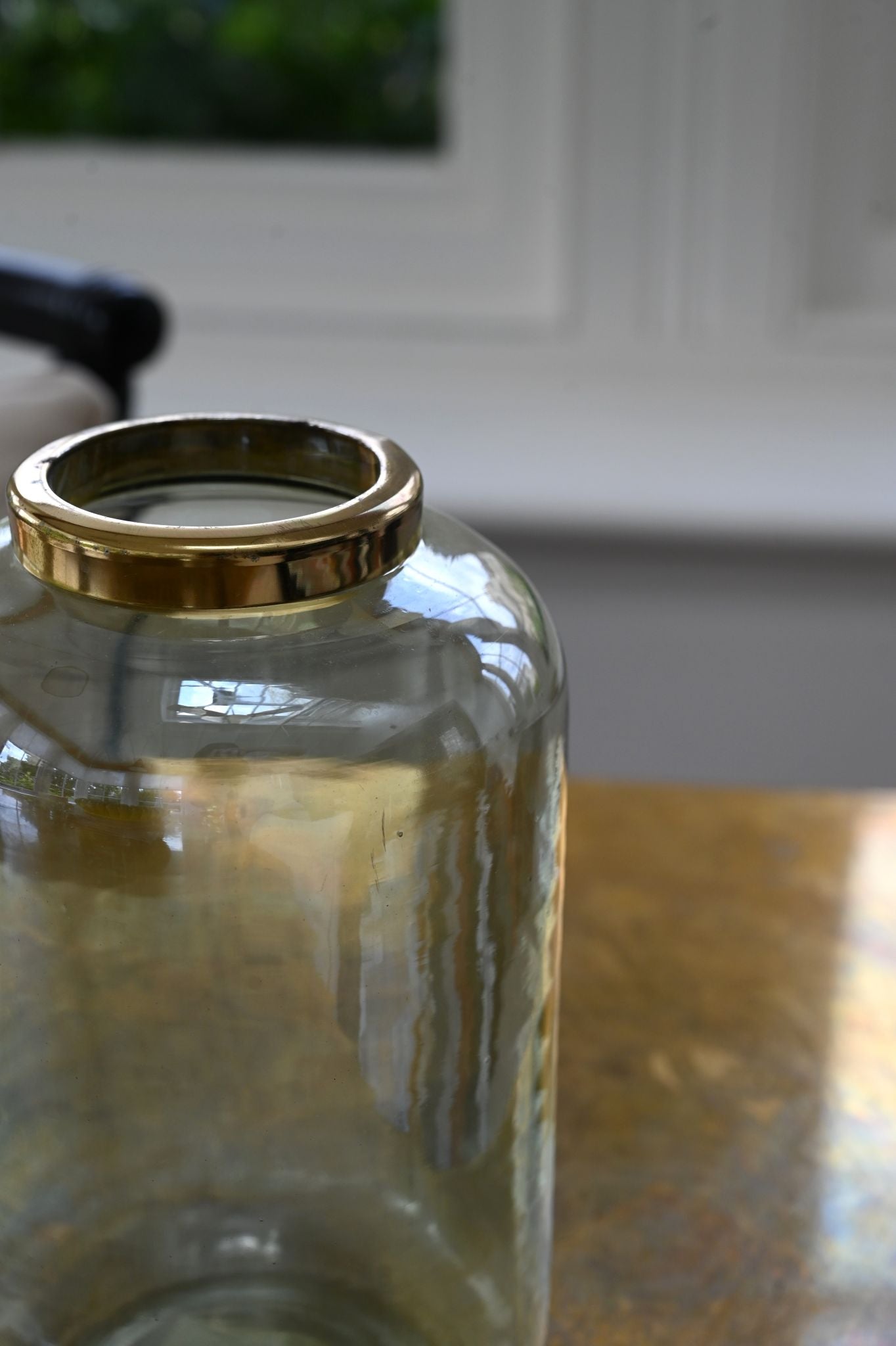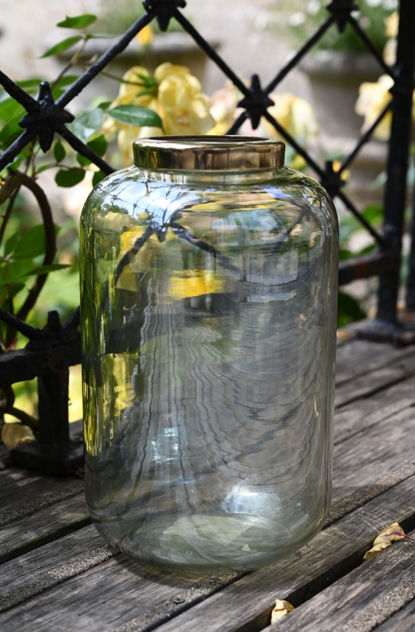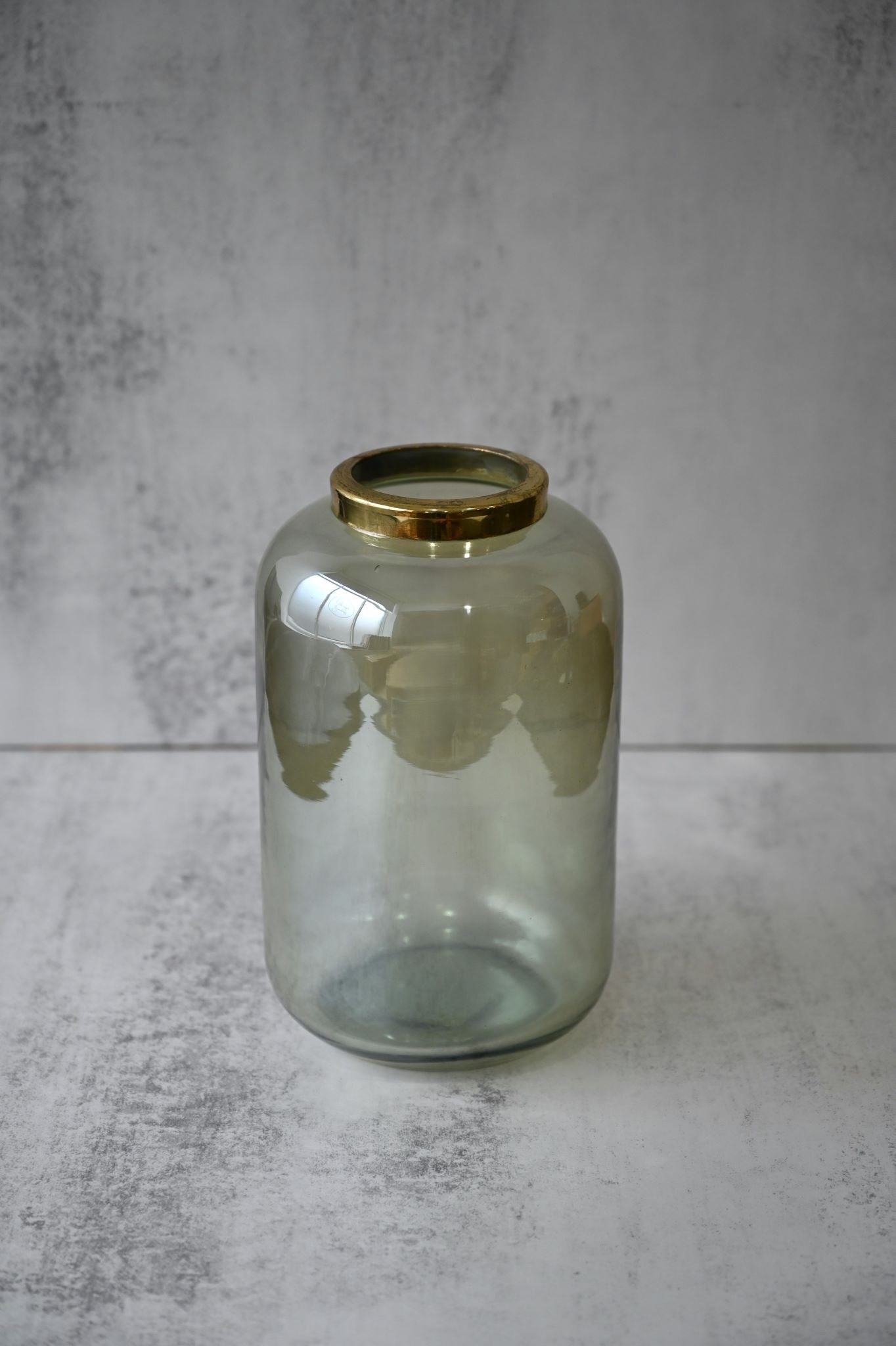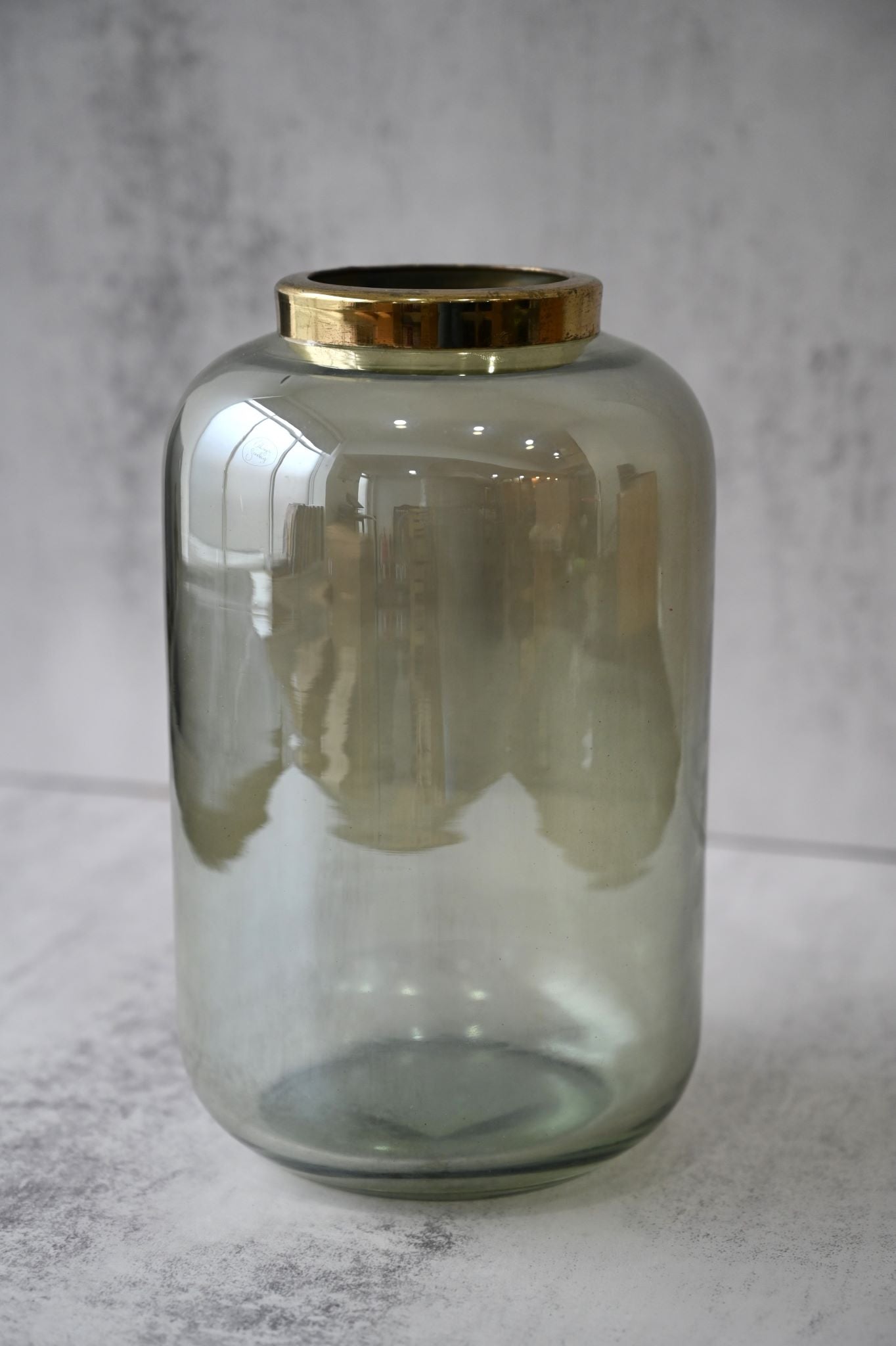 Harking back to Italian glassblowing like Murano, this pearlescent green-grey vase is made from a thick glass with a iridescent lustre finish and bordered in gold. The deep centre allows for stems of fresh lemon branches and stems of golden mimosa to compliment the height and shape of the vase or style with sprayed dried flowers for even more sparkle.