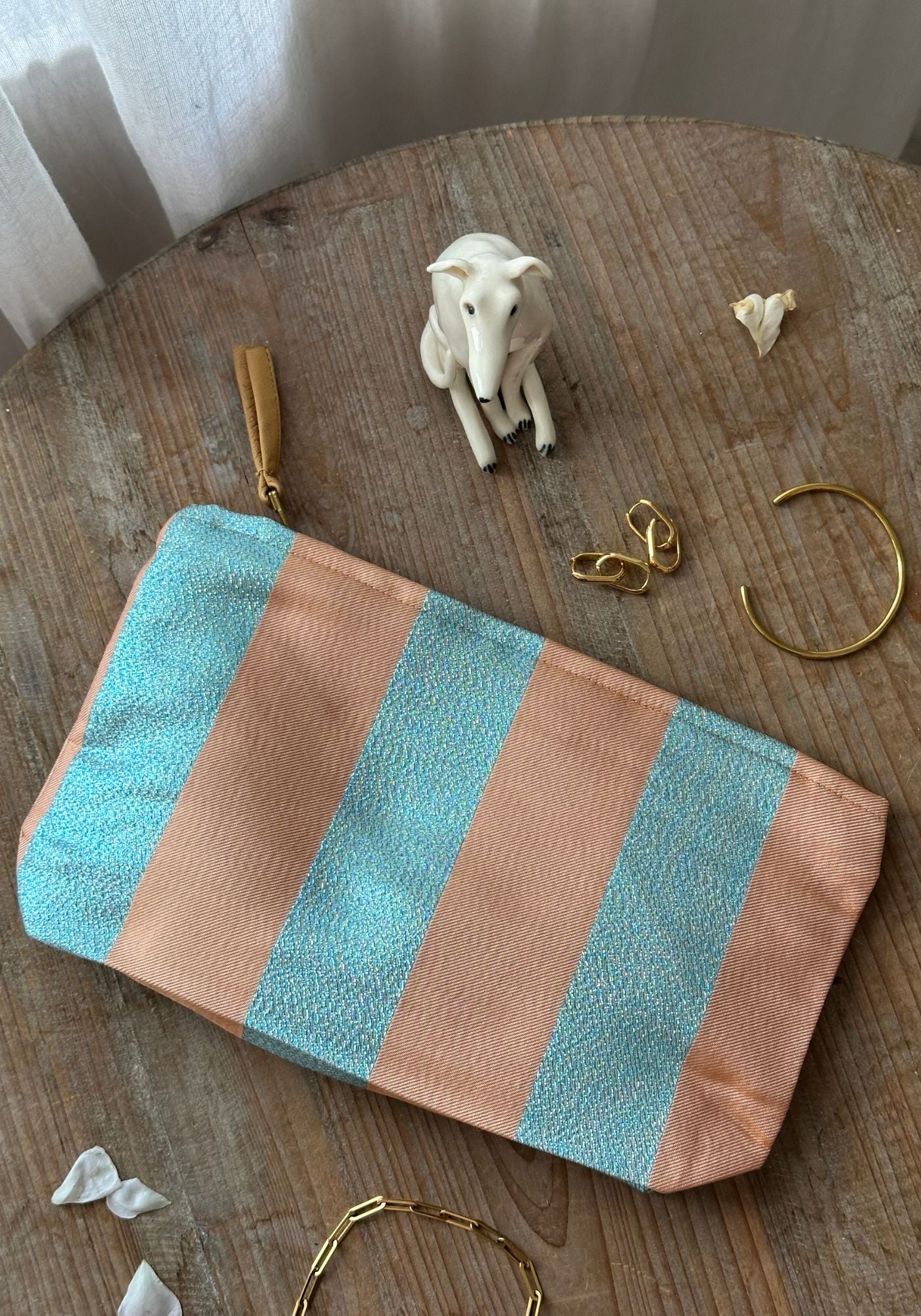 A wide striped luxury cosmetics bag in peach and sky blue shot with a pale blue metallic thread to give it a shimmer. A lightweight yet luxurious travel bag that's easy to pack in your luggage or for elevating your morning makeup.