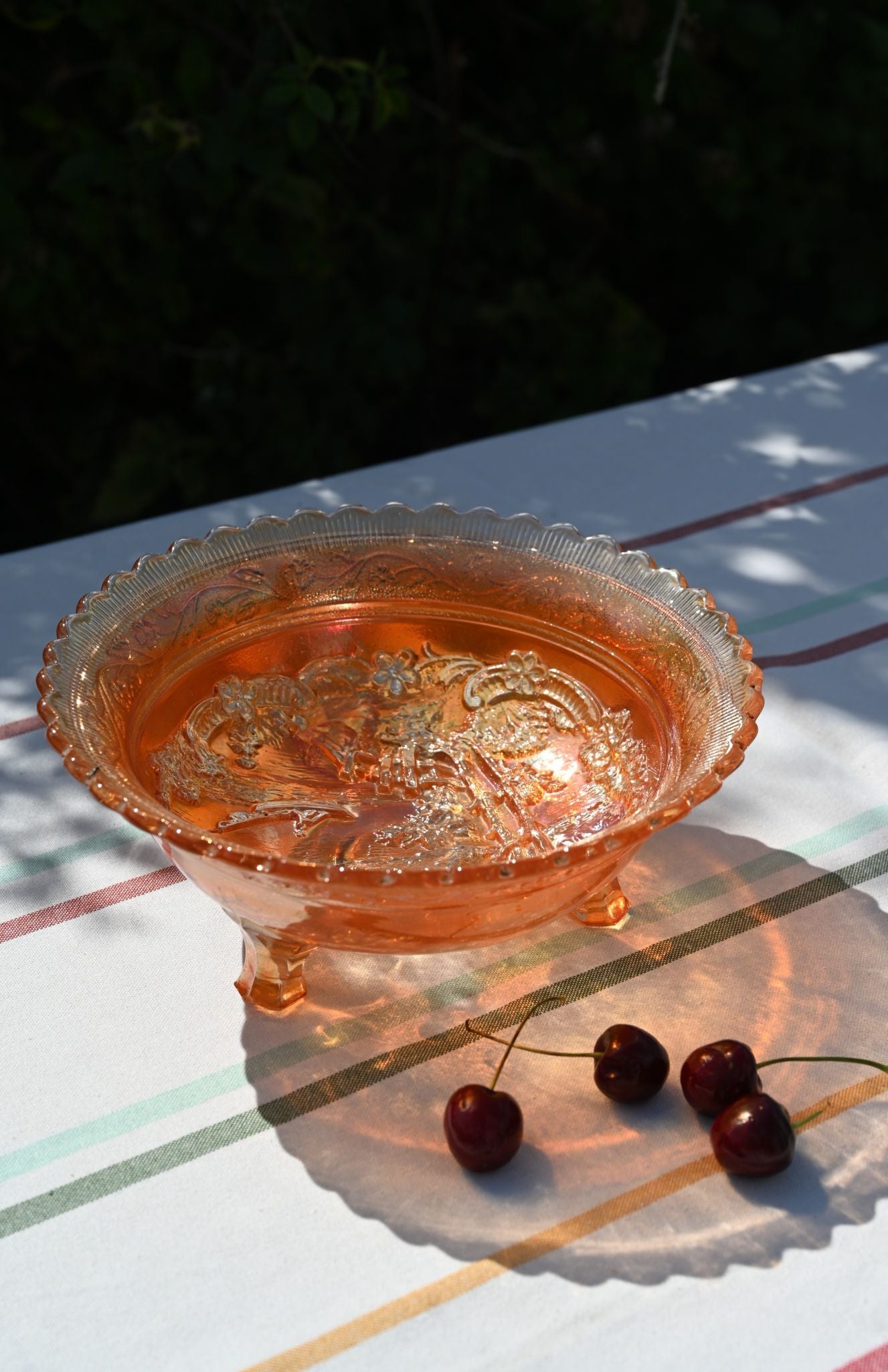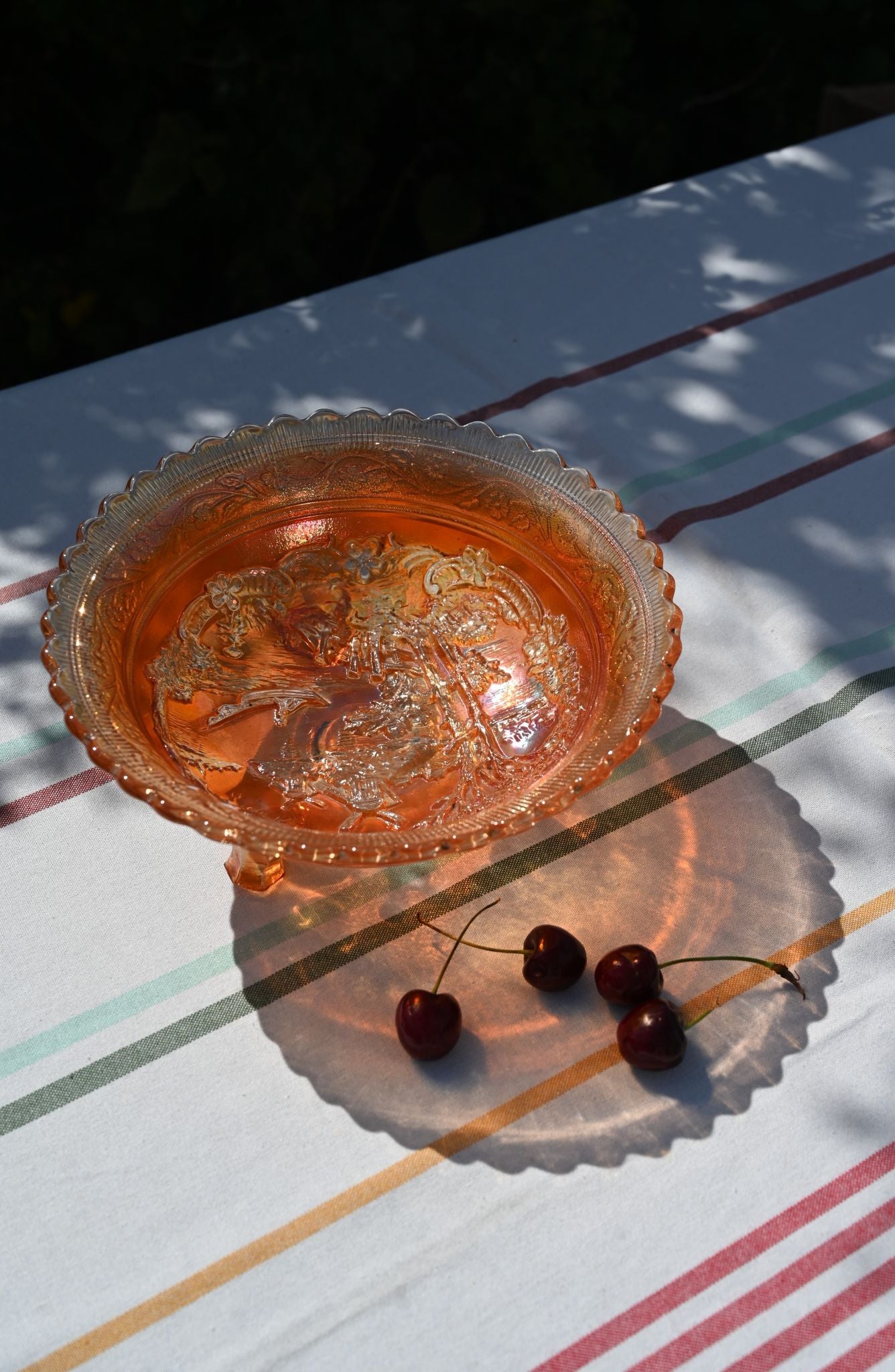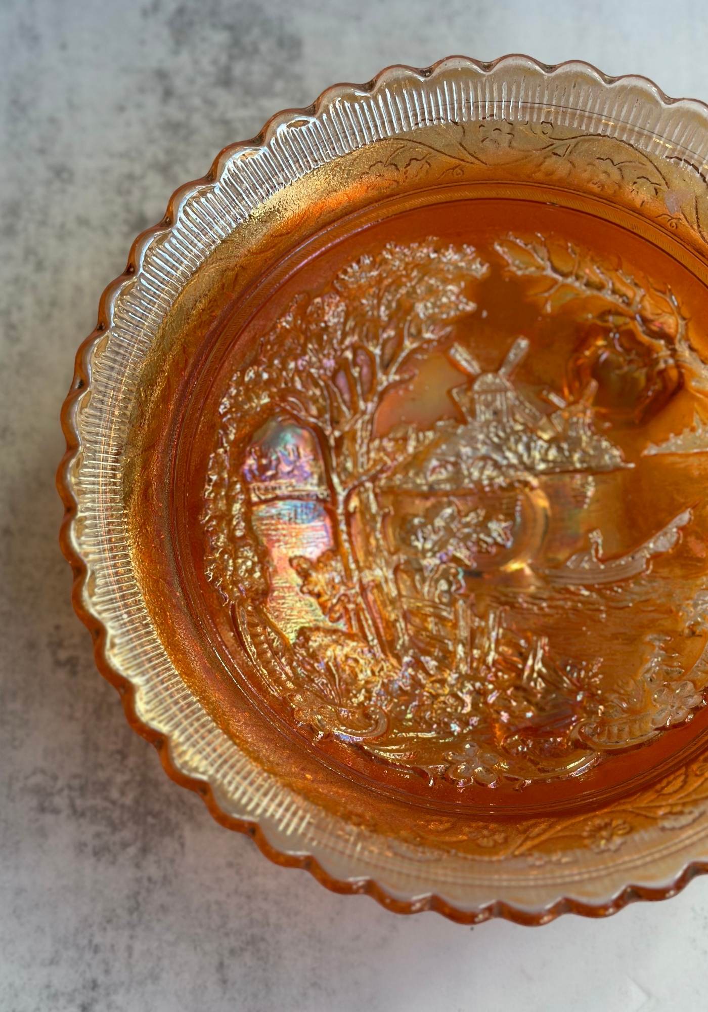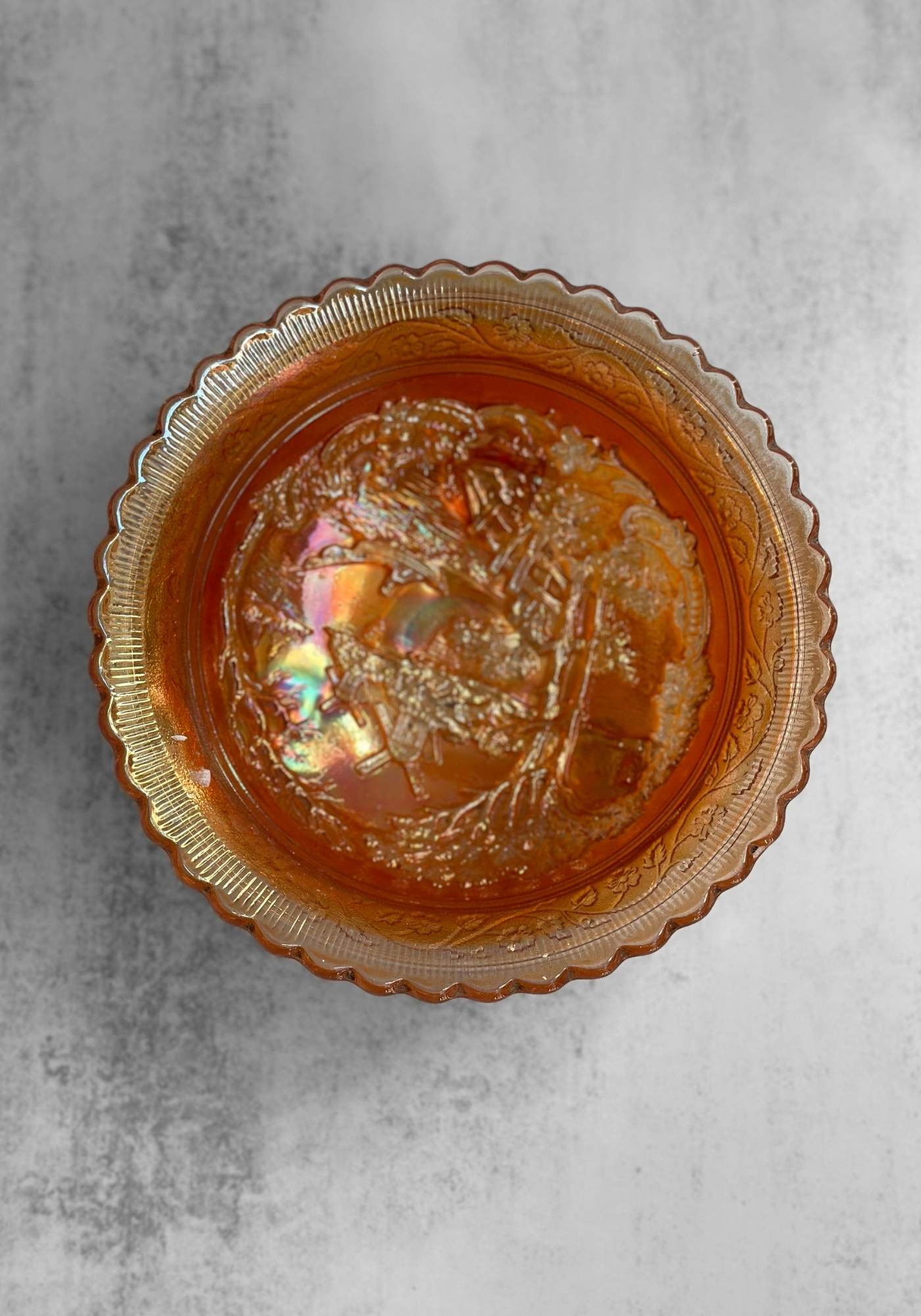 Carnival glass (or aurora glass as its also known) is named because of the iridescent metal salts pressed into the glass giving it that 'oil on water' effect.