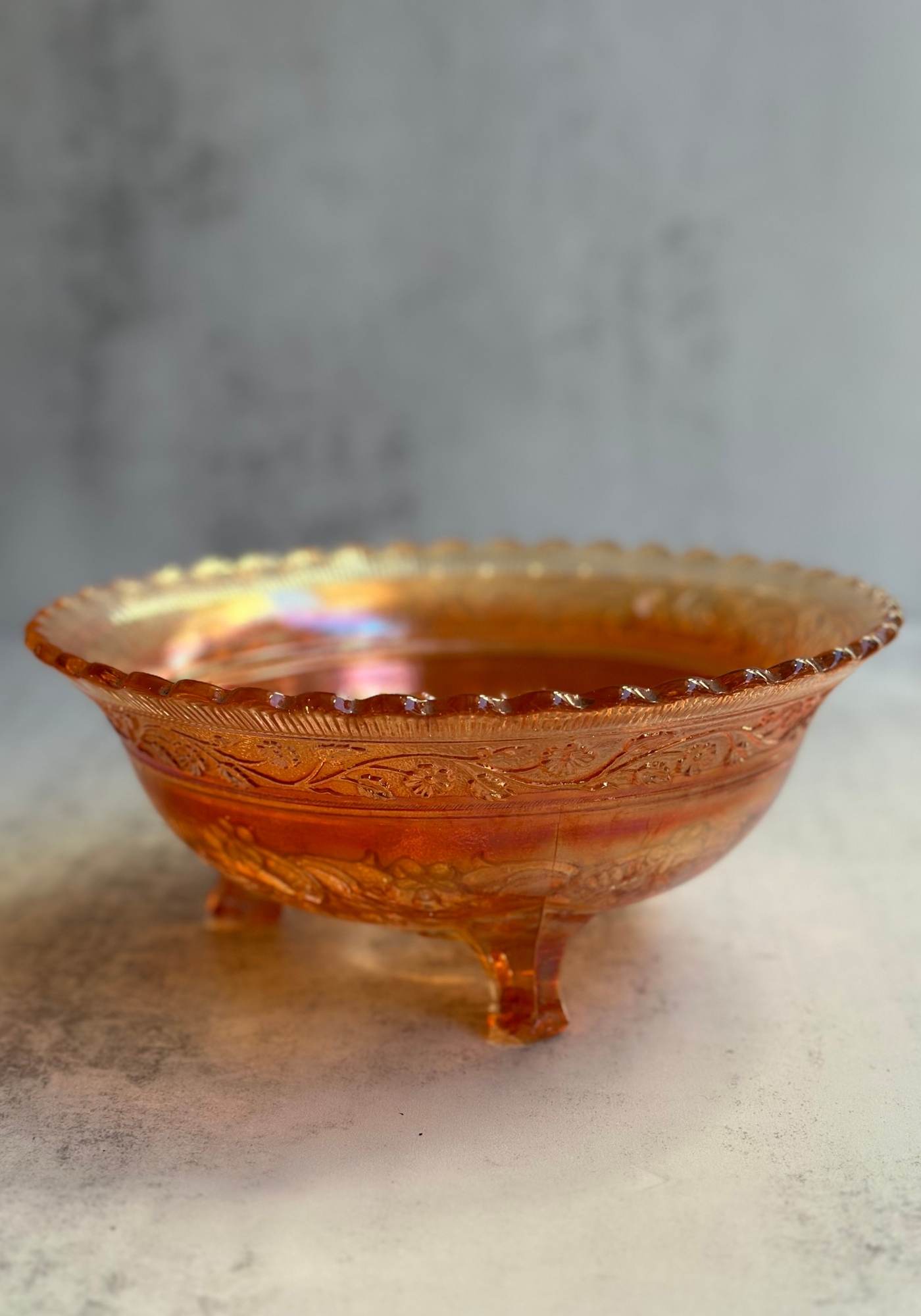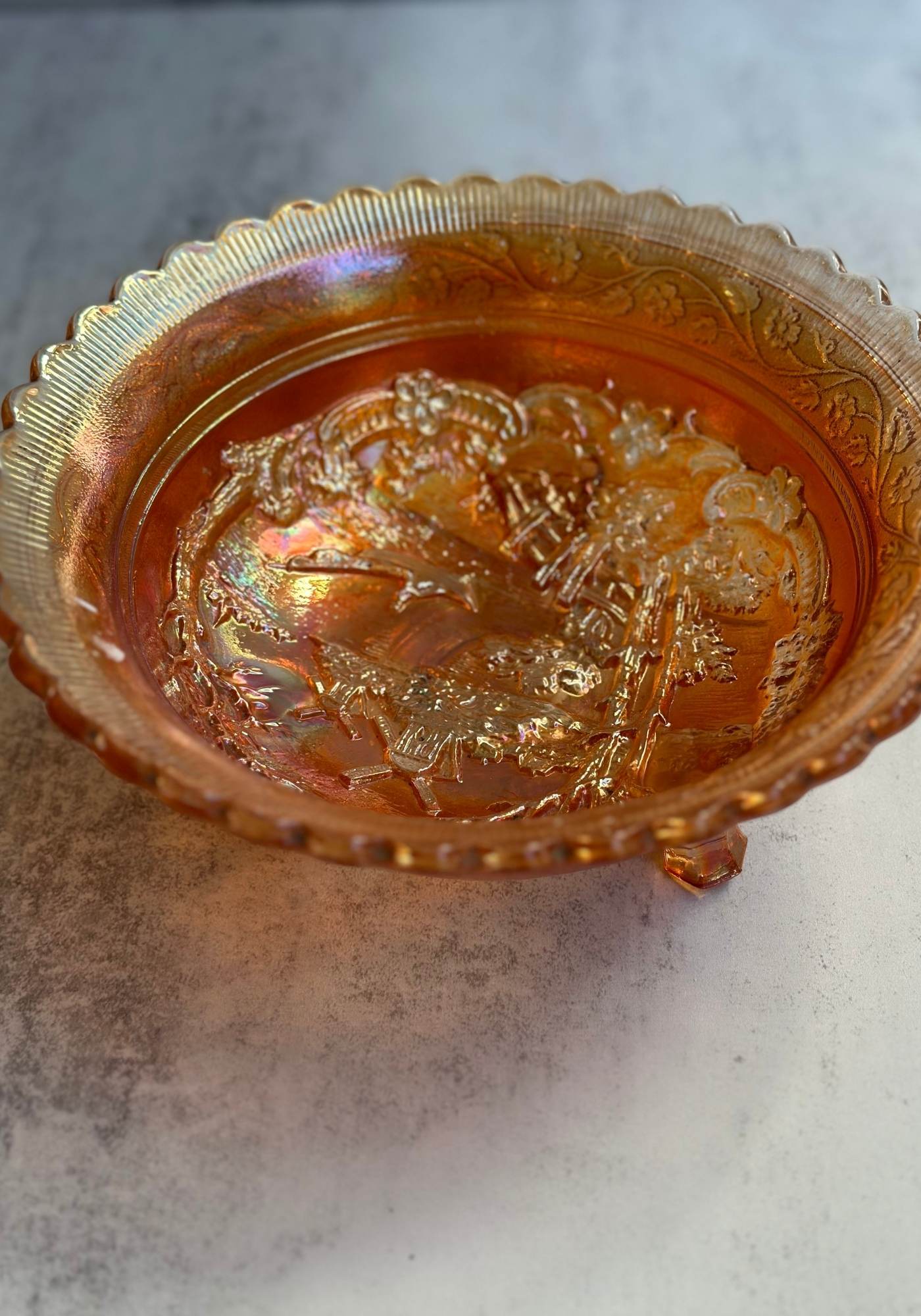 A deep carnival glass bowl on miniature claw feet featuring the coveted windmill design that vintage collectors and antiques dealers scramble over. This large bowl is ideal as a display piece on your Art Deco coffee table or as a serving bowl at your next twenties inspired dinner party.