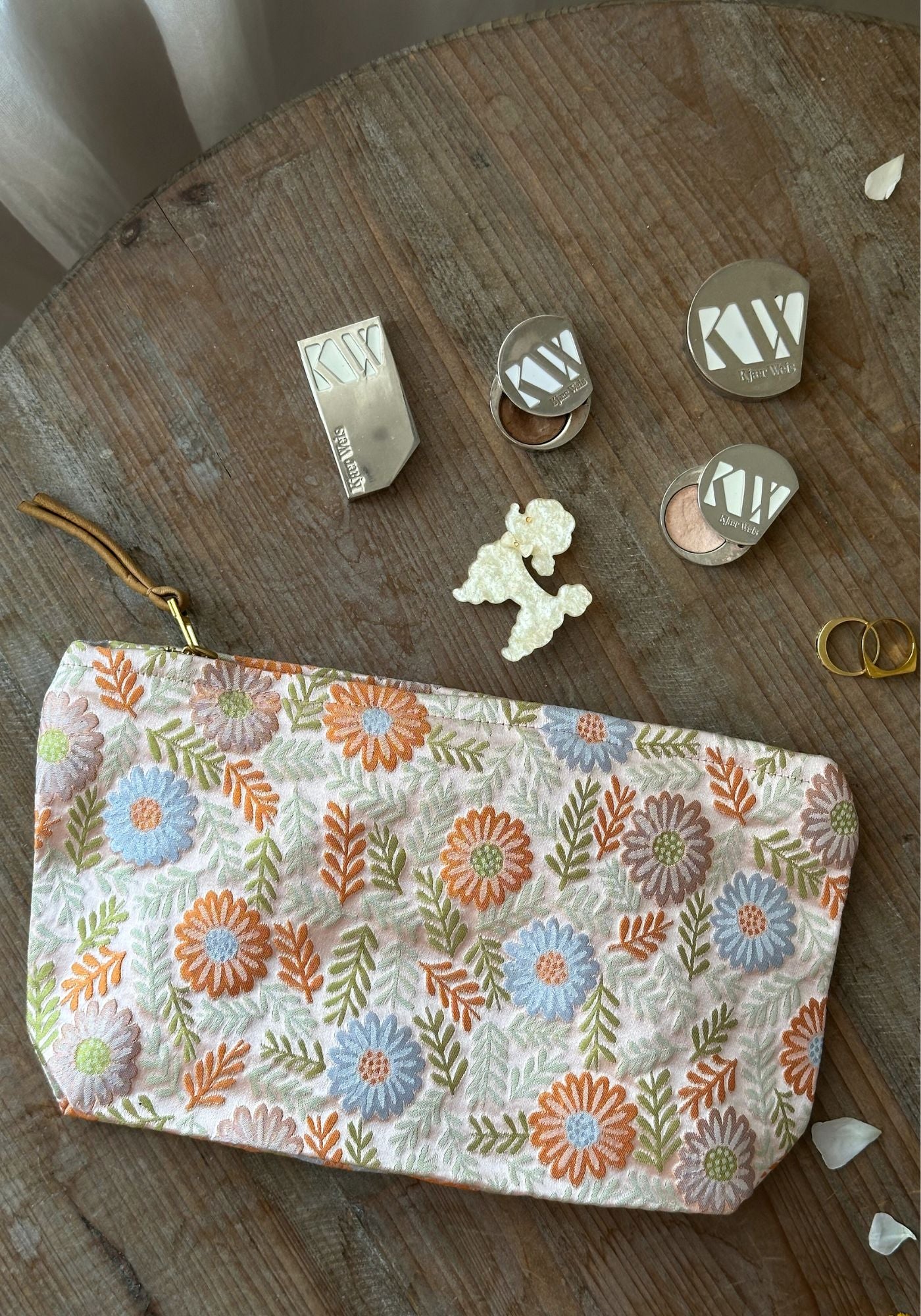 A large limited edition travel bag for your best cosmetics or accessories with a quilted silk feel to it and a raised daisy flower design that reminds us of seventies Woodstock fashion.