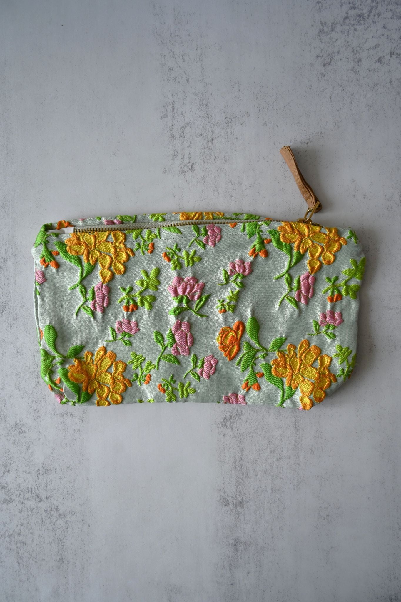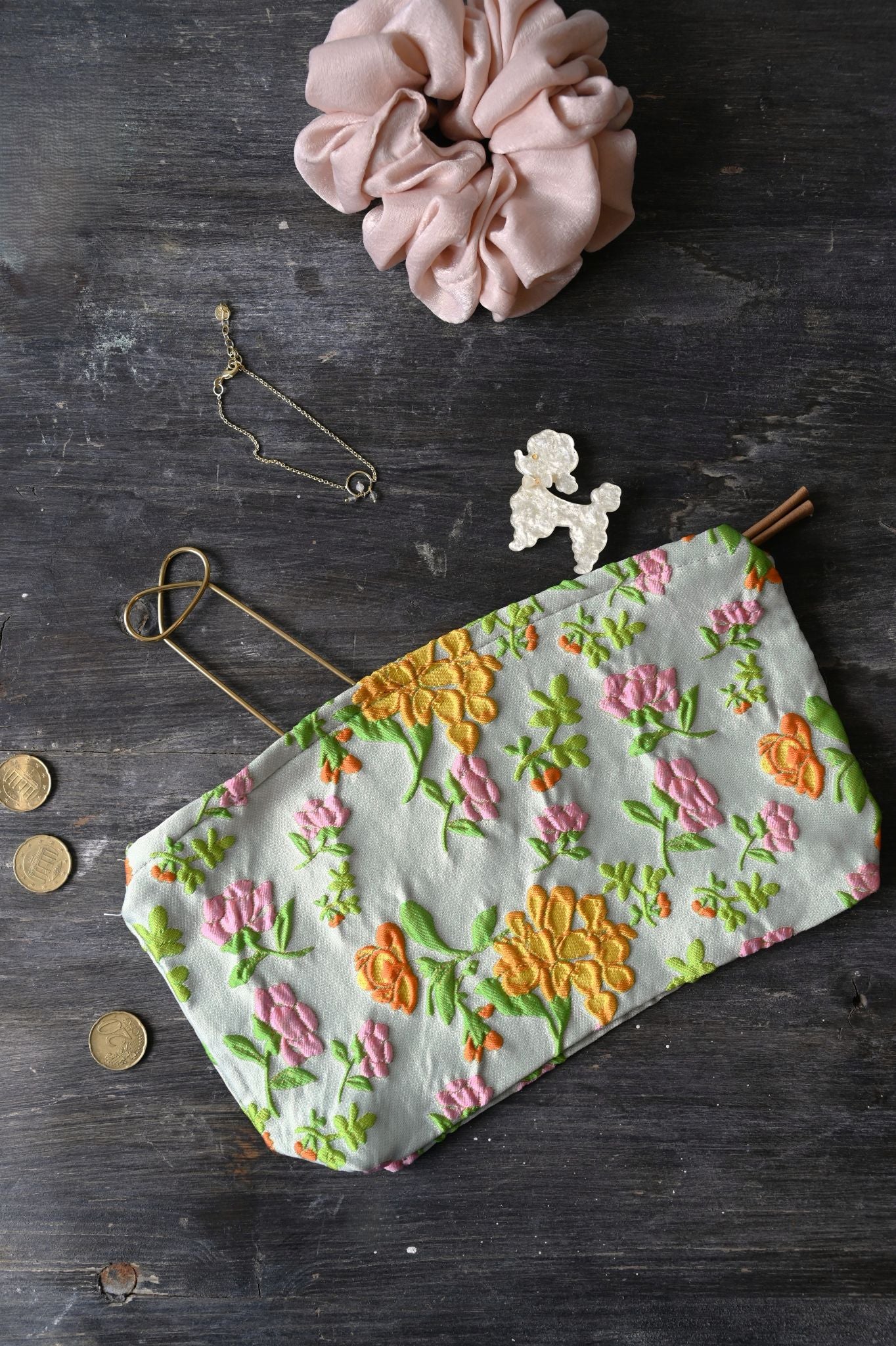 A limited edition luxury cosmetics bag in lemon yellow and mint green ditsy floral, easy to pack and lightweight for your holiday or for elevating everyday use. It has a silky feel to it and a classic floral pattern - you won't find another travel pouch like this!