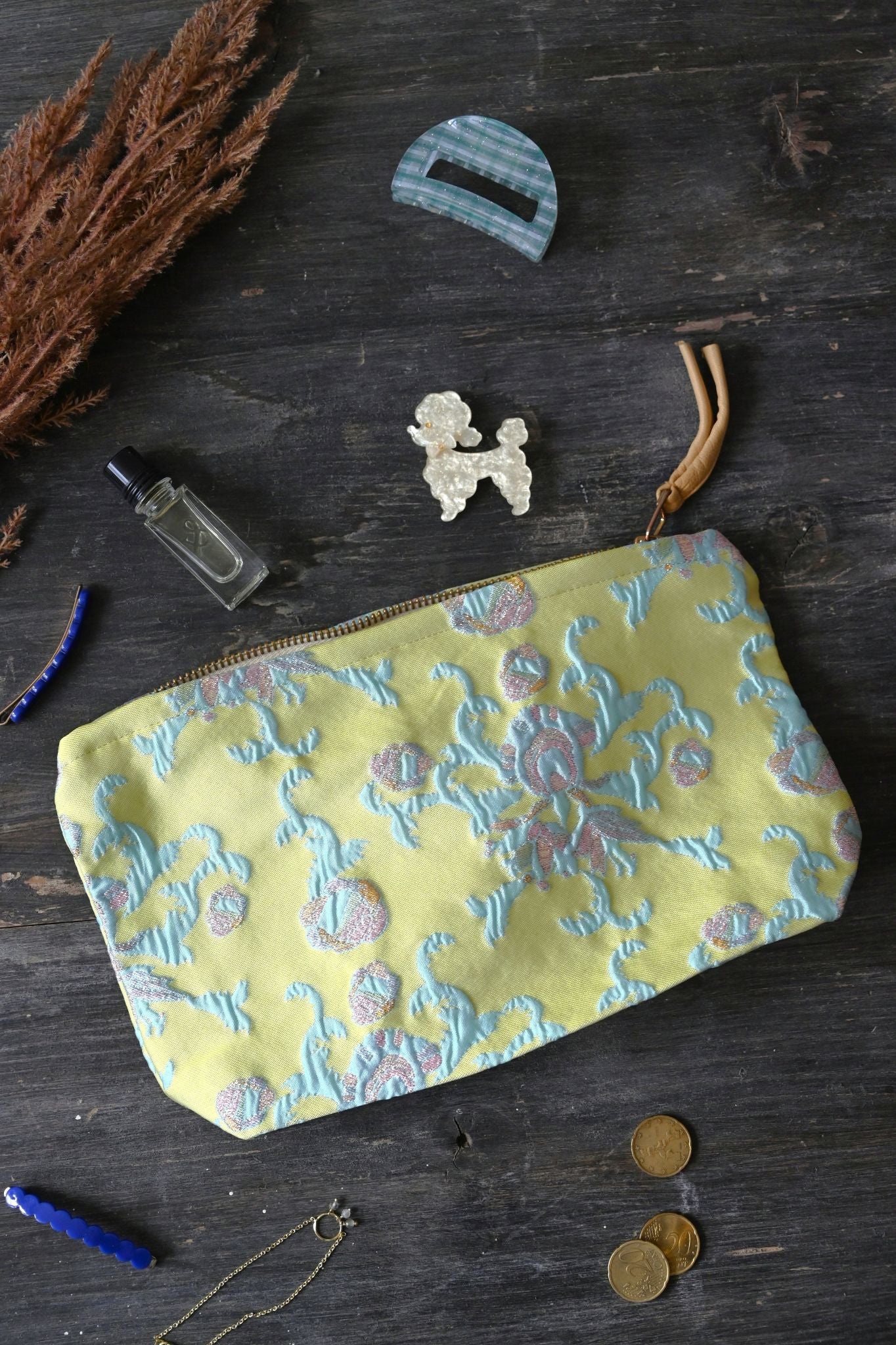 A lemon yellow large travel bag made from a machine washable silk alternative with a raised embroidered filigree design that reminds us of classic Georgian fashions and Bridgerton-style homewares.