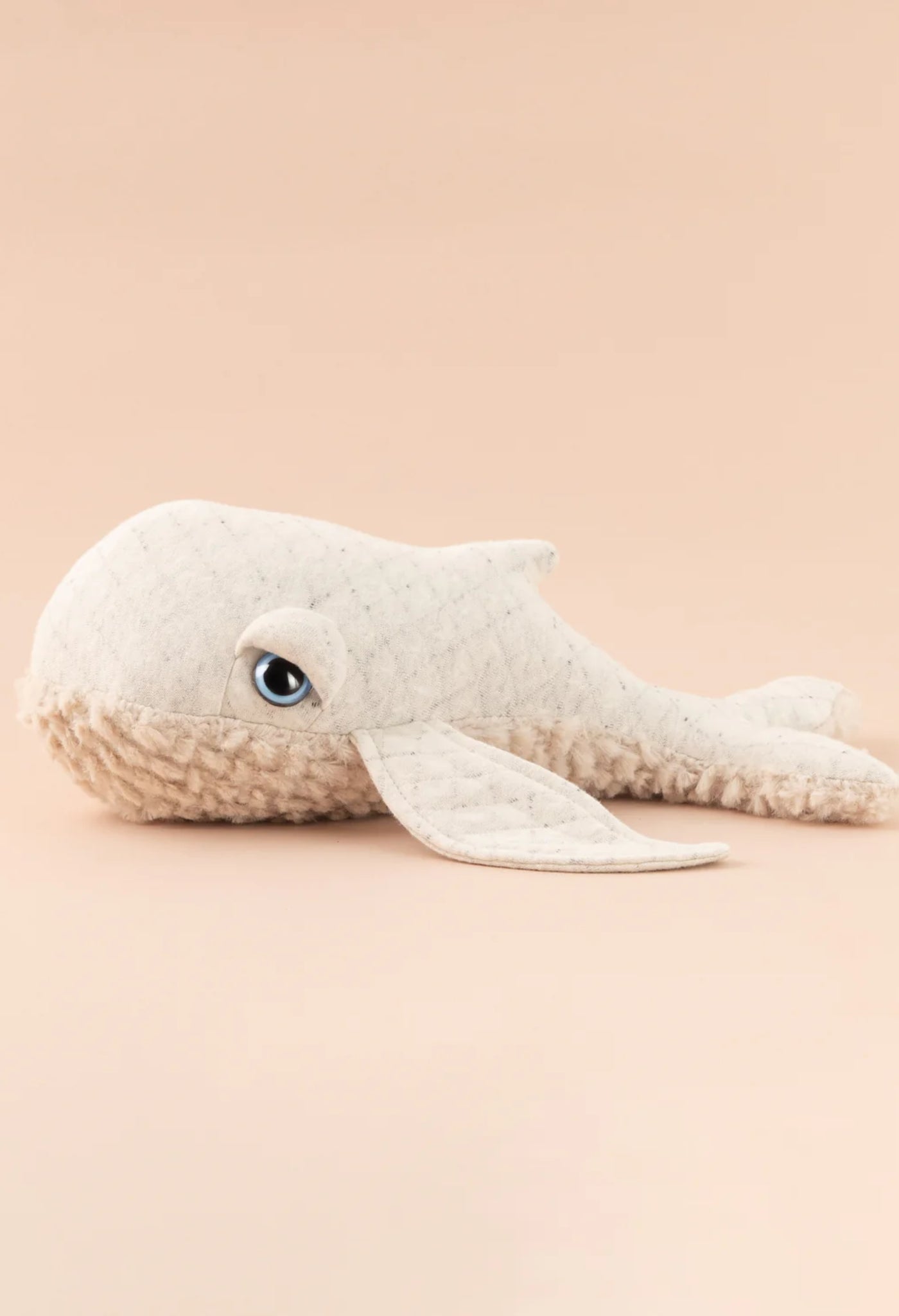 Rencontrez Mini Albino Whale, un guide douillet et câlin pour les aventures sous-marines de votre tout-petit.