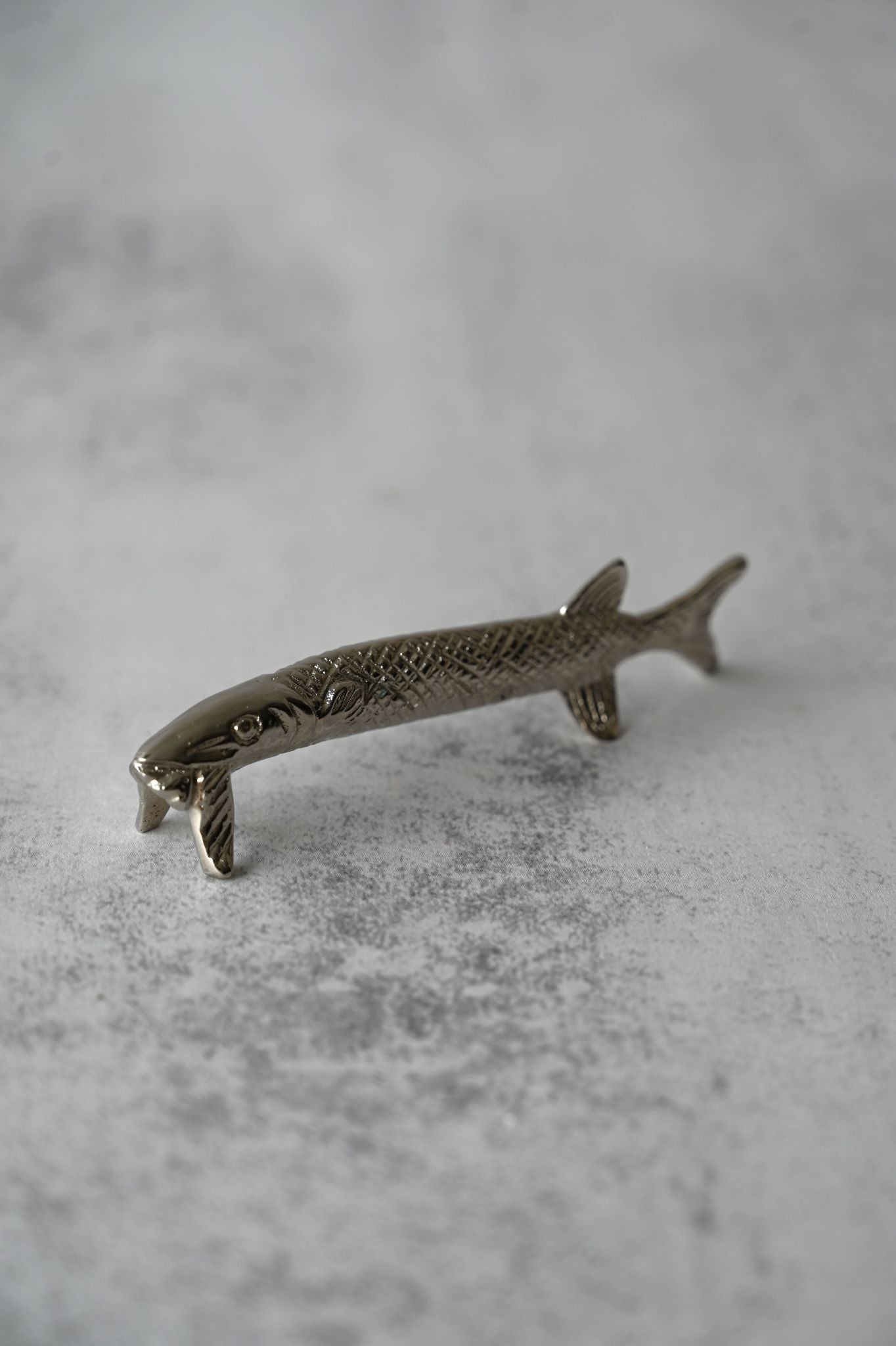 Fabriqué en étain lourd et en forme de poisson dans la nature, placez votre couteau de table ou votre cuillère à mélanger sur ce porte-couteau à écailles brillantes avec ses nageoires réalistes et sa queue incurvée et oscillante.