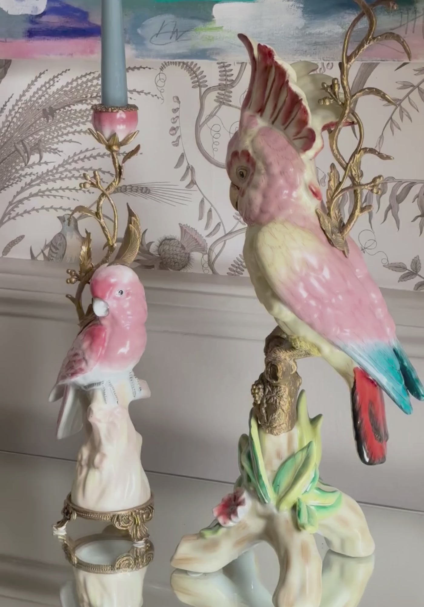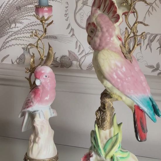 Exotiques et richement décorés, ces bougeoirs en forme d'oiseaux tropicaux sont fabriqués à la main par des céramistes experts avec d'immenses détails, des plumes en relief au bec arrondi. Tellement réalistes que l'on s'attendrait presque à ce que ces perroquets de Bourke battent leurs ailes décorées et émettent un petit gazouillis en signe d'appréciation de leur propre beauté. Chacun est perché sur un support en céramique sculpté avec des branches entrelacées d'or comme un jardin paradisiaque secret.