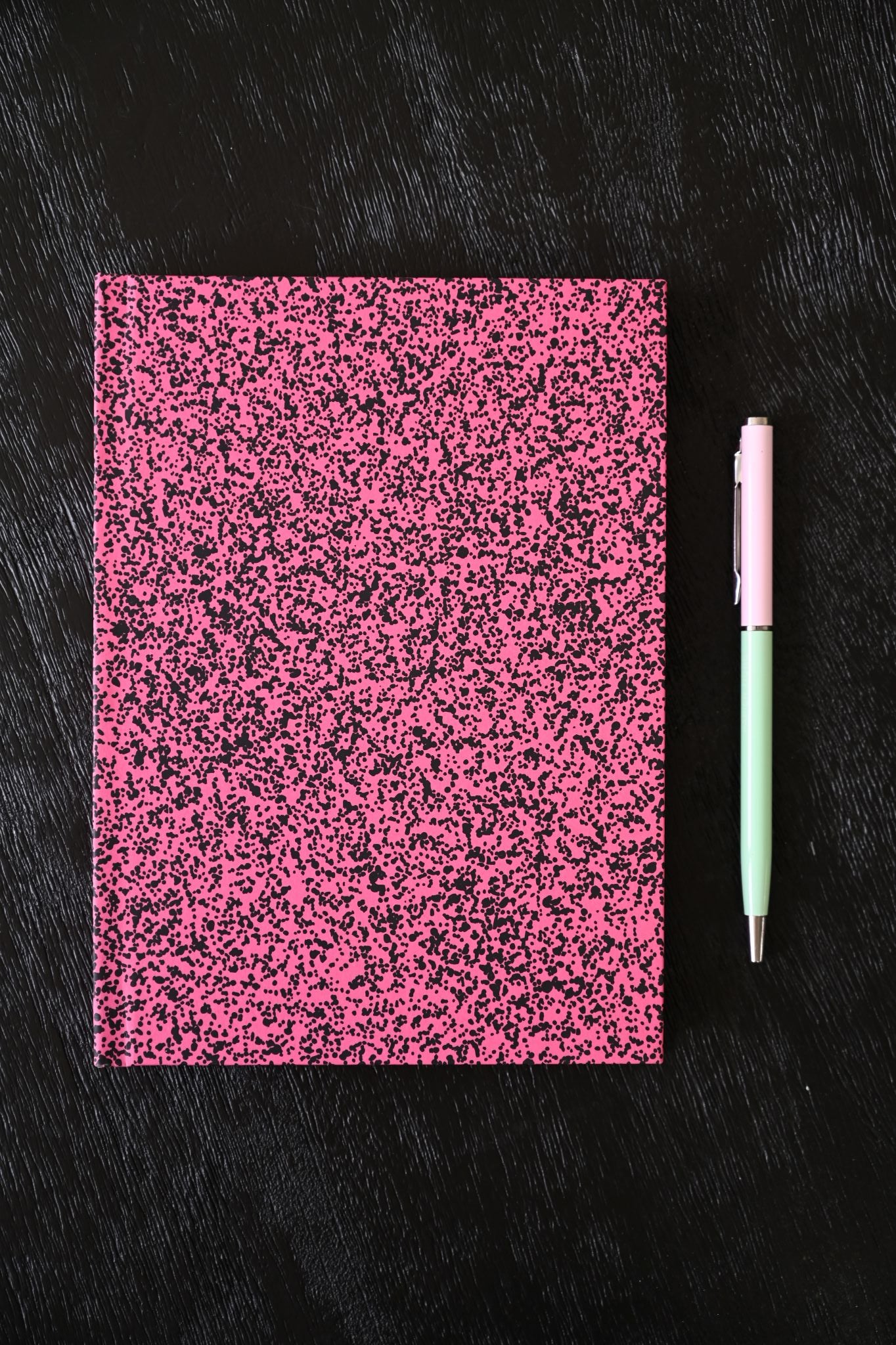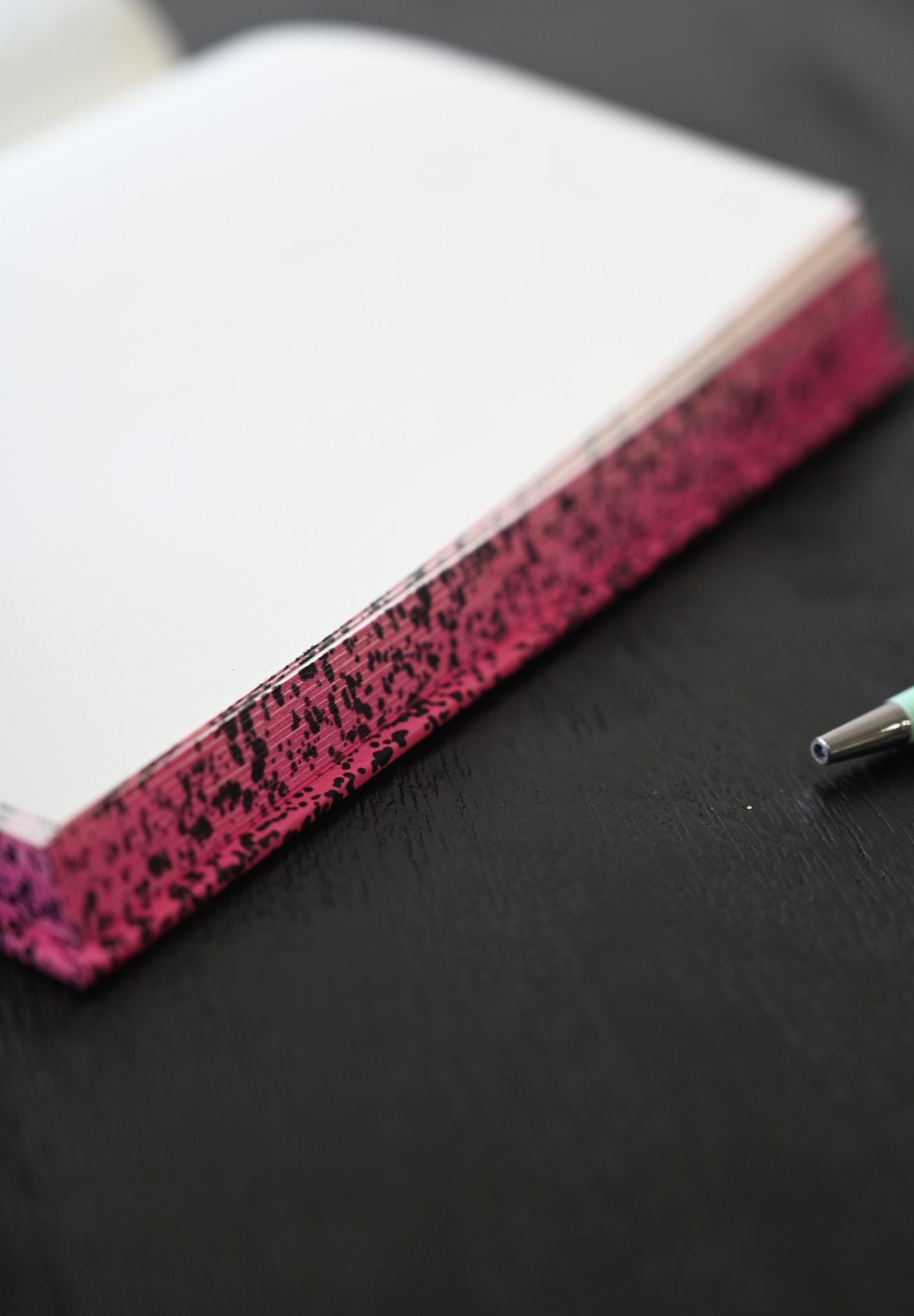 A chunky notebook in an electric magenta hue with a graphic splash print all over the cover, spine and reverse. Fill the blank pages of this journal with everything you've learned at school or make it your daily affirmations book.