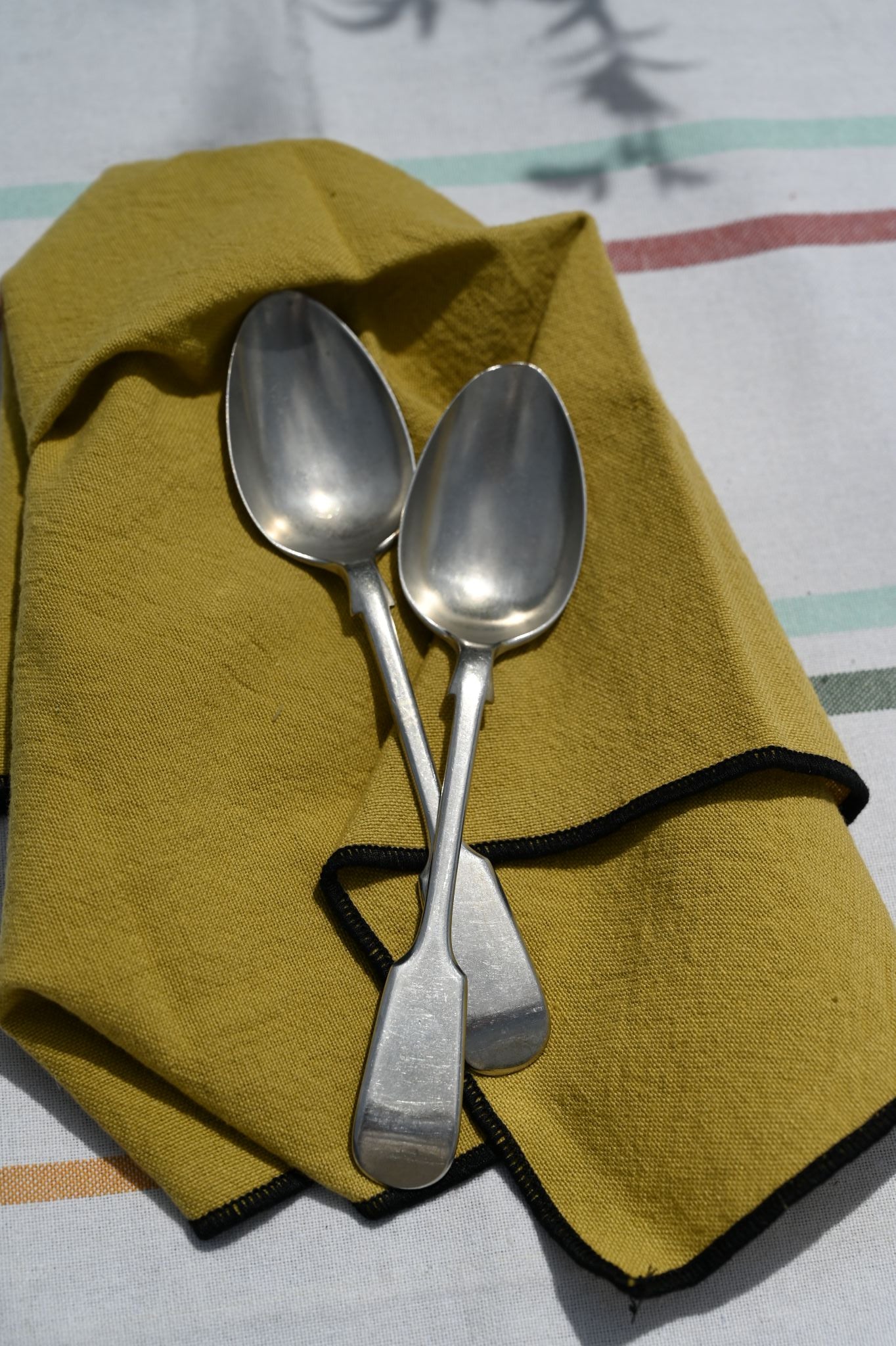 A set of silver spoons marked with Nevada which we believe was made by Daniel & Arter's Globe Nevada Silver Works in Birmingham. This set of two spoons have a fleur de lis style detail on the top just below the base and a flat based handle.