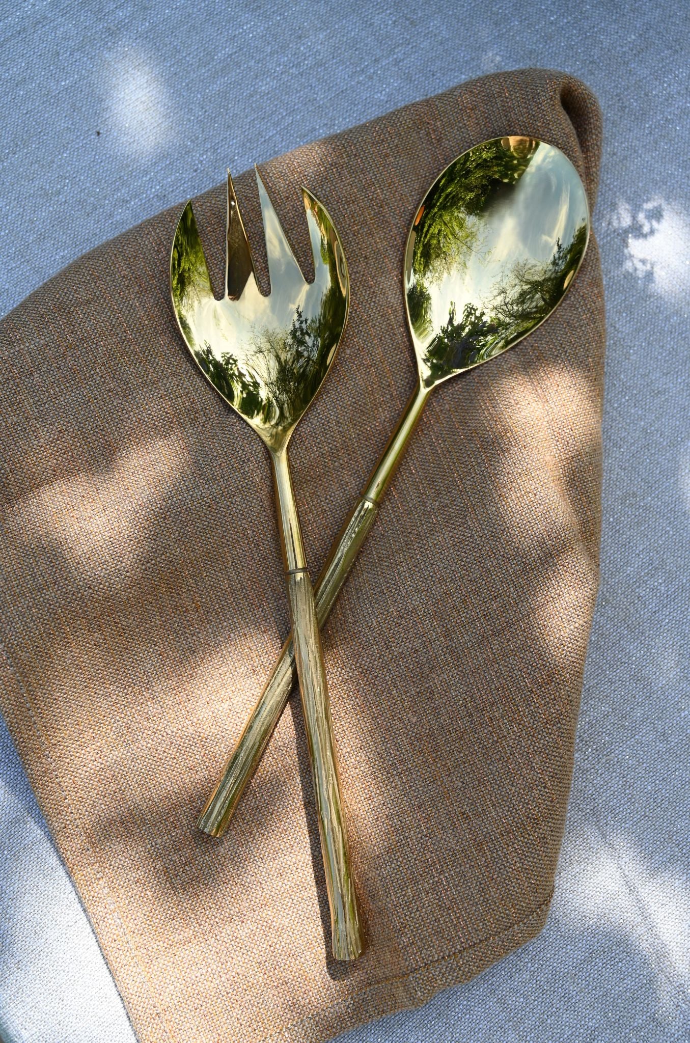 Lot de deux couverts à salade en forme de branche rainurée dorée