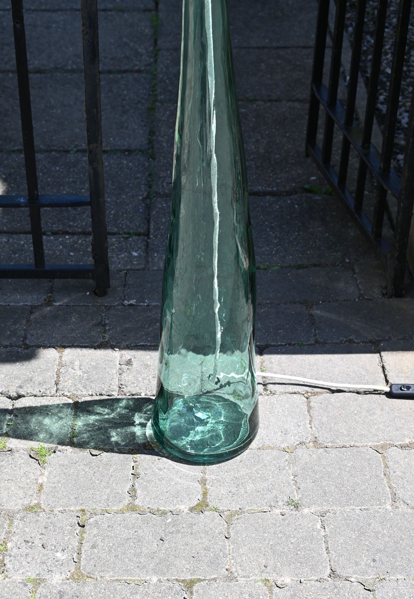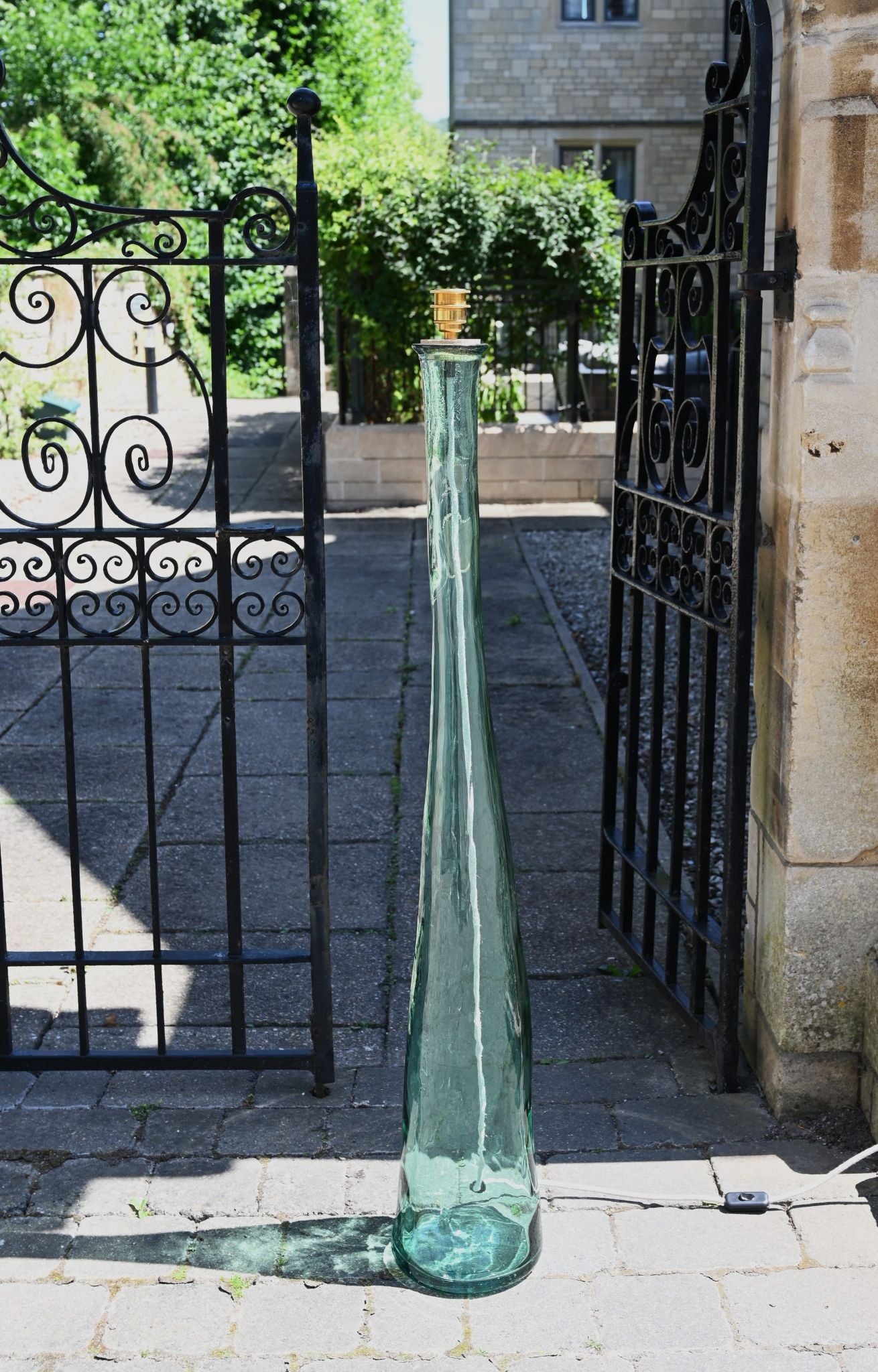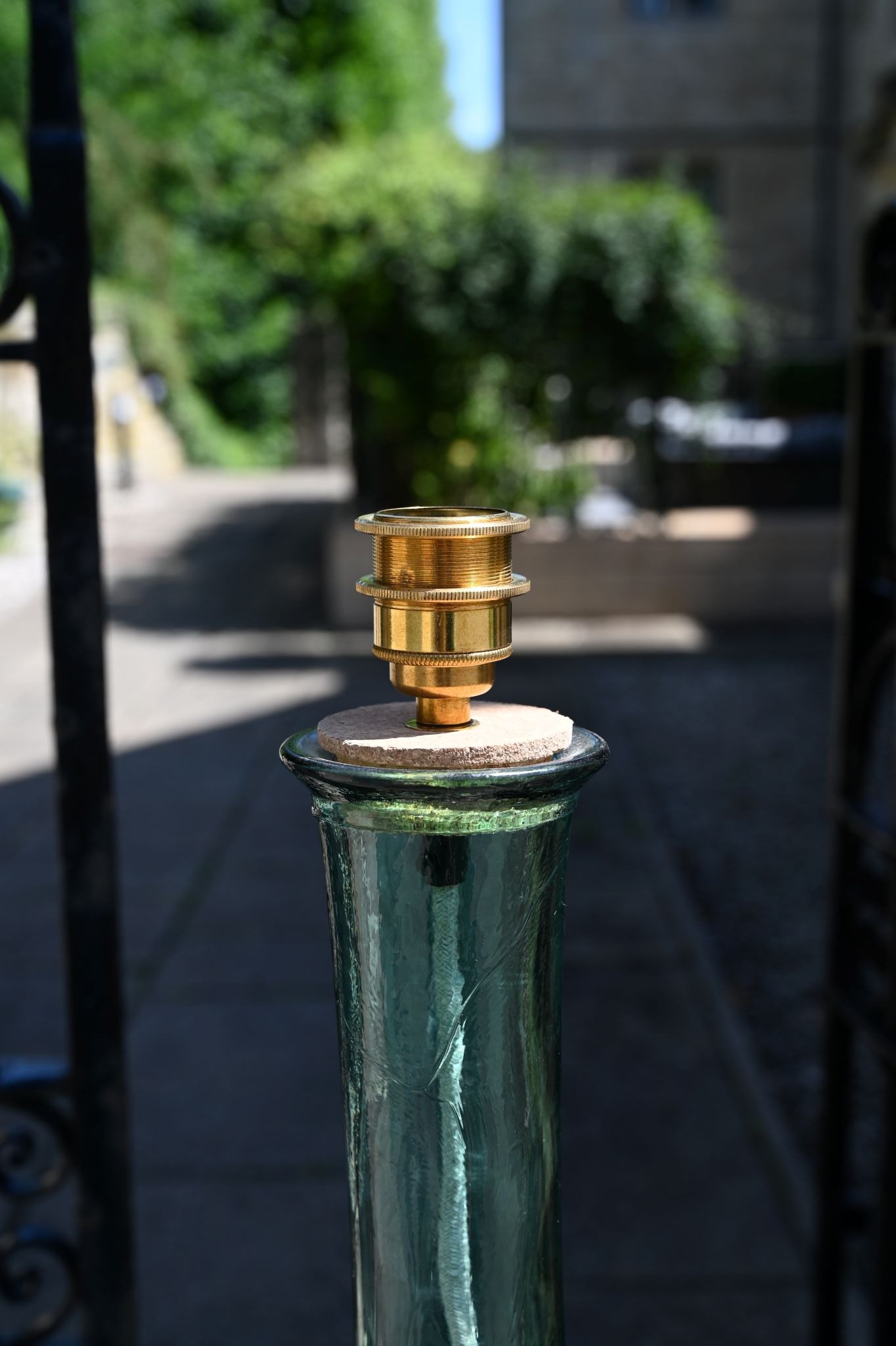 A jewel-like pale green bottle style glass lamp base made in Spain using 100% recycled glass and then assembled in England by specialists who fit each element by hand. The satisfyingly organic shape and finish of the lamp makes it feel like it's been uncovered from the ocean , it's finished with a brass bulb holder to maintain the luxurious feel of this handmade lamp.