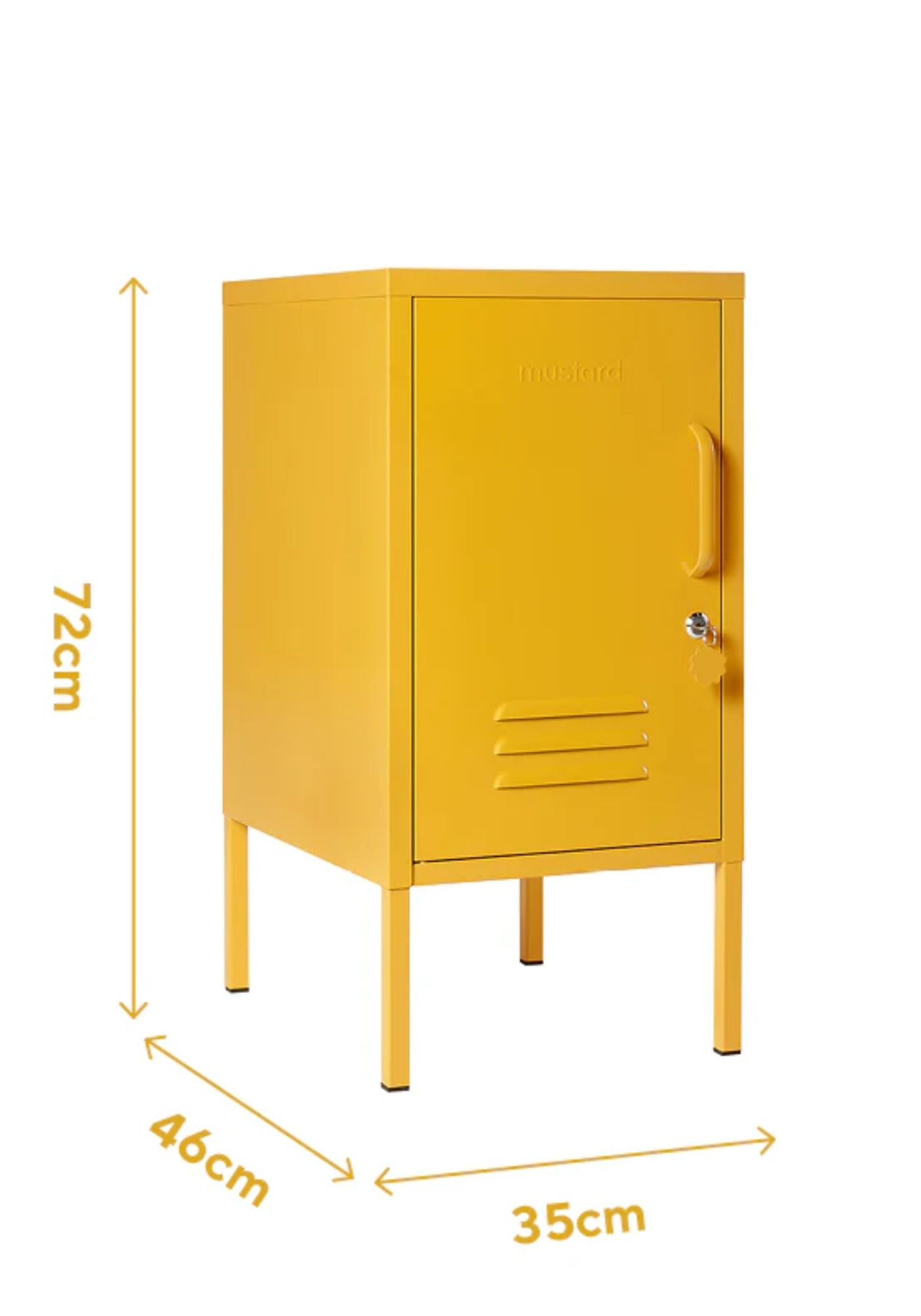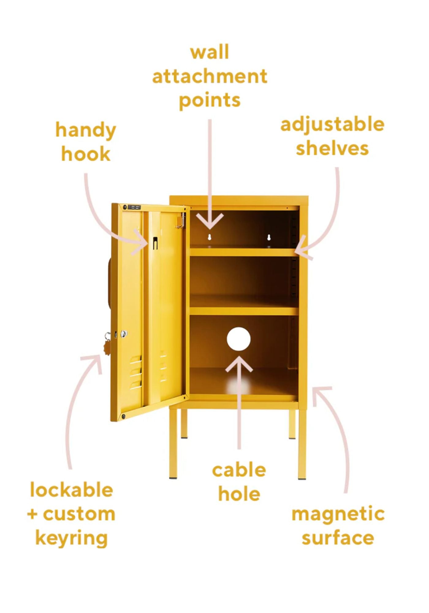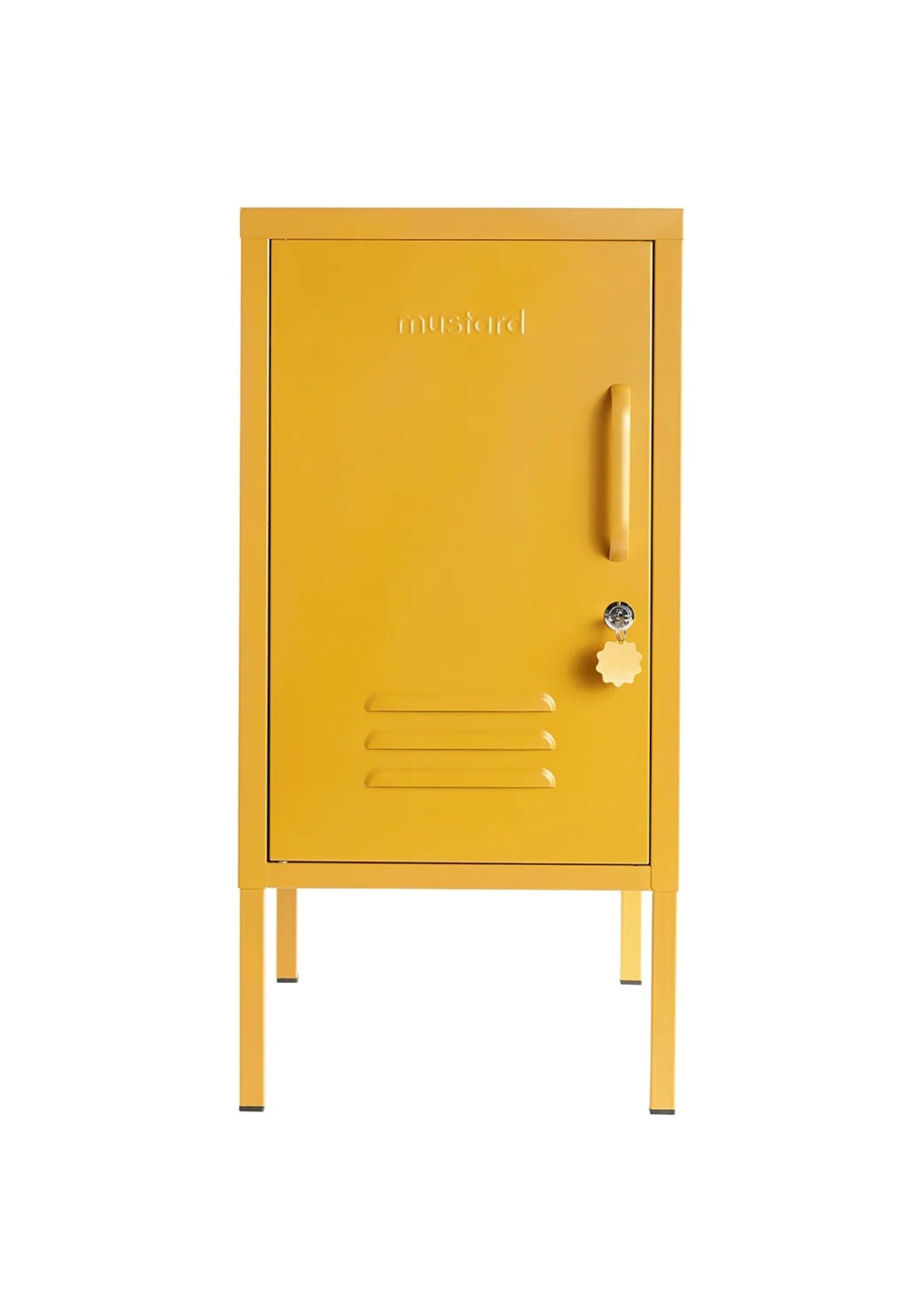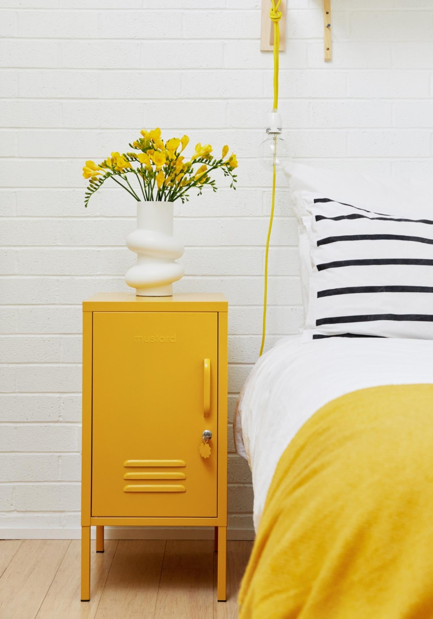 The Shorty is the supporting actor your interior needs! A mustard yellow metal bedside or sofa side table by cult favourite Mustard Made inspired by the school lockers we had as kids - but now in a cute compact size and with cable holes inside for charging your phone overnight but nicely out of reach!