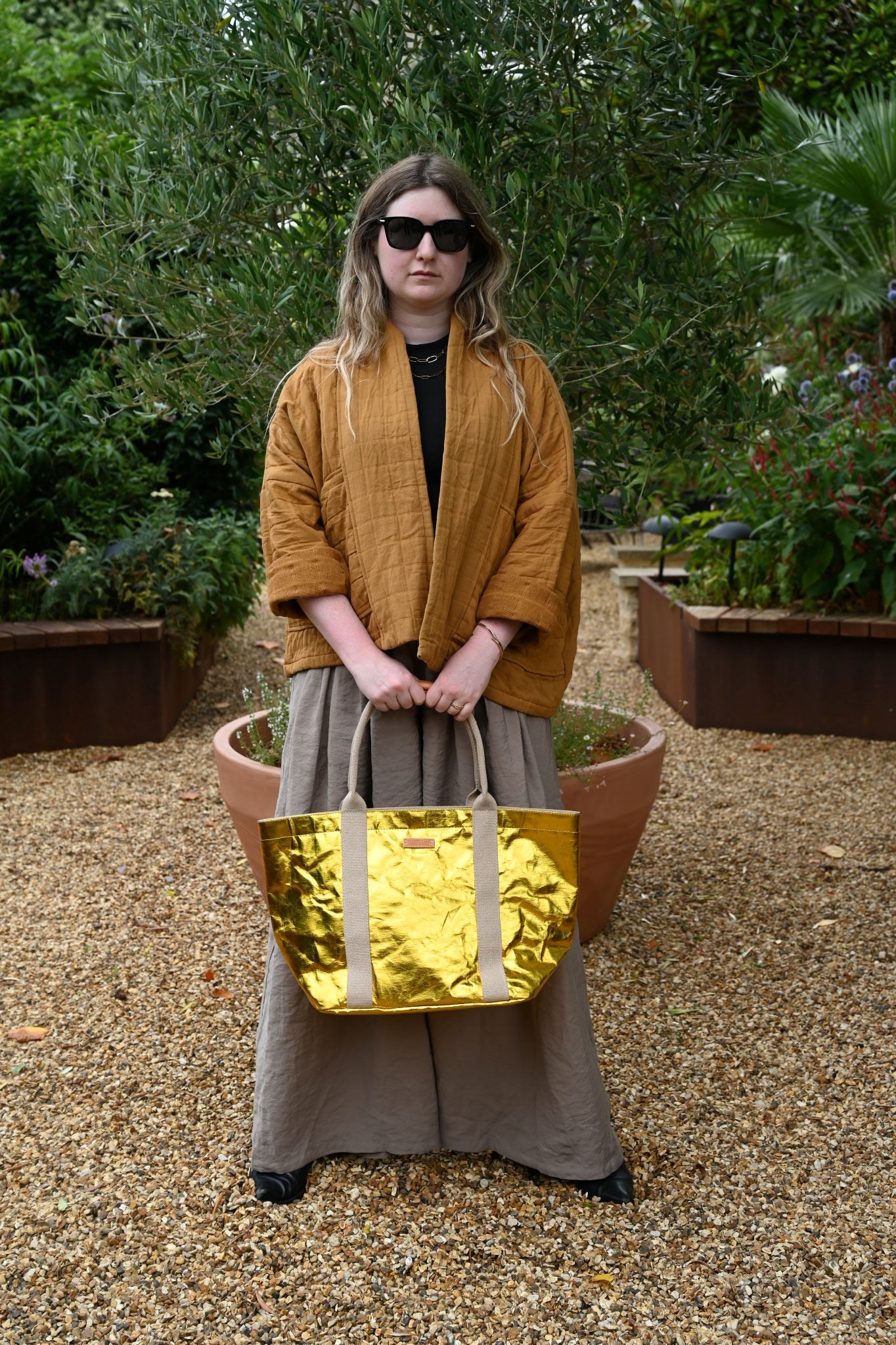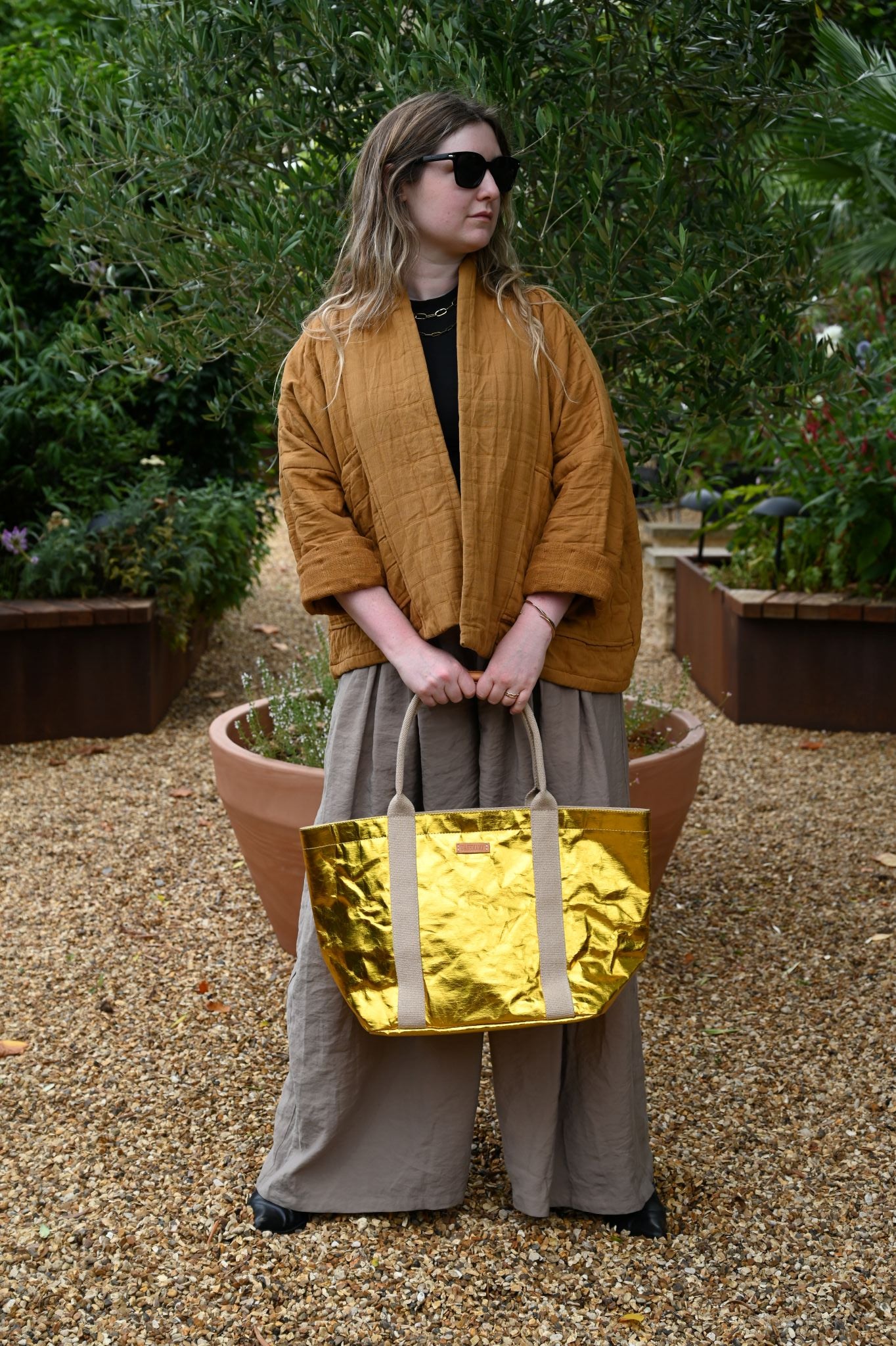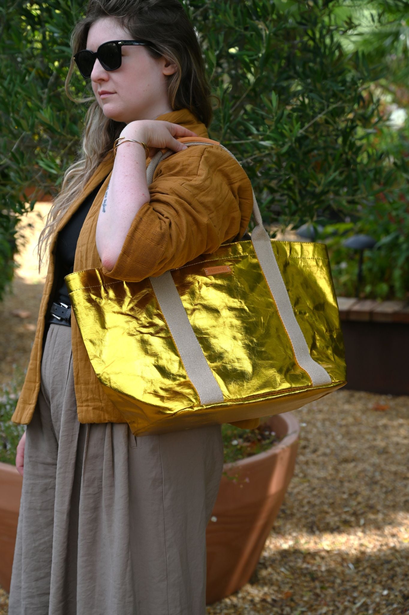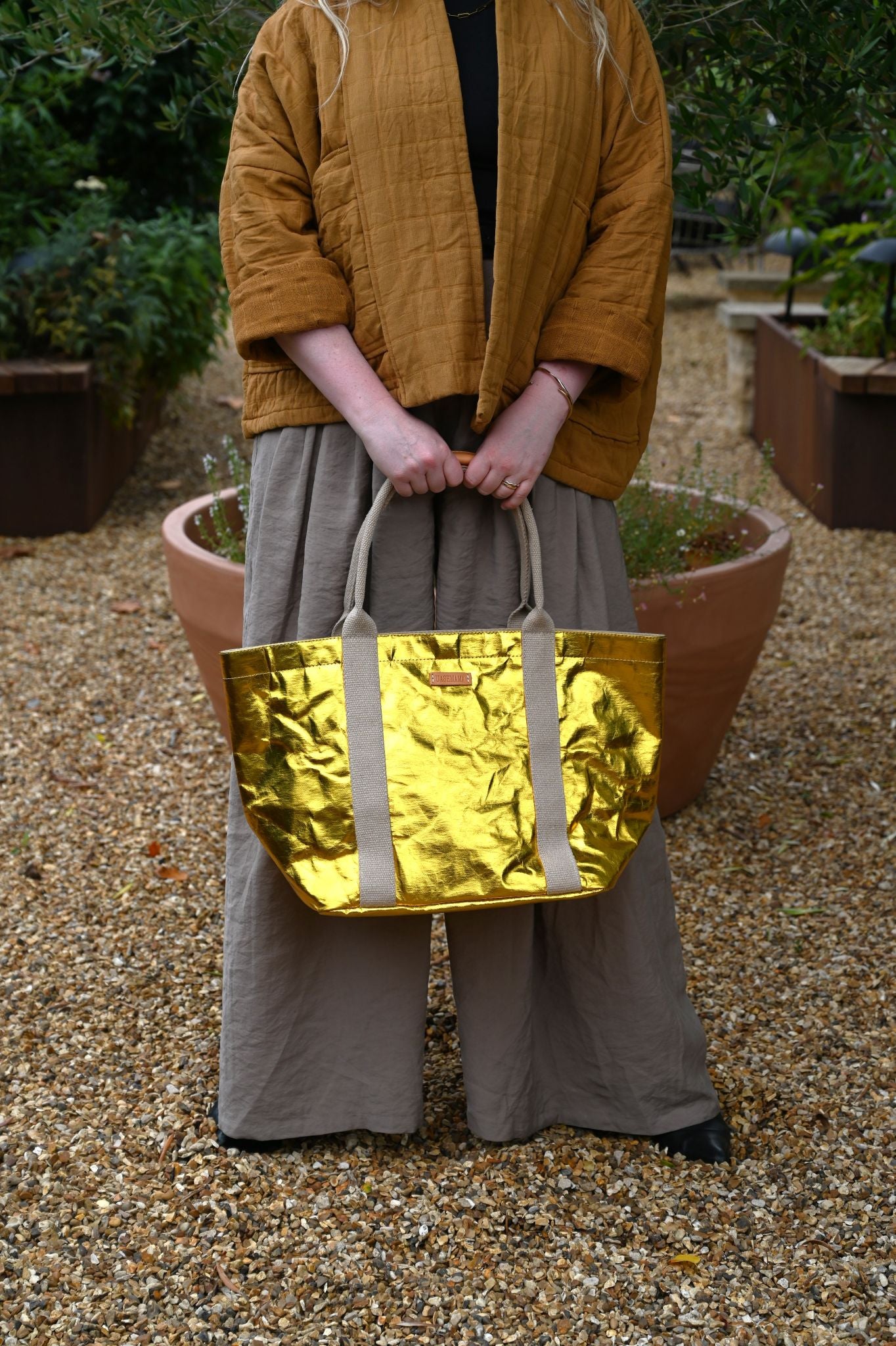 This big bright yellow gold tote looks like it's made from leather but it's actually a high quality, washable paper using a sustainable manufacture and dying process with a zippered inner and magnetic closure. An ideal alternative for eco-friendly shoppers or vegans.