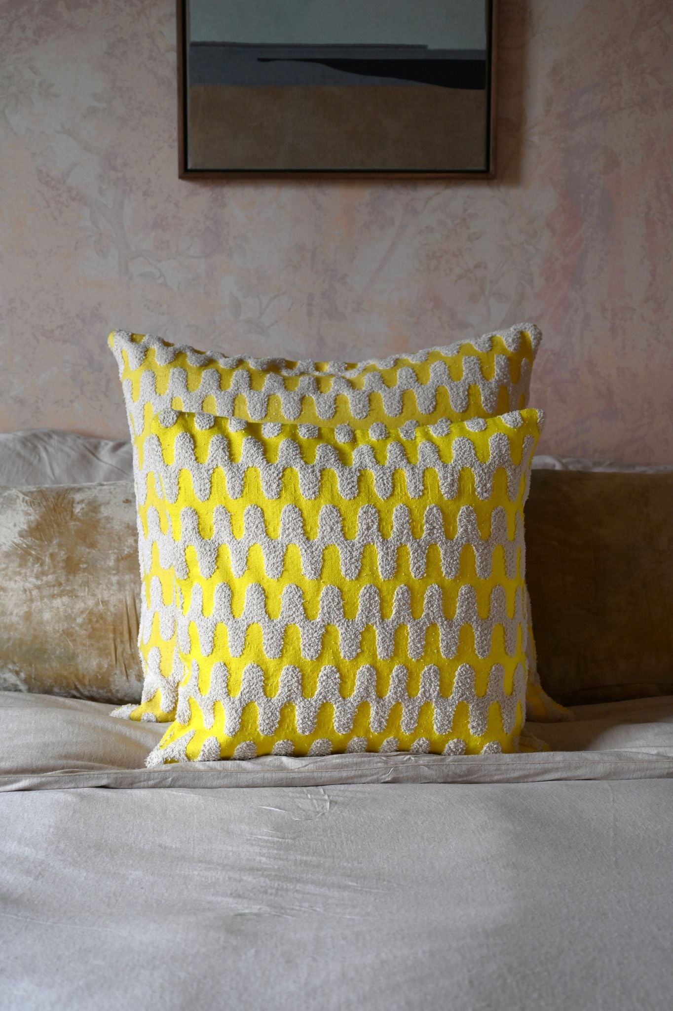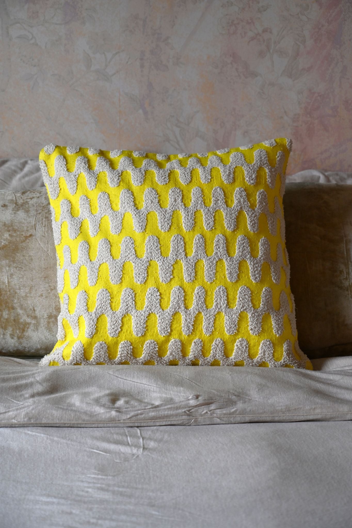 A founders favourite, this electric cushion collection would look laidback-cool in a sixties inspired home office or music library with its cream zigzag pattern that reminds us of a jazz style beat, tufted to stand out against the neon yellow backdrop.