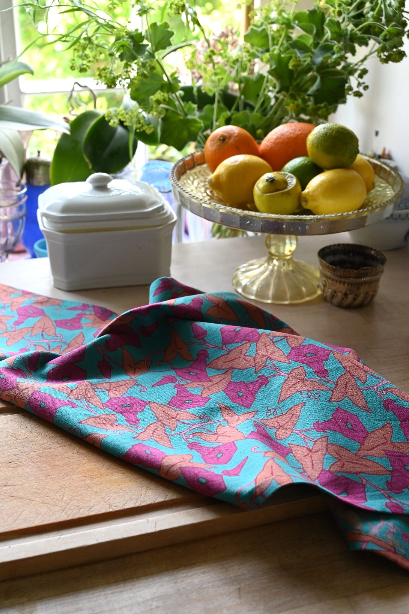 A seriously vibrant printed tea towel so colourful and full of joy that it could even make washing up and drying feel like fun. This tea towel is made in France from 100% OEKO TEX standard organic cotton, printed with a pattern of hot pink and orange tropical bell plants and vines on a turquoise blue backdrop.