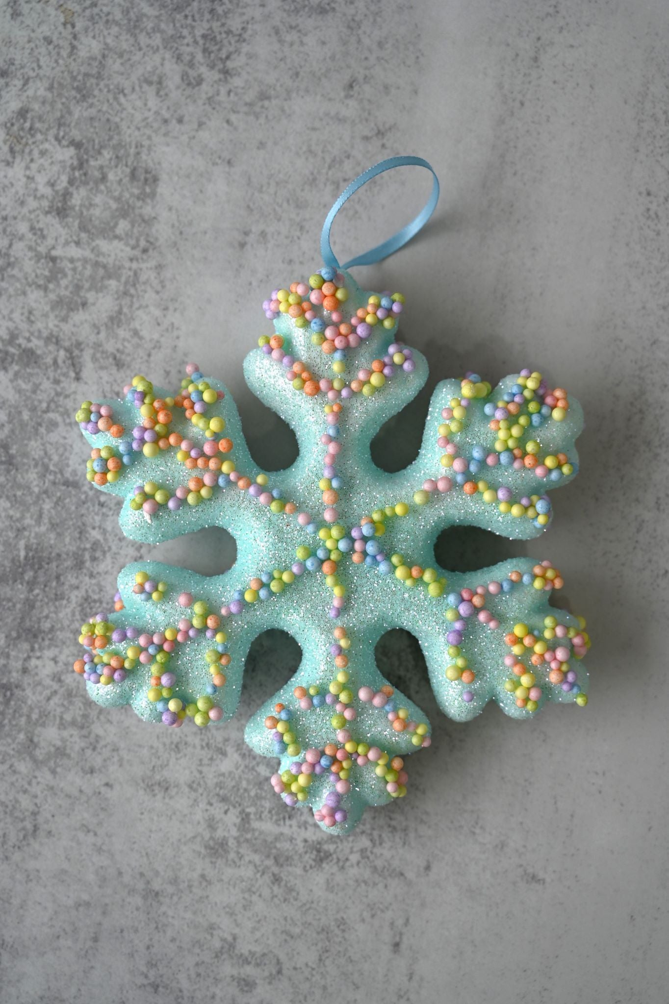 As unique as a snowflake, each of these giant snowy decorations is made from lightweight foam with an icy blue glitter finish and dipped in faux sprinkles.