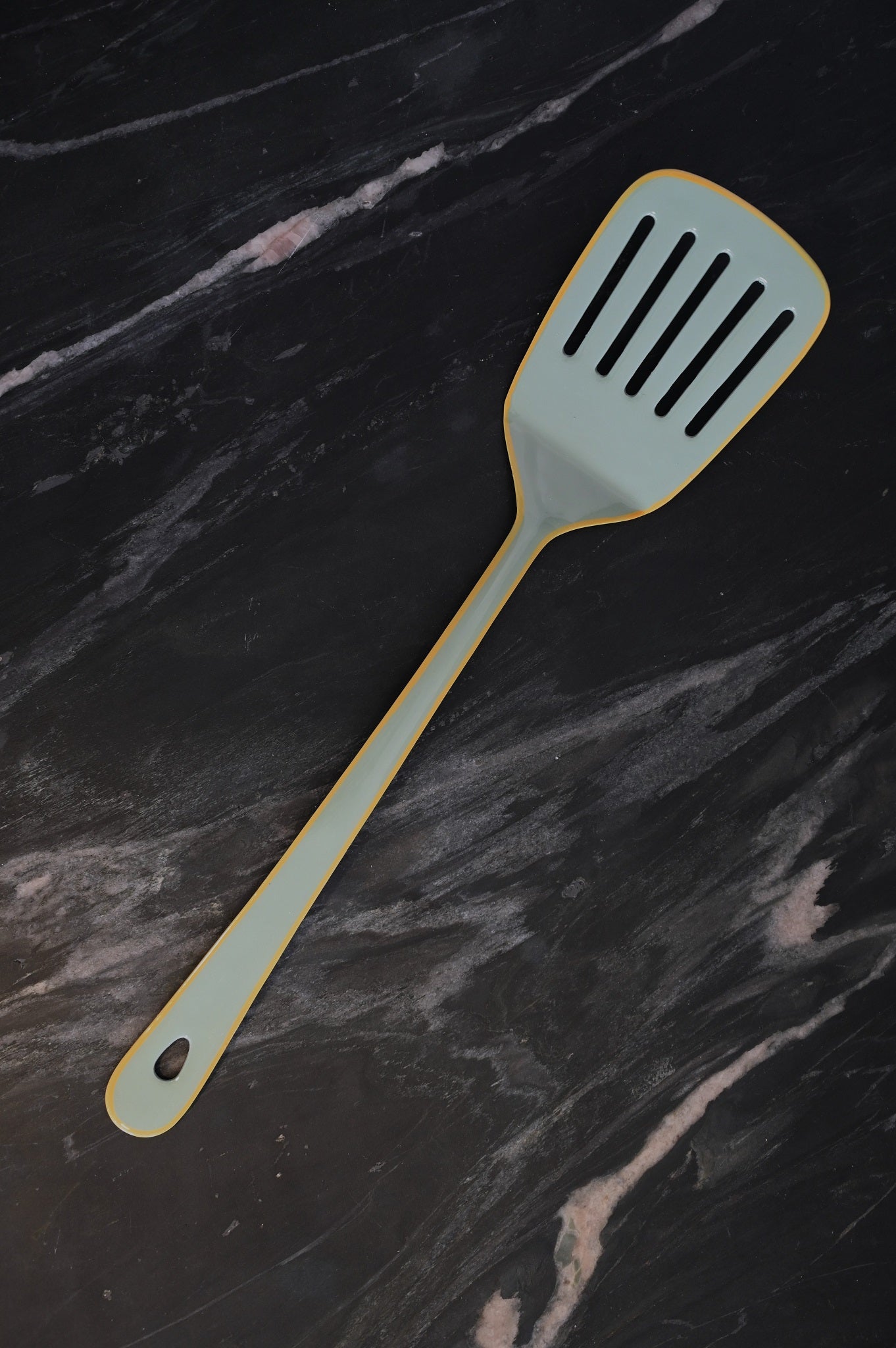 A burst of colour for everyday family meals in your kitchen, this vibrant spatula is inspired by vintage enamelware, made from modern stainless steel in berry blue with a lemon yellow border.