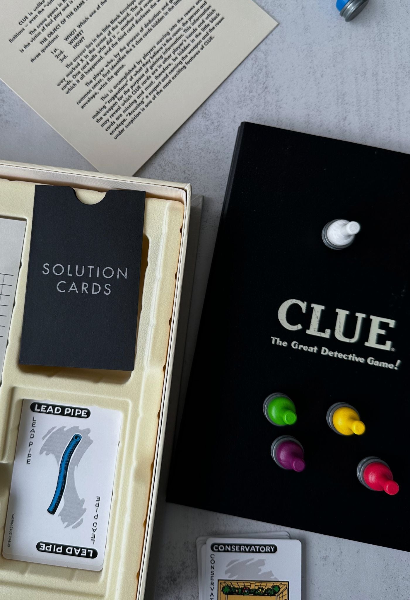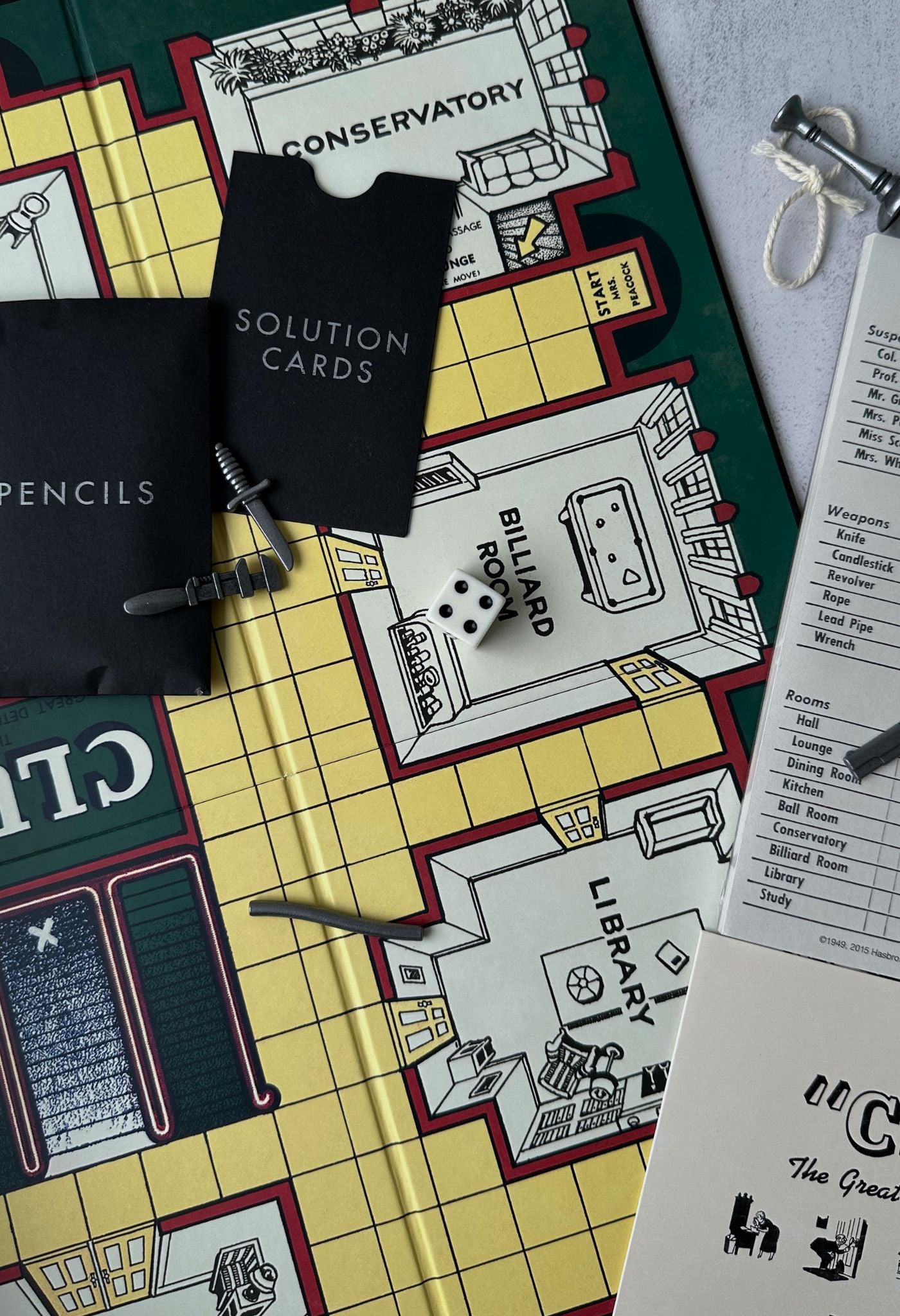 Set includes folding board, cards, wood tokens with die-cast bases, die-cast weapons, a pad of detective notes and 6 pencils.