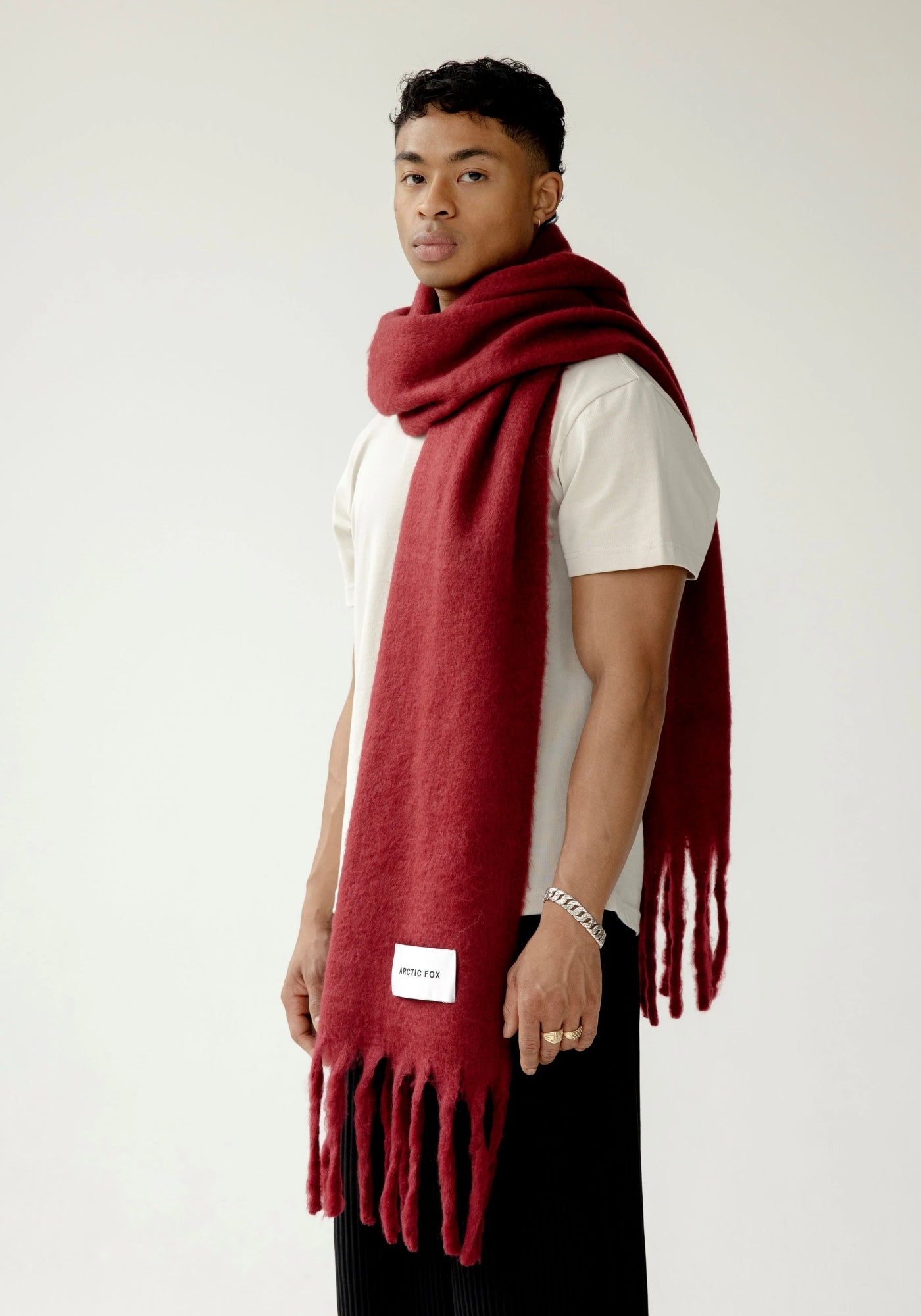 Get super cosy in this winter cranberry red extra-large scarf, made from 100% recycled materials with fringed edges and adorned with the signature Arctic Fox patch. These gorgeously cosy accessories have been brushed an incredible eight times (compared to the industry standard of four) to achieve the thickest, fluffiest texture possible to keep you cosy against arctic temperatures.